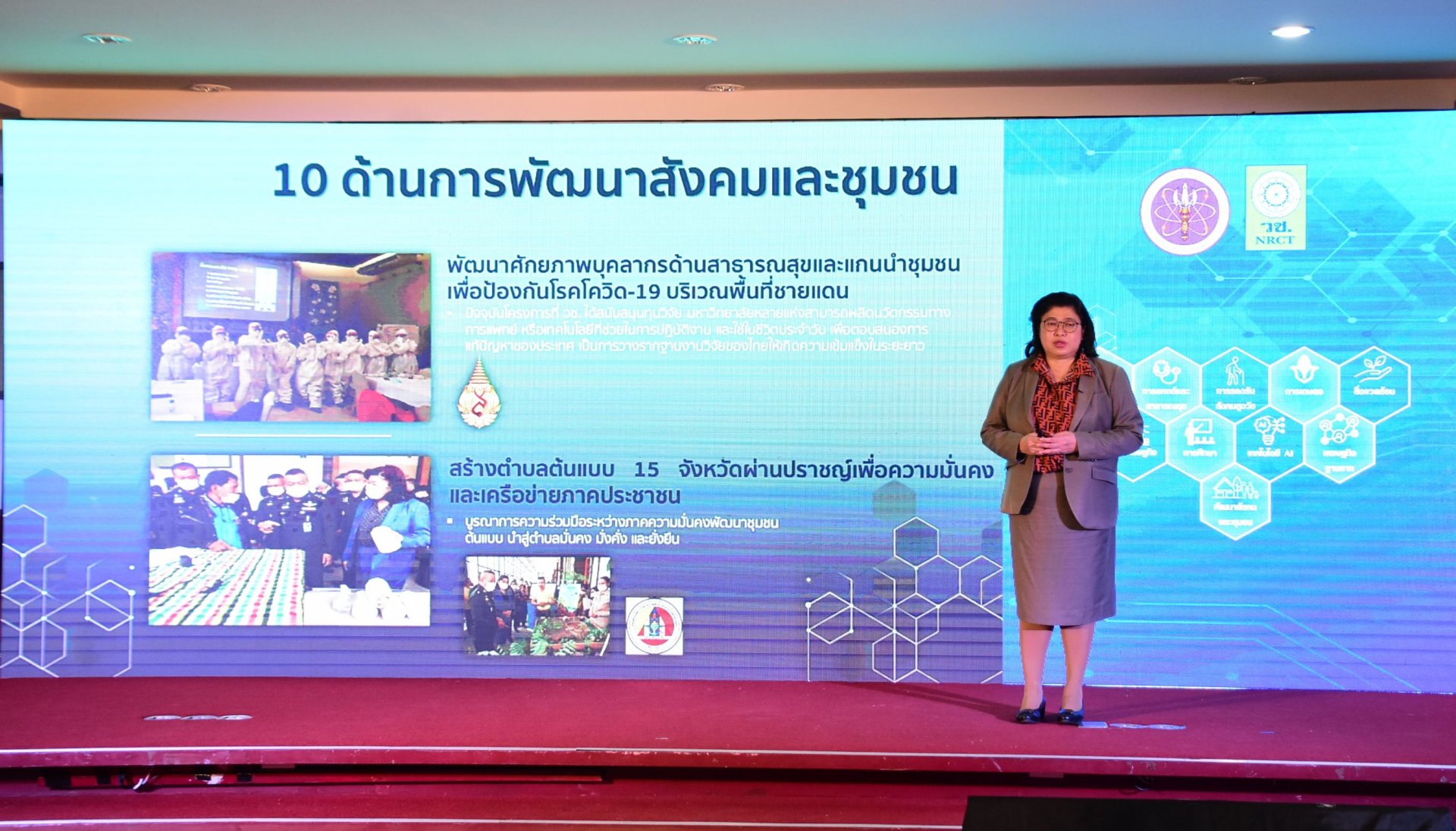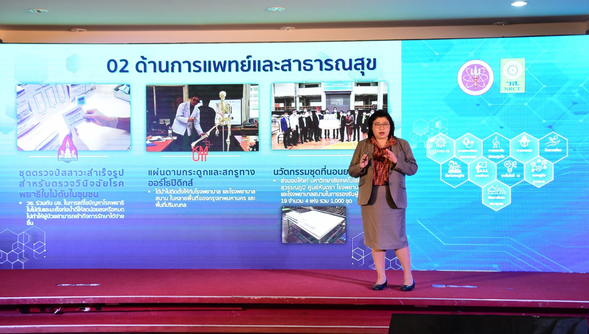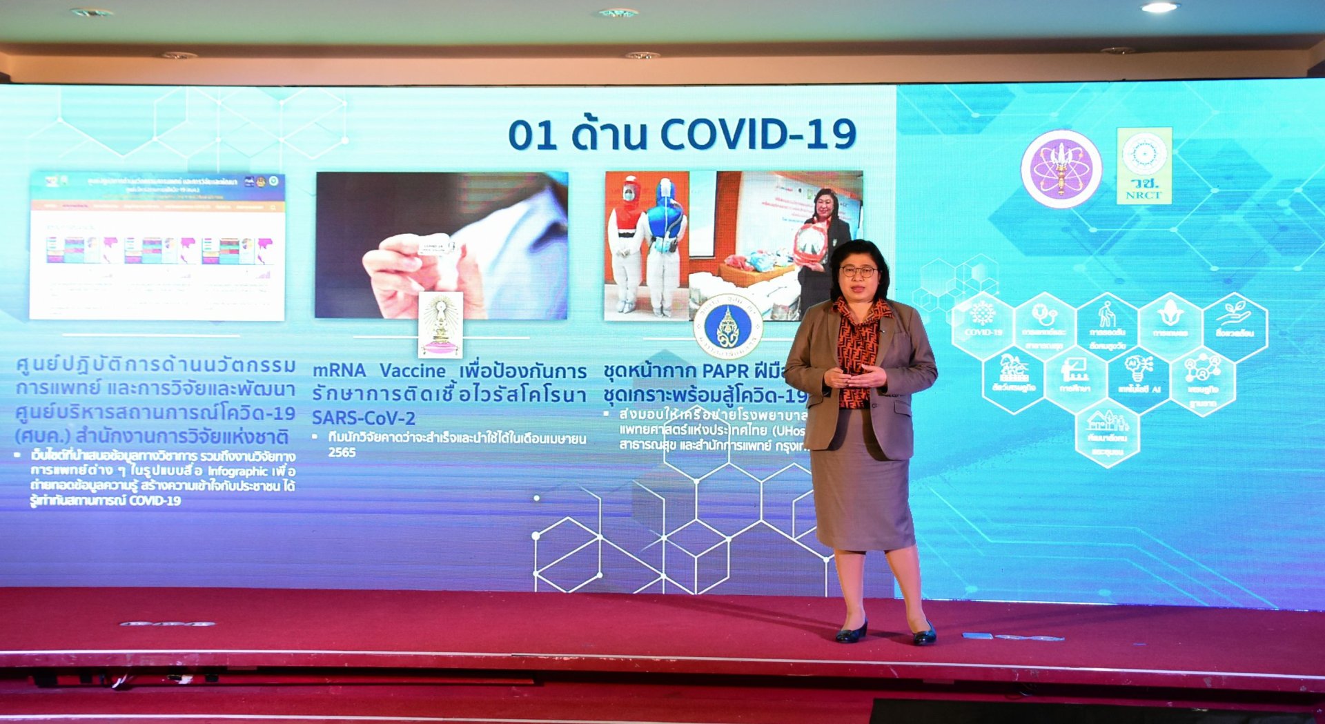 ดร.วิภารัตน์ ดีอ่อง ผู้อำนวยการสำนักงานการวิจัยแห่งชาติ นำเสนอผลงานวิจัยและนวัตกรรม ที่ วช. ให้การสนับสนุนจนสามารถนำไปต่อยอดและใช้ประโยชน์ได้อย่างเป็นรูปธรรม ในปี 2564 ชี้ให้เห็นว่า วช. ได้วางกรอบแนวทางบริหารจัดการทุนไว้อย่างชัดเจน ภายใต้แผนด้านวิทยาศาสตร์ วิจัยและนวัตกรรมของประเทศ ของกระทรวงการอุดมศึกษา วิทยาศาสตร์ วิจัยและนวัตกรรม (อว.) และเนื่องจากสภาวะการเปลี่ยนแปลงของโลก ปัญหาสิ่งแวดล้อมและโรคอุบัติใหม่ที่เกิดขึ้นของโรคโควิด -19 ที่แพร่ระบาดไปทั่วโลก โดยเฉพาะในช่วง 1-2 ปีที่ผ่านมานี้ ได้สนับสนุนการใช้งานวิจัยและนวัตกรรมฝีมือคนไทยที่เกี่ยวข้องกับสถานการณ์โควิด-19 ทั้งมิตินวัตกรรม และวิชาการ ตอบรับความต้องการของบุคลากรได้ถึง 3 เฟส ของการแพร่ระบาด และมีความก้าวหน้าเป็นไปตามมาตรฐานการวิจัย วช. จึงนำผลงานวิจัยและนวัตกรรมพร้อมใช้มาถ่ายทอดองค์ความรู้ ให้แก่สังคม เพื่อช่วยแก้ปัญหา สร้างโอกาสช่วยลดผลกระทบจากสถานการณ์ทั้งในปัจจุบันและภายหลังสถานการณ์การแพร่ระบาดของโรคโควิด -19