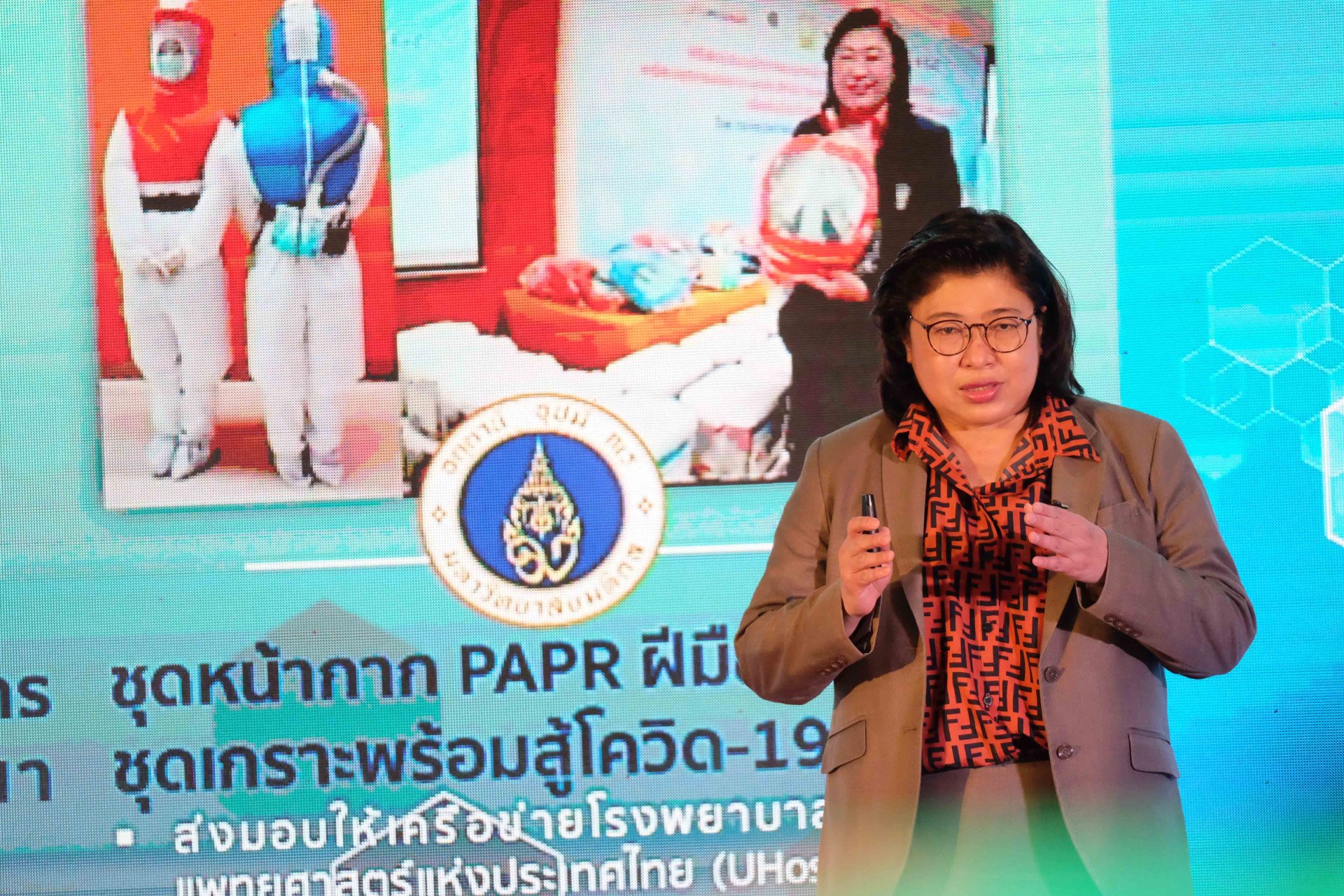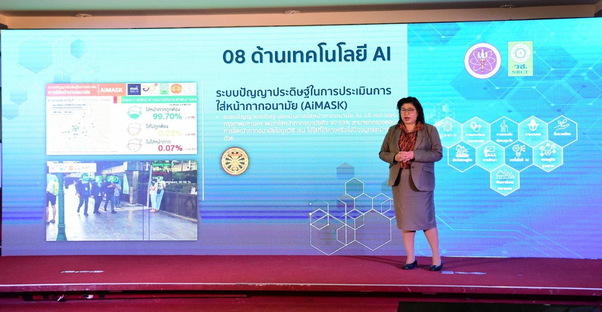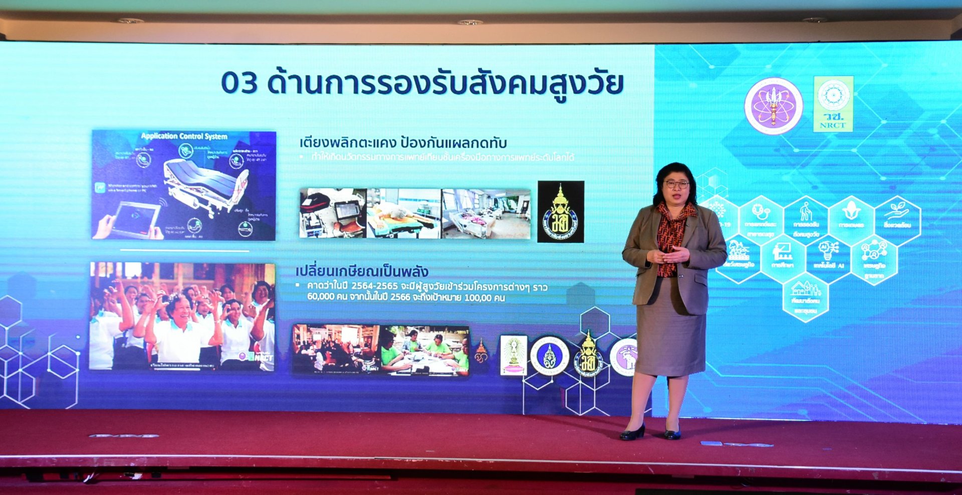 ดร.วิภารัตน์ ดีอ่อง ผู้อำนวยการสำนักงานการวิจัยแห่งชาติ นำเสนอผลงานวิจัยและนวัตกรรม ที่ วช. ให้การสนับสนุนจนสามารถนำไปต่อยอดและใช้ประโยชน์ได้อย่างเป็นรูปธรรม ในปี 2564 ชี้ให้เห็นว่า วช. ได้วางกรอบแนวทางบริหารจัดการทุนไว้อย่างชัดเจน ภายใต้แผนด้านวิทยาศาสตร์ วิจัยและนวัตกรรมของประเทศ ของกระทรวงการอุดมศึกษา วิทยาศาสตร์ วิจัยและนวัตกรรม (อว.) และเนื่องจากสภาวะการเปลี่ยนแปลงของโลก ปัญหาสิ่งแวดล้อมและโรคอุบัติใหม่ที่เกิดขึ้นของโรคโควิด -19 ที่แพร่ระบาดไปทั่วโลก โดยเฉพาะในช่วง 1-2 ปีที่ผ่านมานี้ ได้สนับสนุนการใช้งานวิจัยและนวัตกรรมฝีมือคนไทยที่เกี่ยวข้องกับสถานการณ์โควิด-19 ทั้งมิตินวัตกรรม และวิชาการ ตอบรับความต้องการของบุคลากรได้ถึง 3 เฟส ของการแพร่ระบาด และมีความก้าวหน้าเป็นไปตามมาตรฐานการวิจัย วช. จึงนำผลงานวิจัยและนวัตกรรมพร้อมใช้มาถ่ายทอดองค์ความรู้ ให้แก่สังคม เพื่อช่วยแก้ปัญหา สร้างโอกาสช่วยลดผลกระทบจากสถานการณ์ทั้งในปัจจุบันและภายหลังสถานการณ์การแพร่ระบาดของโรคโควิด -19