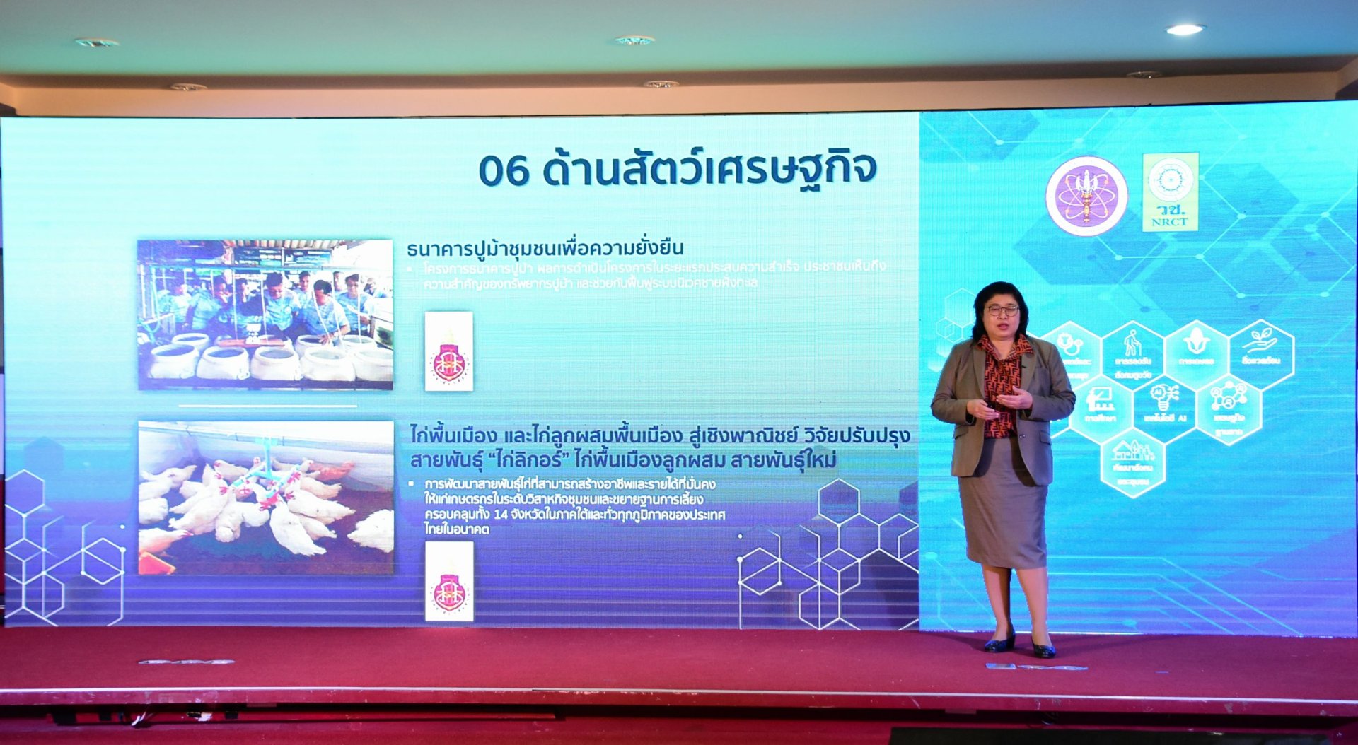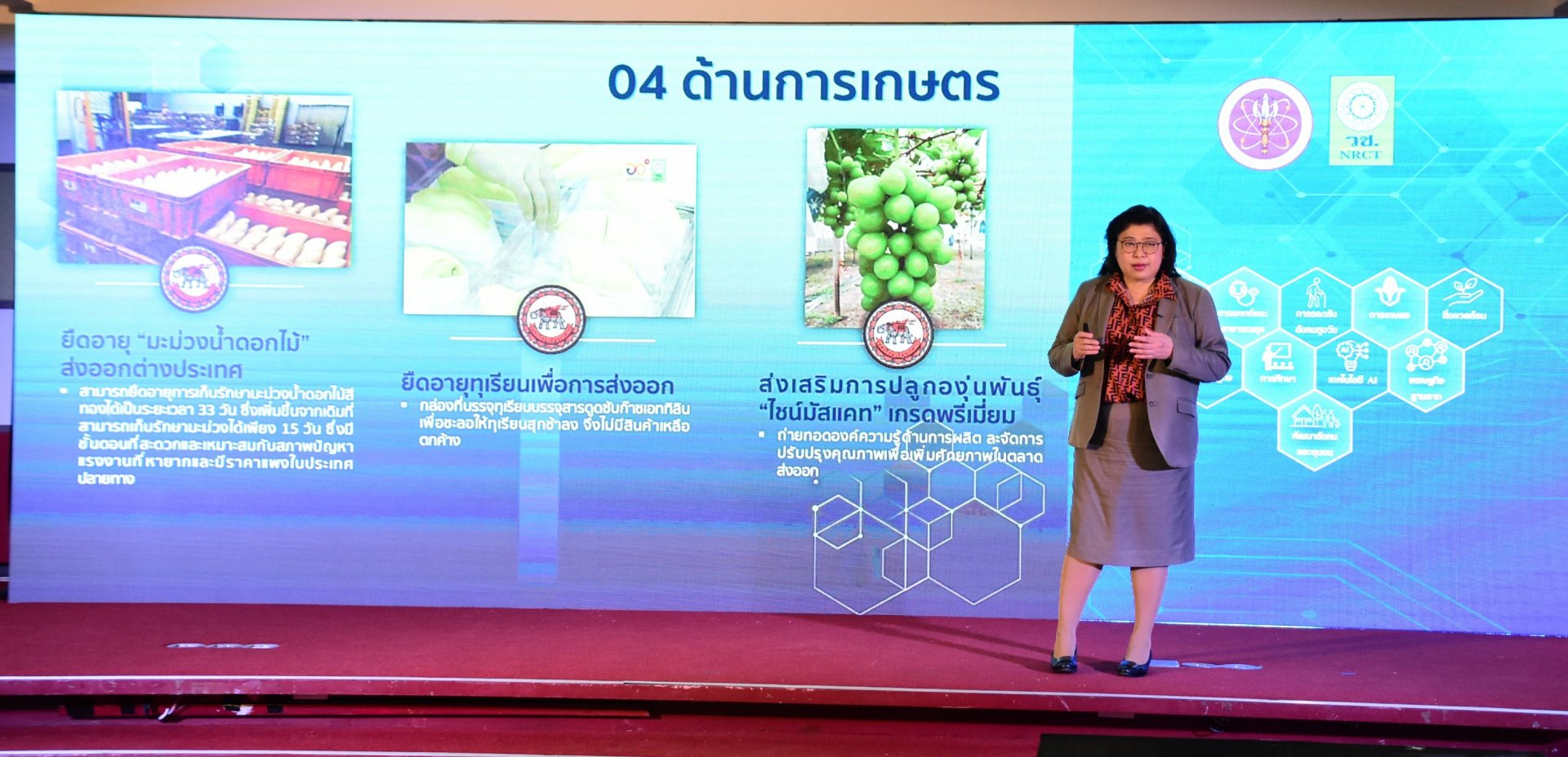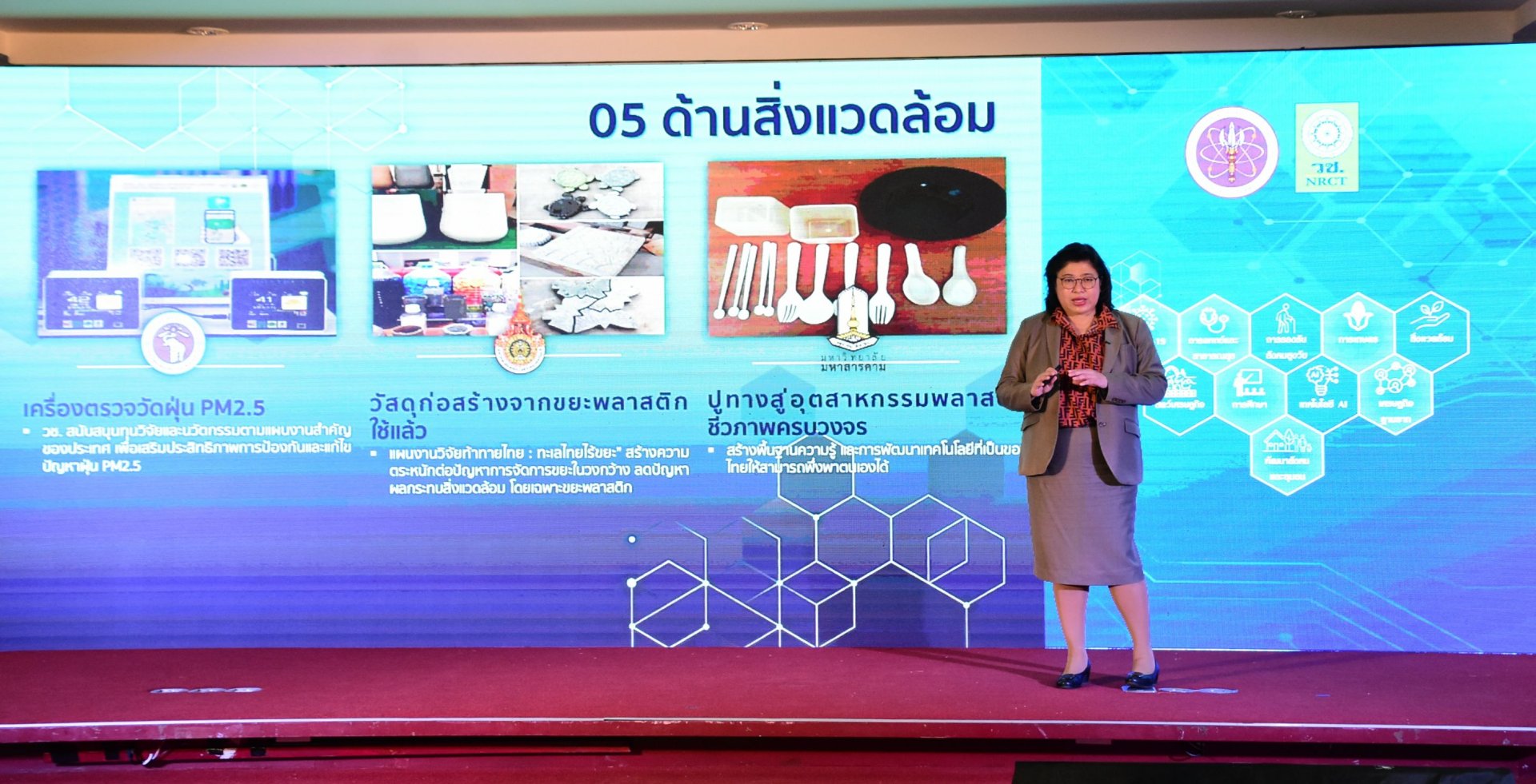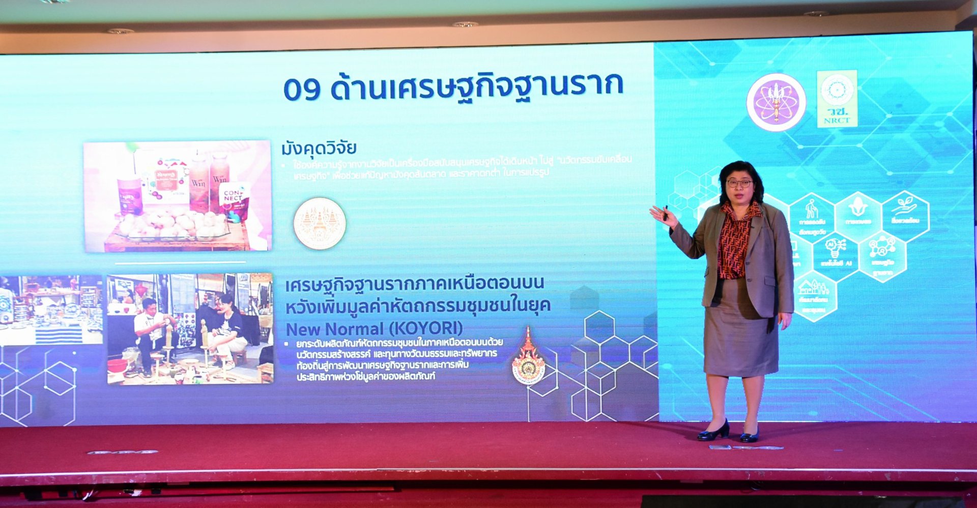 ในวันนี้ วช. นำผลงานวิจัยและนวัตกรรมดีดี บางส่วนที่ วช. ได้ให้การสนับสนุนและนำไปใช้ประโยชน์อย่างเป็นรูปธรรม 10 ด้าน มานำเสนอ ได้แก่ ด้านโควิด -19 อาทิ ศูนย์ปฏิบัติการด้านนวัตกรรมการแพทย์ และการวิจัยและพัฒนา ศูนย์บริหารสถานการณ์โควิด-19 (ศบค.) สำนักงานการวิจัยแห่งชาติ และ mRNA Vaccine เพื่อป้องกันการรักษาการติดเชื้อไวรัสโคโรนา SARS-CoV-2 ด้านการแพทย์และสาธารณสุข อาทิ ชุดตรวจปัสสวะสำเร็จรูปสำหรับตรวจวินิจฉัยโรคพยาธิใบไม้ตับในชุมชน และแผ่นดามกระดูกและสกรูทางออร์โธปิดิกส์ ด้านการรองรับสังคมสูงวัย อาทิ เตียงพลิกตะแคง ป้องกันแผลกดทับ และเปลี่ยนเกษียณเป็นพลัง ด้านการเกษตร อาทิยืดอายุ “มะม่วงน้ำดอกไม้” ส่งออกต่างประเทศ และยืดอายุทุเรียนเพื่อการส่งออก ด้านสิ่งแวดล้อม อาทิเครื่องตรวจวัดฝุ่น PM 2.5 และการจัดการขยะอิเล็กทรอนิกส์และของเสียอันตรายชุมชน ด้านสัตว์เศรษฐกิจ อาทิ ธนาคารปูม้าชุมชน เพื่อความยั่งยืน และไก่พื้นเมือง และไก่ลูกผสมพื้นเมือง สู่เชิงพาณิชย์ วิจัยปรับปรุงสายพันธุ์ “ไก่ลิกอร์” ไก่พื้นเมืองลูกผสม สายพันธุ์ใหม่ ด้านการศึกษา อาทิ ระบบซอฟต์แวร์โดรนแปรอักษร รายแรกในเอเชียตะวันออกเฉียงใต้ ด้านเทคโนโลยี AI อาทิ ระบบปัญญาประดิษฐ์ในการประเมินการใส่หน้ากากอนามัย (AiMASK) ด้านเศรษฐกิจฐานราก อาทิ มังคุดวิจัย และเศรษฐกิจฐานรากภาคเหนือตอนบน หวังเพิ่มมูลค่าหัตถกรรมชุมชนในยุค New Normal (KOYORI) ด้านการพัฒนาสังคมและชุมชน อาทิ พัฒนาศักยภาพบุคลากรด้านสาธารณสุขและแกนนำชุมชน เพื่อป้องกันโรคโควิด-19 บริเวณพื้นที่ชายแดน และสร้างตำบลต้นแบบ 15 จังหวัด ผ่านปราชญ์เพื่อความมั่นคง และเครือข่ายภาคประชาชน ฯลฯ