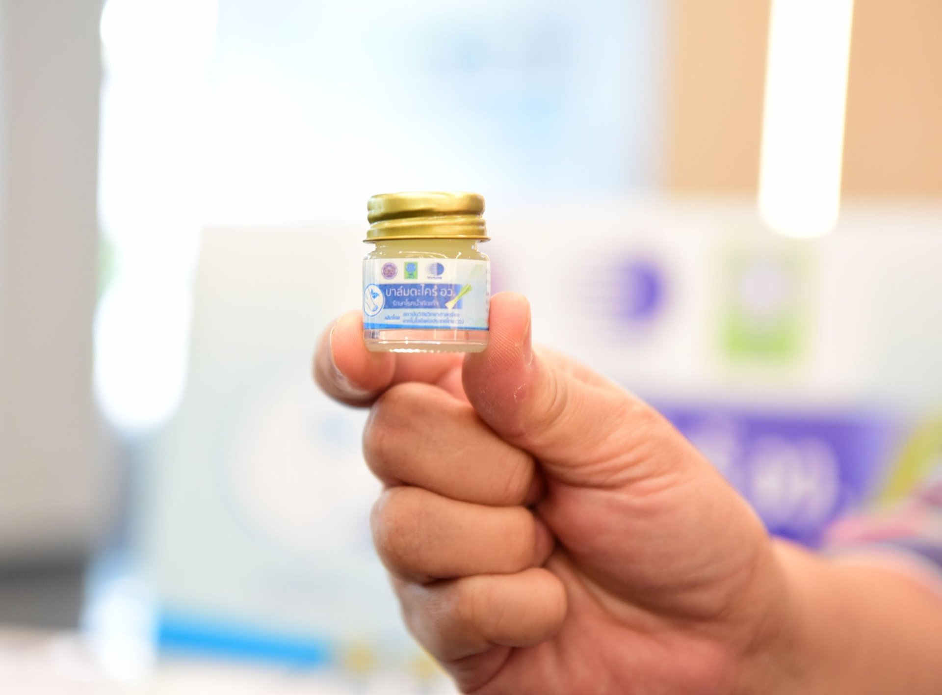 ศาสตราจารย์ (วิจัย) ดร.ชุติมา เอี่ยมโชติชวลิต ผู้ว่าการสถาบันวิจัยวิทยาศาสตร์และเทคโนโลยีแห่งประเทศไทย กล่าวว่า ประเทศไทยประสบเหตุการณ์น้ำท่วมเป็นประจำทุก ๆ ปี กินระยะยาวนานหลายเดือน ประชาชนต้องประสบกับโรคน้ำกัดเท้า ที่ผ่านมา วว. โดยศูนย์เชี่ยวชาญนวัตกรรมผลิตภัณฑ์สมุนไพร ได้ดำเนินงานวิจัยและพัฒนาผลิตภัณฑ์สมุนไพรมาเป็นเวลากว่า 40 ปี จากงานวิจัยการใช้ประโยชน์จากพืชหอม ได้สกัดน้ำมันหอมระเหยหลายชนิดนำมาทดสอบฤทธิ์ในการต้านเชื้อจุลินทรีย์ แบคทีเรียและเชื้อราต่าง ๆ พบว่า น้ำมันตะไคร้ที่มีองค์ประกอบสำคัญ คือ สารซิทรัล (Citral) มีคุณสมบัติสามารถต้านเชื้อราที่ก่อให้เกิดโรคผิวหนังได้ เหมาะสมที่จะพัฒนาเป็นผลิตภัณฑ์ในการรักษาเชื้อราบนผิวหนัง และได้ทดลองพัฒนาผลิตภัณฑ์ที่ผสมน้ำมันตะไคร้ นำไปทดสอบฤทธิ์ต้านเชื้อราพบว่าได้ผลดีกว่าผลิตภัณฑ์ที่มีจำหน่ายในท้องตลาด วว. จึงได้พัฒนาผลิตภัณฑ์บาล์มตะไคร้จากสารสกัดน้ำมันตะไคร้เพื่อรักษาโรคน้ำกัดเท้า ที่มีประสิทธิภาพและปลอดภัย นอกจากนี้ยังสามารถรักษาโรคผิวหนังที่เกิดจากเชื้อราอื่น ๆ เช่น กลาก เกลื้อนได้อีกด้วย โดย วว. ได้รับการสนับสนุนทุนในการผลิต จาก วช. ให้ดำเนินการผลิตบาล์มตะไคร้จากสารสกัดน้ำมันตะไคร้ จำนวน 3,000 ขวด เพื่อมอบให้แก่ชุมชนในพื้นที่จังหวัดพระนครศรีอยุธยาและจังหวัดสุพรรณบุรีเพื่อบรรเทาความเดือดร้อนแก่ประชาชนที่ประสบอุทกภัย นับว่าเป็นการบูรณาการความร่วมมือของหน่วยงานภายใต้ กระทรวง อว. ที่ร่วมมือกันขยายประโยชน์งานวิจัยให้สามารถใช้ได้จริง