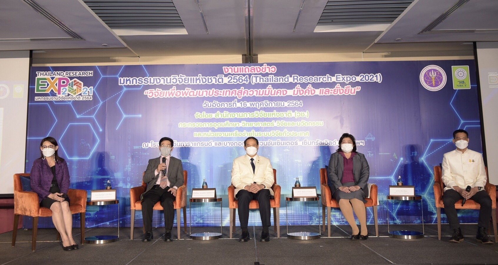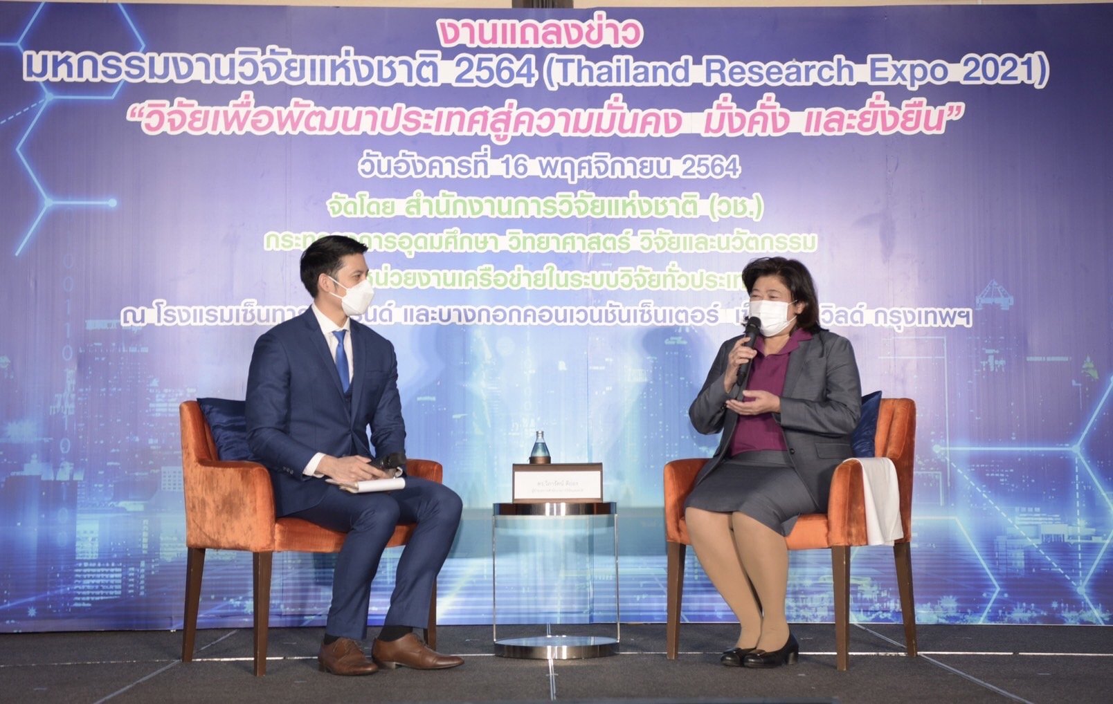 (16 พฤศจิกายน 2564) สำนักงานการวิจัยแห่งชาติ (วช.) กระทรวงการอุดมศึกษา วิทยาศาสตร์ วิจัยและนวัตกรรม (อว.) ร่วมกับหน่วยงานเครือข่ายระบบวิจัยทั่วประเทศ แถลงข่าวจัดงาน “มหกรรมงานวิจัยแห่งชาติ 2564 (Thailand Research Expo 2021)” ครั้งที่ 16 ซึ่งจะจัดขึ้นระหว่างวันที่ 22 - 26 พฤศจิกายน 2564 ณ โรงแรมเซ็นทาราแกรนด์ และบางกอกคอนเวนชันเซ็นเตอร์ เซ็นทรัลเวิลด์ ภายใต้คอนเซ็ปต์หลัก “วิจัยเพื่อพัฒนาประเทศสู่ความมั่นคง มั่งคั่ง และยั่งยืน” เพื่อเป็นเวทีสำคัญในการสร้างเครือข่ายการวิจัยของไทยที่มีศักยภาพ ไปสู่กลุ่มผู้ใช้ประโยชน์ทั้งในระดับประเทศและนานาชาติ กระจายโอกาสในการเข้าถึงฐานข้อมูลความรู้การวิจัยและนวัตกรรม พร้อมเปิดตัวทูตวิจัย “เพื่อน คณิณ” ตัวแทนพลังคนรุ่นใหม่