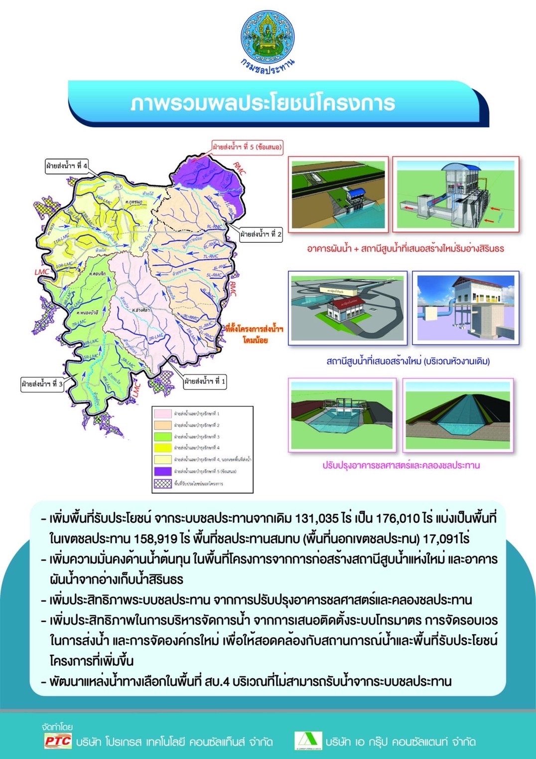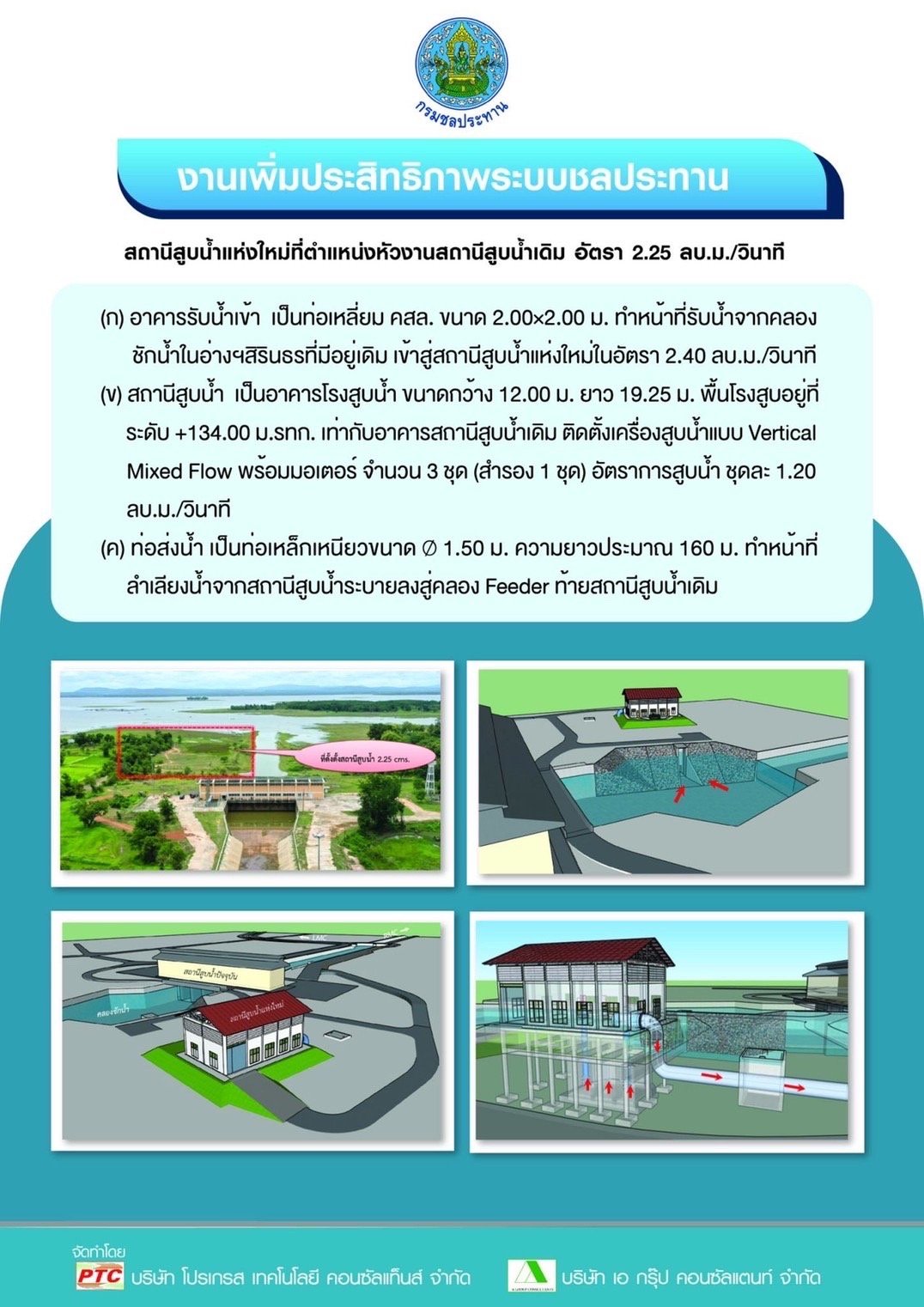 2) เพิ่มความมั่นคงด้านน้ำต้นทุน ในพื้นที่โครงการจากการก่อสร้างสถานีสูบน้ำแห่งใหม่ และอาคารผันน้ำจากอ่างเก็บน้ำสิรินธร