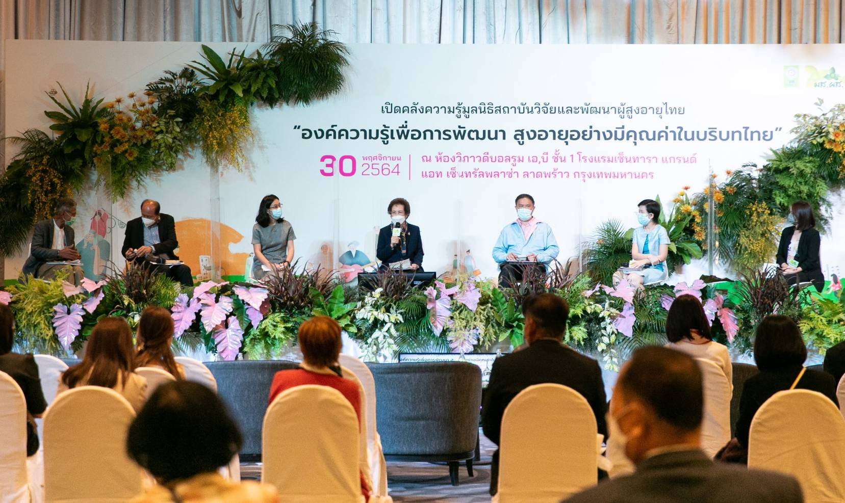 มูลนิธิสถาบันวิจัยและพัฒนาผู้สูงอายุไทย (มส.ผส.) จัดงานนำเสนอผลการวิจัยภายใต้แผนงานยุทธศาสตร์เป้าหมาย (Spearhead) ด้านสังคม โดยการสนับสนุนการสร้างและจัดการองค์ความรู้ จากสำนักงานการวิจัยแห่งชาติ (วช.) เพื่อเผยแพร่ข้อมูลองค์ความรู้ตลอดการดำเนินที่ผ่านมาสู่สาธารณะ ภายใต้แนวคิด “องค์ความรู้เพื่อการพัฒนา สูงอายุอย่างมีคุณค่าในบริบทไทย” เตรียมรองรับการเข้าสู่สังคมสูงอายุอย่างสมบูรณ์ พร้อมเสวนา “คุณภาพชีวิตของผู้สูงอายุไทย : จากการเรียนรู้ร่วมกันสู่นโยบายและภาคปฏิบัติ”เพื่อเปิดพื้นที่แลกเปลี่ยนเรียนรู้การดำเนินงานระหว่างภาคส่วนที่เกี่ยวข้องในการดำเนินงานด้านผู้สูงอายุ ทั้งงานวิชาการ งานนโยบาย และการสร้างองค์ความรู้เชิงประจักษ์ที่เกิดขึ้นจากการทำงานในระดับพื้นที่ รวมถึงการ บรรยายพิเศษ เรื่อง “การขับเคลื่อนและพัฒนาองค์ความรู้ เพื่อสนับสนุนคุณภาพชีวิตผู้สูงอายุ” จาก ดร.วิภารัตน์ ดีอ่อง ผู้อำนวยการสำนักงานการวิจัยแห่งชาติ และการปาฐกถาพิเศษ เรื่อง “ประเทศไทยต้องเดินแบบไหน ถึงจะใช้ชีวิตสูงวัยได้อย่างมีคุณภาพ” จากศาสตราจารย์เกียรติคุณ นายแพทย์ ประเวศ วะสี นอกจากนี้ ยังมีกิจกรรมภาคปฏิบัติซึ่งเป็นกิจกรรมส่งเสริมพฤฒพลังสำหรับผู้สูงอายุ ที่มาร่วมงานในวันนี้ด้วย โดยมี นพ.สมศักดิ์ ชุณหรัศมิ์ ประธานมูลนิธิสถาบันวิจัยและพัฒนาผู้สูงอายุไทย เป็นประธานในพิธีเปิด พร้อมด้วย ผู้ทรงคุณวุฒิ นักวิชาการ นักวิจัย องค์กรเครือข่ายภาคส่วนต่างๆ ที่ดำเนินงานด้านผู้สูงอายุ รวมถึงประชาชนทั่วไป เข้าร่วมงาน เมื่อวันที่ 30 พย.ที่ผ่านมา