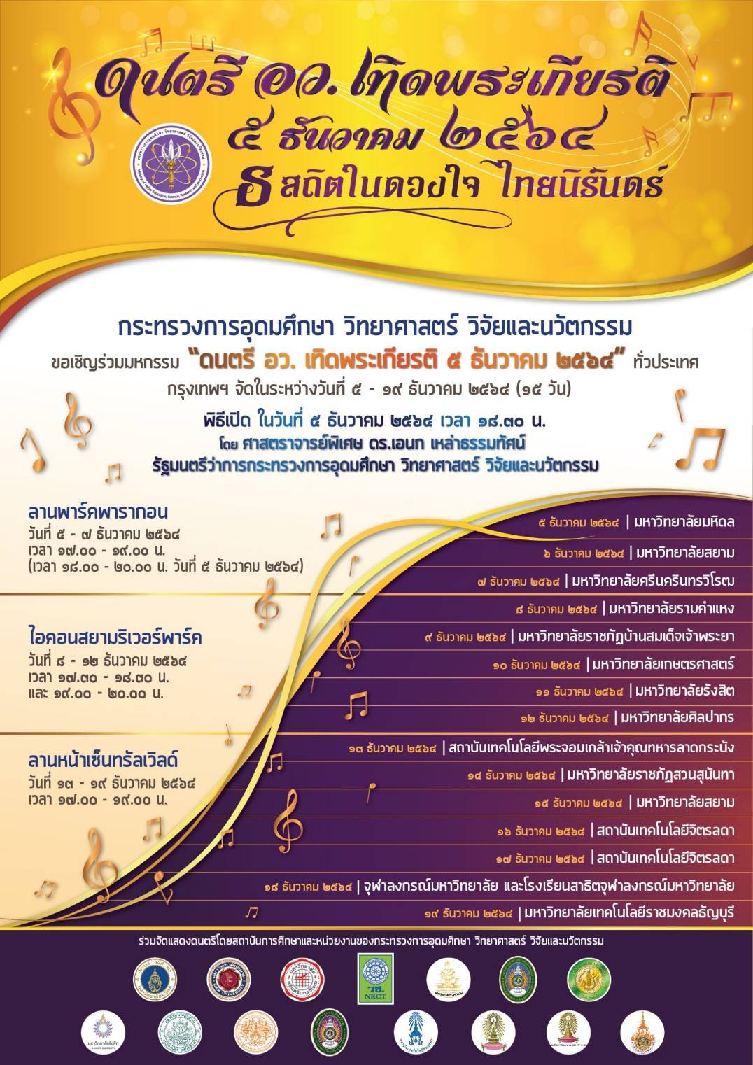 ศ.(พิเศษ) ดร.เอนก เหล่าธรรมทัศน์ รมว.การอุดมศึกษา วิทยาศาสตร์ วิจัยและนวัตกรรม เปิดเผยว่า อว.จะจัดกิจกรรมการแสดง “ดนตรี อว.เทิดพระเกียรติ 5 ธันวาคม 2564” เพื่อแสดงออกถึงความจงรักภักดีและน้อมรำลึกในพระมหากรุณาธิคุณ เนื่องในวันคล้ายวันพระราชสมภพพระบาทสมเด็จพระบรมชนกาธิเบศร มหาภูมิพลอดุลยเดชมหาราช บรมนาถบพิตร รวมถึงส่งมอบความสุขให้คนไทยทั่วประเทศผ่านบทเพลงพระราชนิพนธ์ เพลงไทยเดิม เพลงพื้นบ้านและอีกหลากหลายแนวเพลง โดยฝีมือการบรรเลงของนิสิต นักศึกษาจากสถาบันอุดมศึกษาทั่วประเทศ ทั้งในรูปแบบวงซิมโฟนี ออร์เคสตร้า วงดนตรีสากล วงดนตรีไทยและวงดนตรีพื้นบ้าน ซึ่งจะเริ่มบรรเลงพร้อมกันทั่วประเทศในวันที่ 5 ธ.ค. เวลา 17.00 น. ในพื้นที่ 48 จังหวัด กระจายไปทั่วทุกภูมิภาค