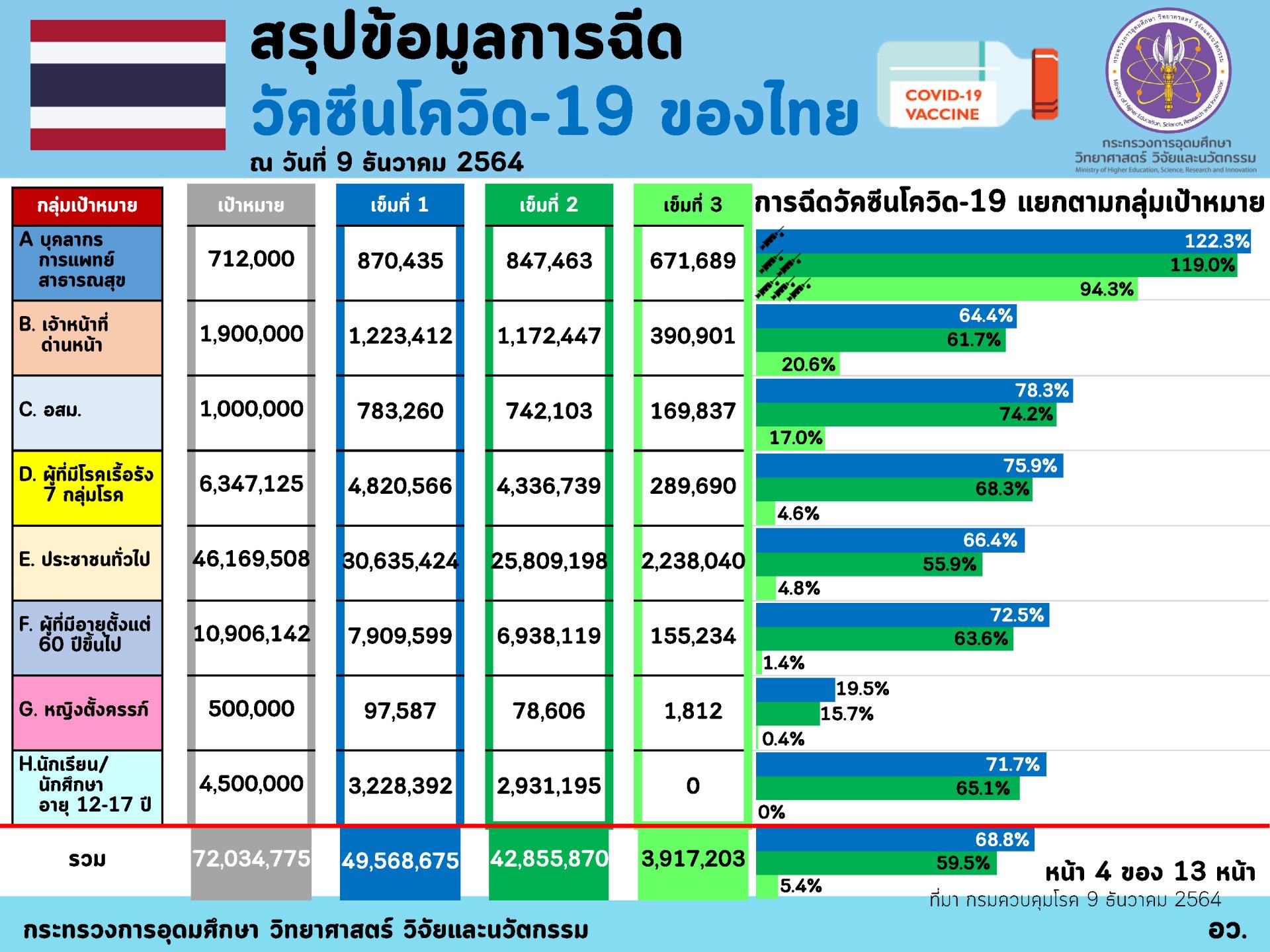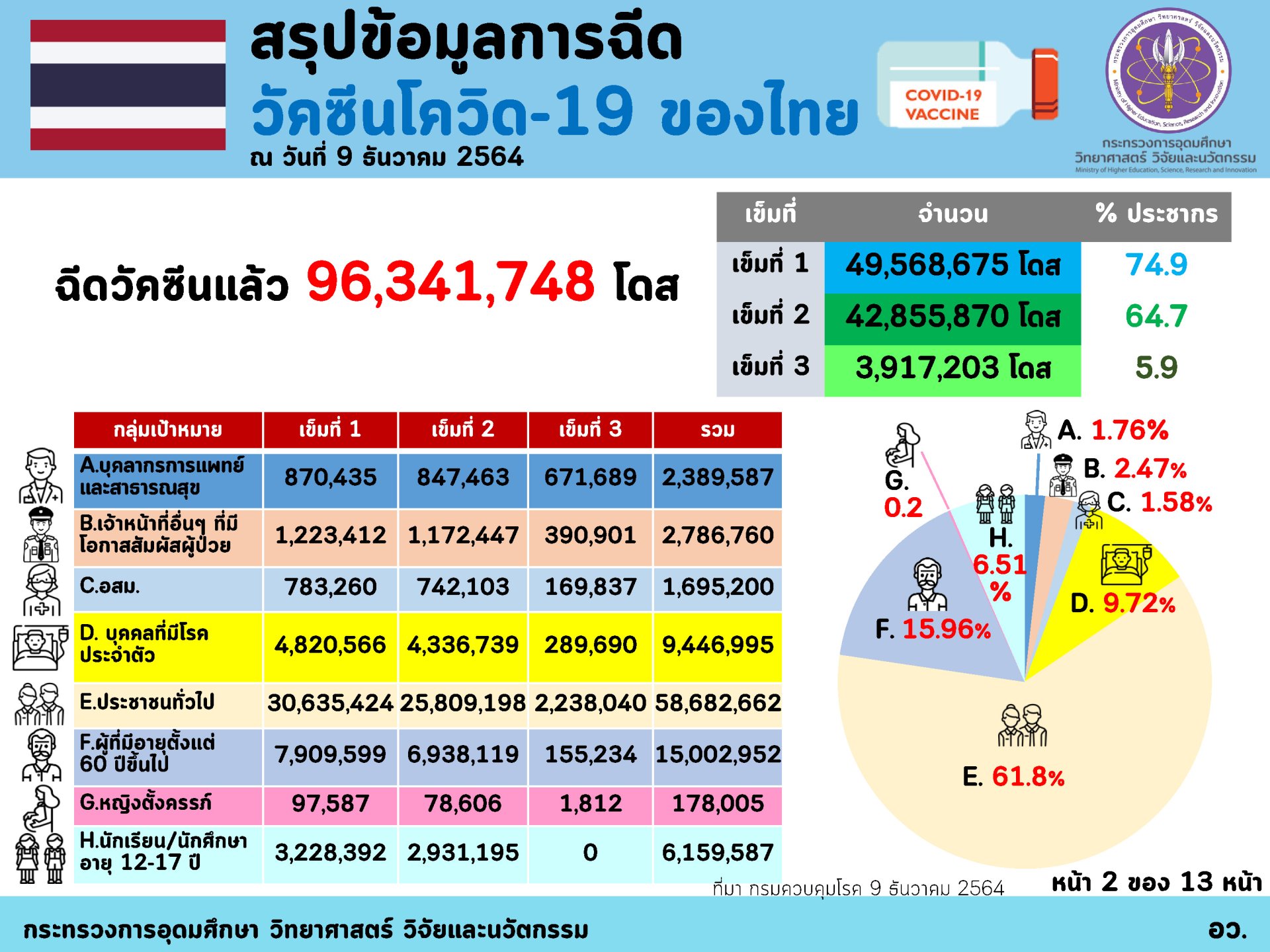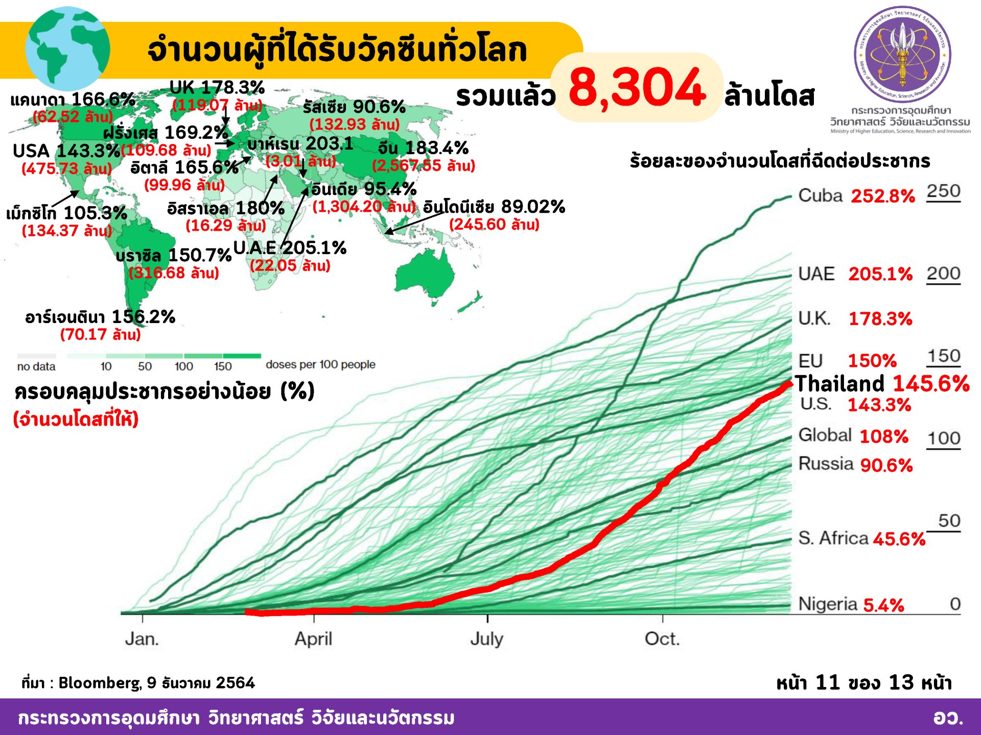 (9 ธันวาคม 2564) กระทรวงการอุดมศึกษา วิทยาศาสตร์ วิจัยและนวัตกรรม (อว.) เผยข้อมูลสถิติการฉีดวัคซีนโควิด-19 ทั่วโลกแล้ว 8,304 ล้านโดส ใน 205 ประเทศ/เขตปกครอง โดยขณะนี้อัตราการฉีดล่าสุดรวมกันทั่วโลกที่ 36.8 ล้านโดสต่อวัน และมีแนวโน้มที่เพิ่มขึ้นอย่างต่อเนื่อง ในขณะที่สหรัฐอเมริกามีจำนวนการฉีดวัคซีนสูงที่สุดที่ 476 ล้านโดส โดยมีชาวอเมริกันกว่า 200 ล้านคนได้รับวัคซีนครบ 2 โดสแล้ว"