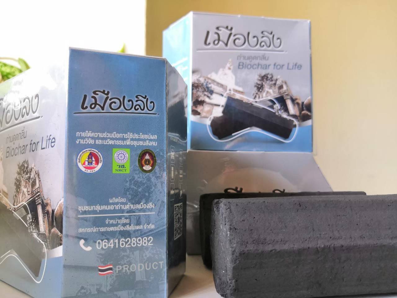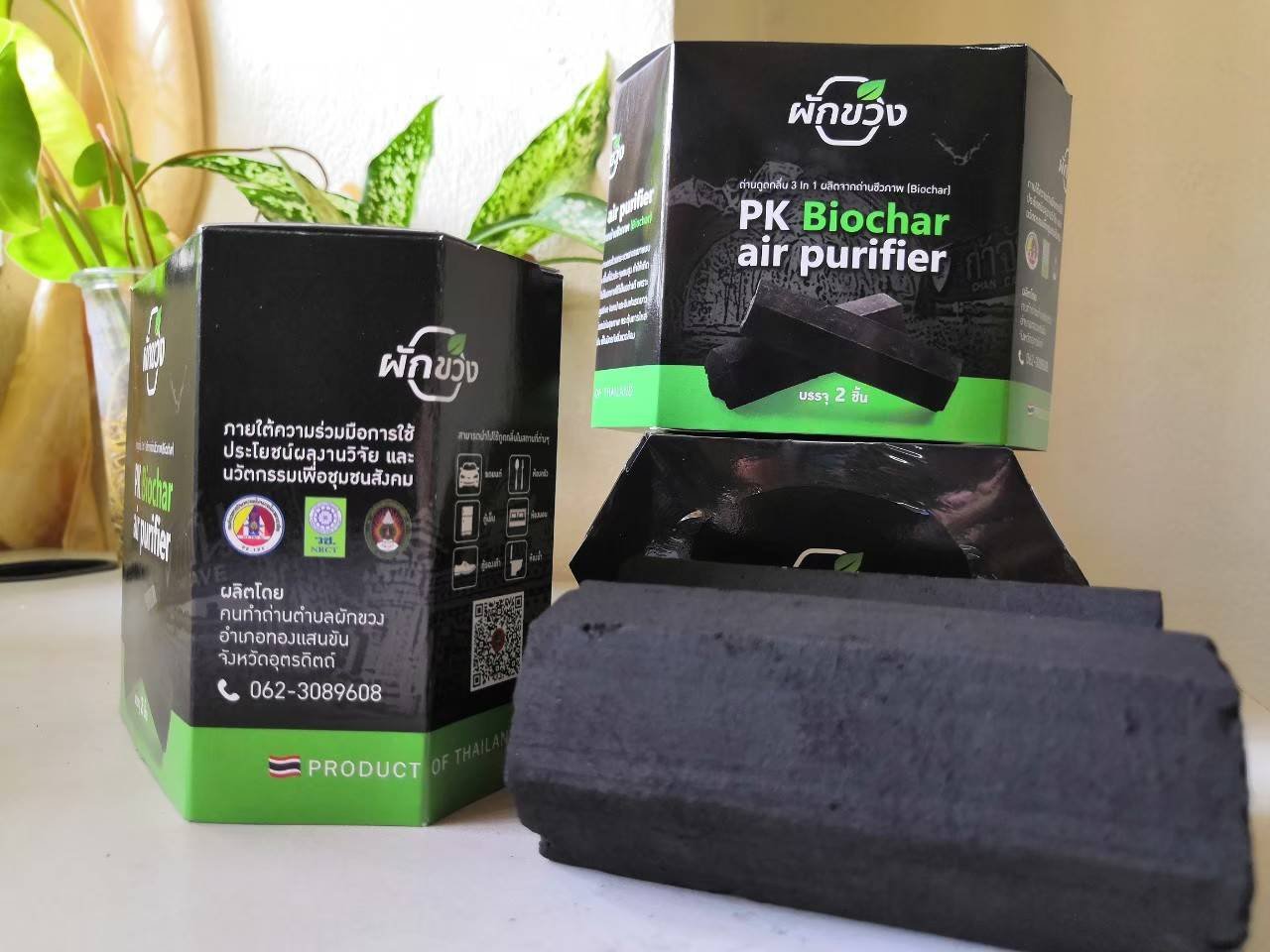 ถ่านดูดกลิ่น 3 In 1 มีคุณสมบัติในการดูดซับกลิ่น ความชื้น และจุลินทรีย์หรือเชื้อโรคในอากาศได้เป็นอย่างดี นอกจากนี้ถ่านมีประจุลบ และอินฟาเรดยาว ทำให้มีคุณประโยชน์ต่อสุขภาพ ช่วยกระตุ้นการไหลเวียนของเลือด สามารถวางไว้ในห้องนอน หรือใช้ได้ทั้งครัวเรือน เนื่องจากไม่มีสารเคมีเจือปน เป็นมิตรกับสิ่งแวดล้อม วัตถุดิบที่ใช้ในการผลิตเป็นวัสดุอินทรีย์ 100 เปอร์เซ็นต์ ภายใต้แบรนด์ถ่านดูดกลิ่น “Biochar for Life” ผลิตโดย ชุมชนกลุ่มคนเอาถ่านตำบลเมืองลีง อำเภอจอมพระ จังหวัดสุรินทร์ และ“PK Biochar air purifier”ผลิตและจำหน่ายโดยกลุ่มคนทำถ่านตำบลผักขวง อำเภอทองแสนขัน จังหวัดอุตรดิตถ์ โดยมีผลการตรวจวิเคราะห์ผ่านเกณฑ์มาตรฐานผลิตภัณฑ์ชุมชน (มผช.) ถ่านดูดกลิ่น มผช.๑๘๐/๒๕๖๓ นับว่า เป็นการเพิ่มมูลค่าเศษวัสดุเหลือใช้ให้เกิดประโยชน์ได้อย่างแท้จริง