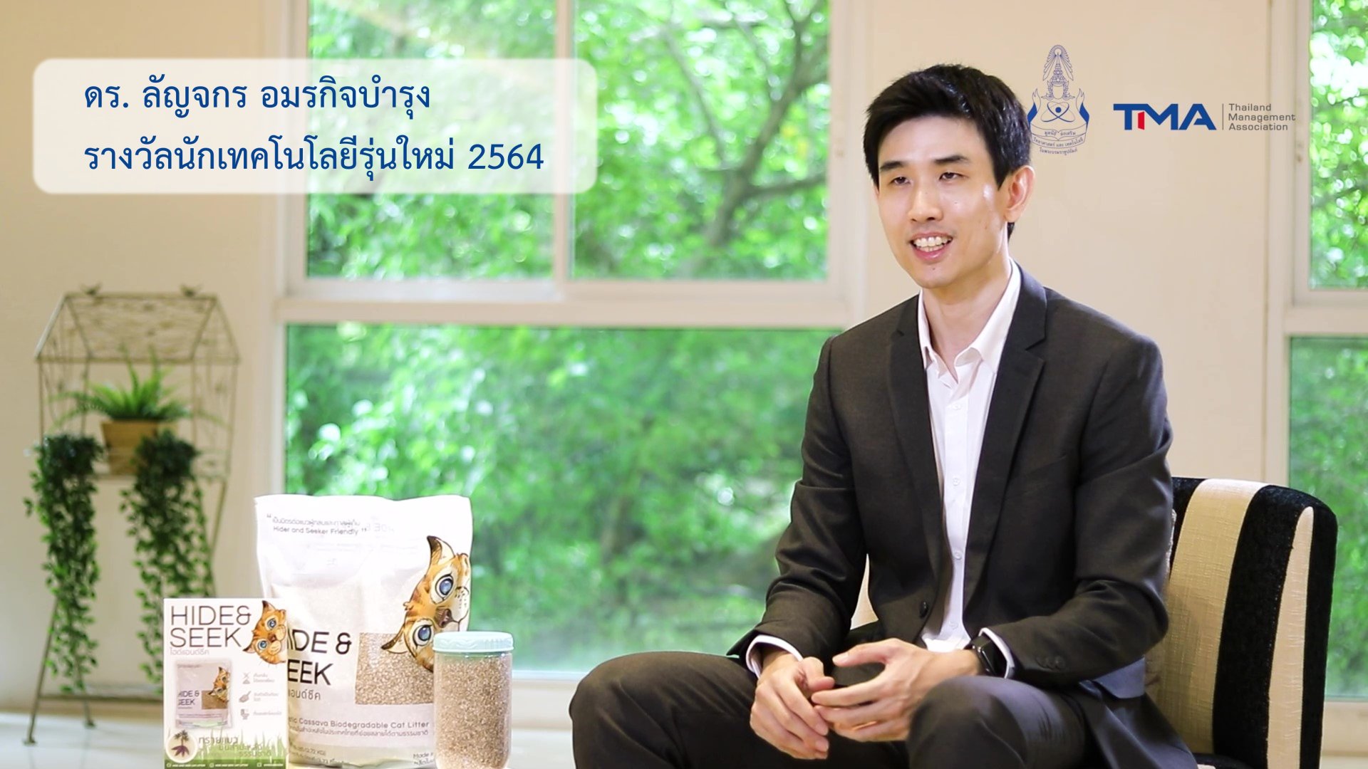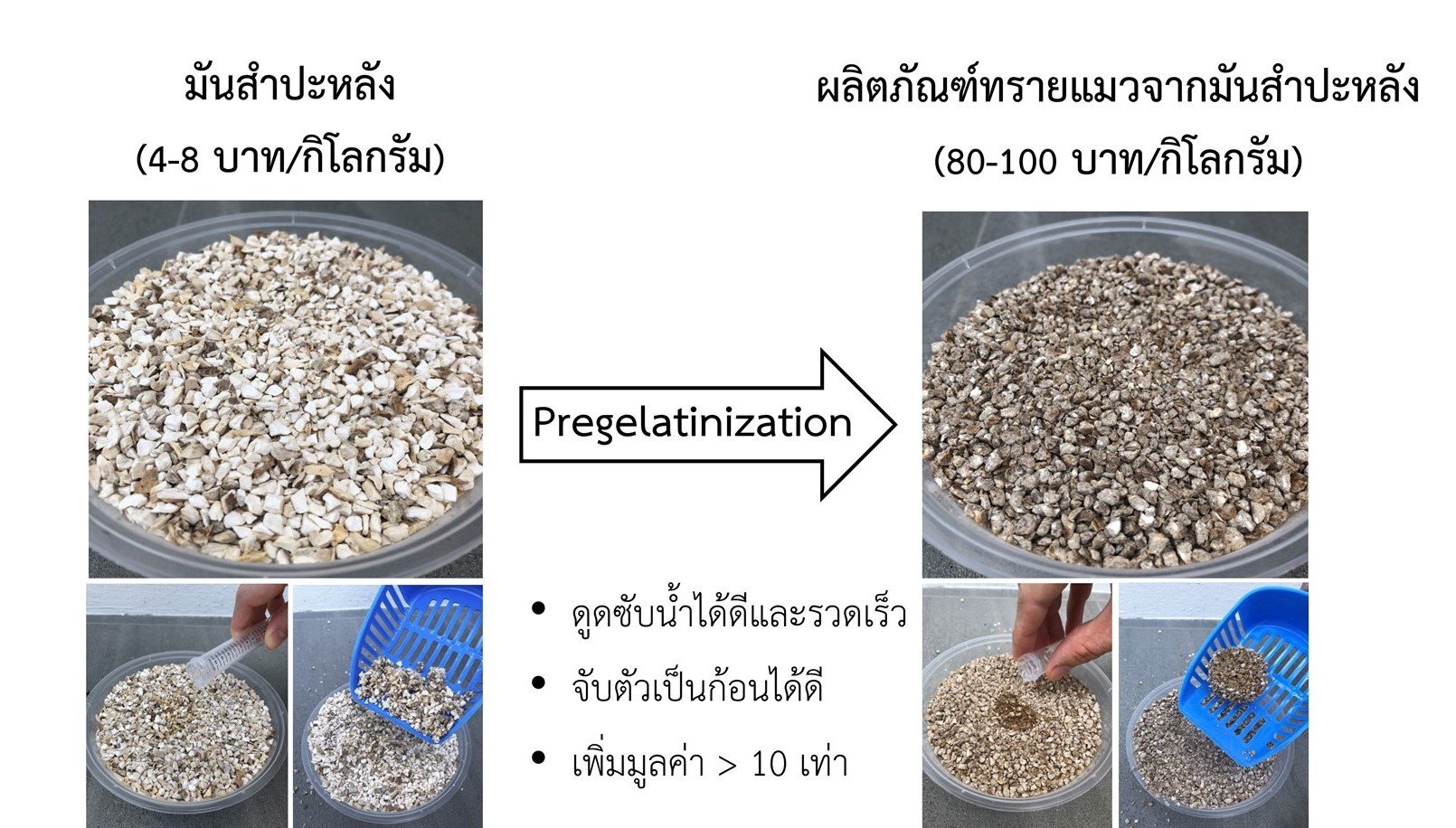 ดร.ลัญจกร อมรกิจบำรุง และคณะ เล่าต่อว่า ผลิตภัณฑ์ทรายแมวจากมันสำปะหลัง ใช้เวลาเกือบ 2 ปีในการศึกษาพัฒนากระบวนการPregelatinization ที่ใช้อุณหภูมิและความดันที่เหมาะสม เพื่อปรับปรุงสมบัติเชิงโมเลกุลของแป้งมันสำปะหลังซึ่งเป็นส่วนประกอบหลักในหัวมันสำปะหลัง ให้สามารถดูดซับของเหลวได้ดี รวดเร็ว และสามารถเหนียวจับตัวเป็นก้อนได้ ซึ่งเป็น Function หลักของผลิตภัณฑ์ทรายแมว นอกจากนี้ผลิตภัณฑ์ทรายแมวจากมันสำปะหลังไทย ยังสามารถดูดซับกลิ่นได้ดีอีกด้วย เทคโนโลยีนี้ ไม่มีการใช้สารเคมีใด ๆ ไม่เกิดของเสียปล่อยสู่สิ่งแวดล้อม
