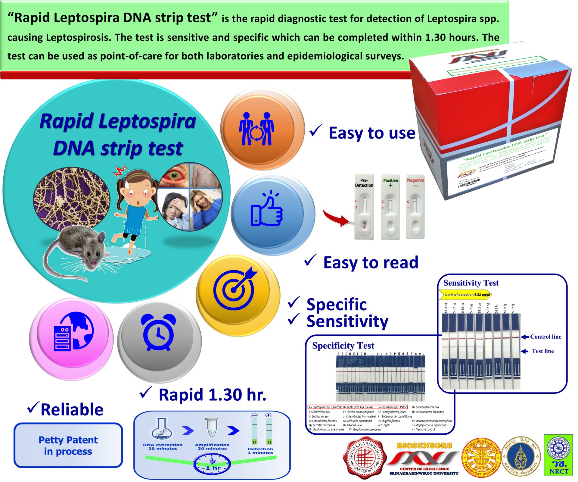 “ชุดทดสอบฯ หรือ “Rapid Leptospira DNA strip test” ใช้กระบวนการเพิ่มขยายจำนวนพันธุกรรมเฉพาะจุดของเชื้อเล็ปโตสไปรา พร้อมกับกระบวนการดีเอ็นเอตรวจจับ โดยใช้อุณหภูมิเดียวในระยะเวลาประมาณ 20 นาที หลังจากนั้นหยดส่วนผสมลงบนแผ่นทดสอบและอ่านผลเป็นแถบสี จากการศึกษาพบว่า “Rapid Leptospira DNA strip test” สามารถตรวจพบเชื้อเล็ปโตสไปราในปริมาณปนเปื้อนน้อยกว่า 1 ตัว และมีความจำเพาะสูงโดยไม่เกิดการจับกับเชื้อก่อโรคชนิดอื่นๆ ด้วยคุณสมบัติดังกล่าวสามารถนำชุดทดสอบนี้ไปใช้ในโรงพยาบาล สถานอนามัย หน่วยงานภาครัฐและเอกชน เพื่อลดระยะเวลาในการตรวจโรค