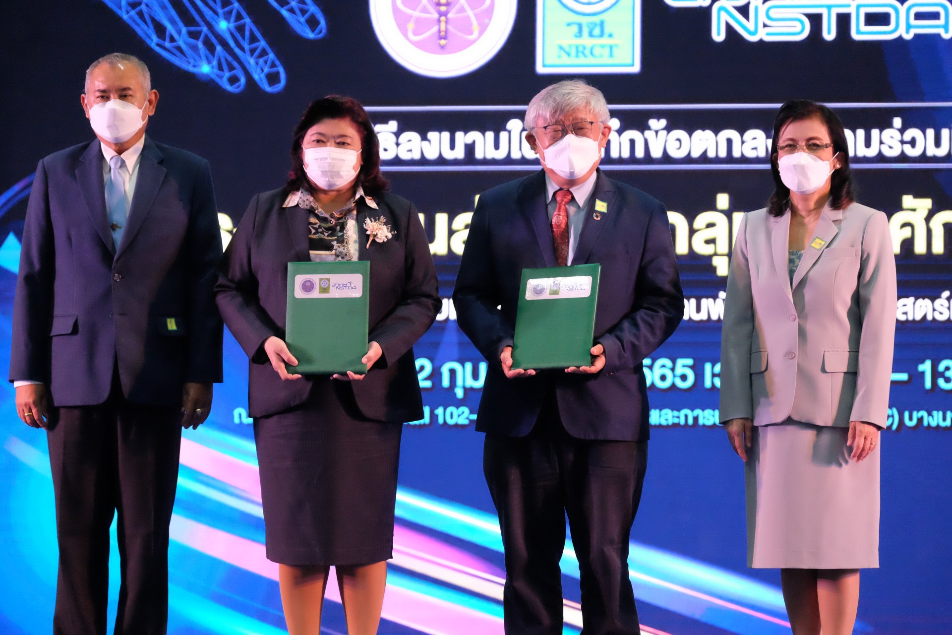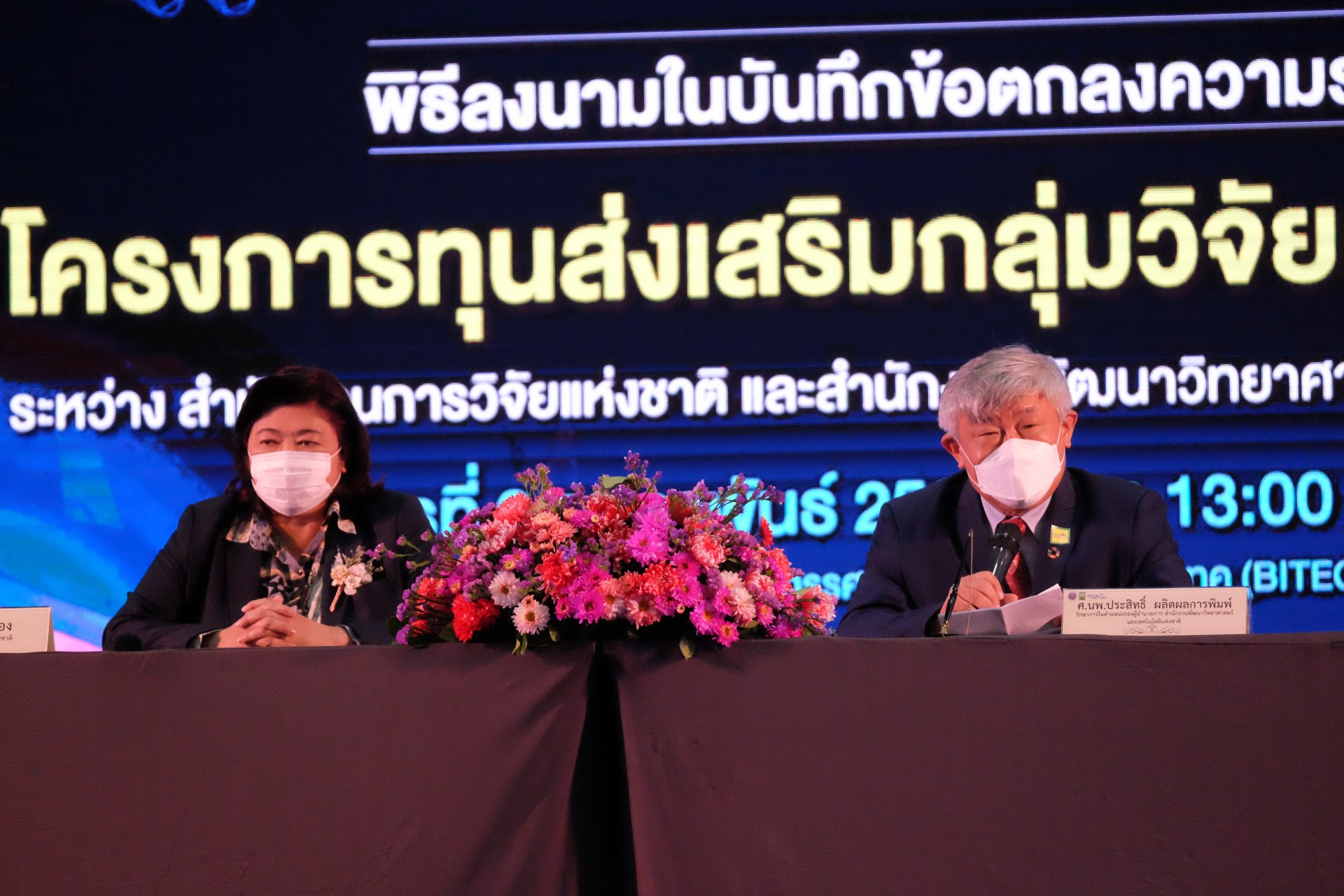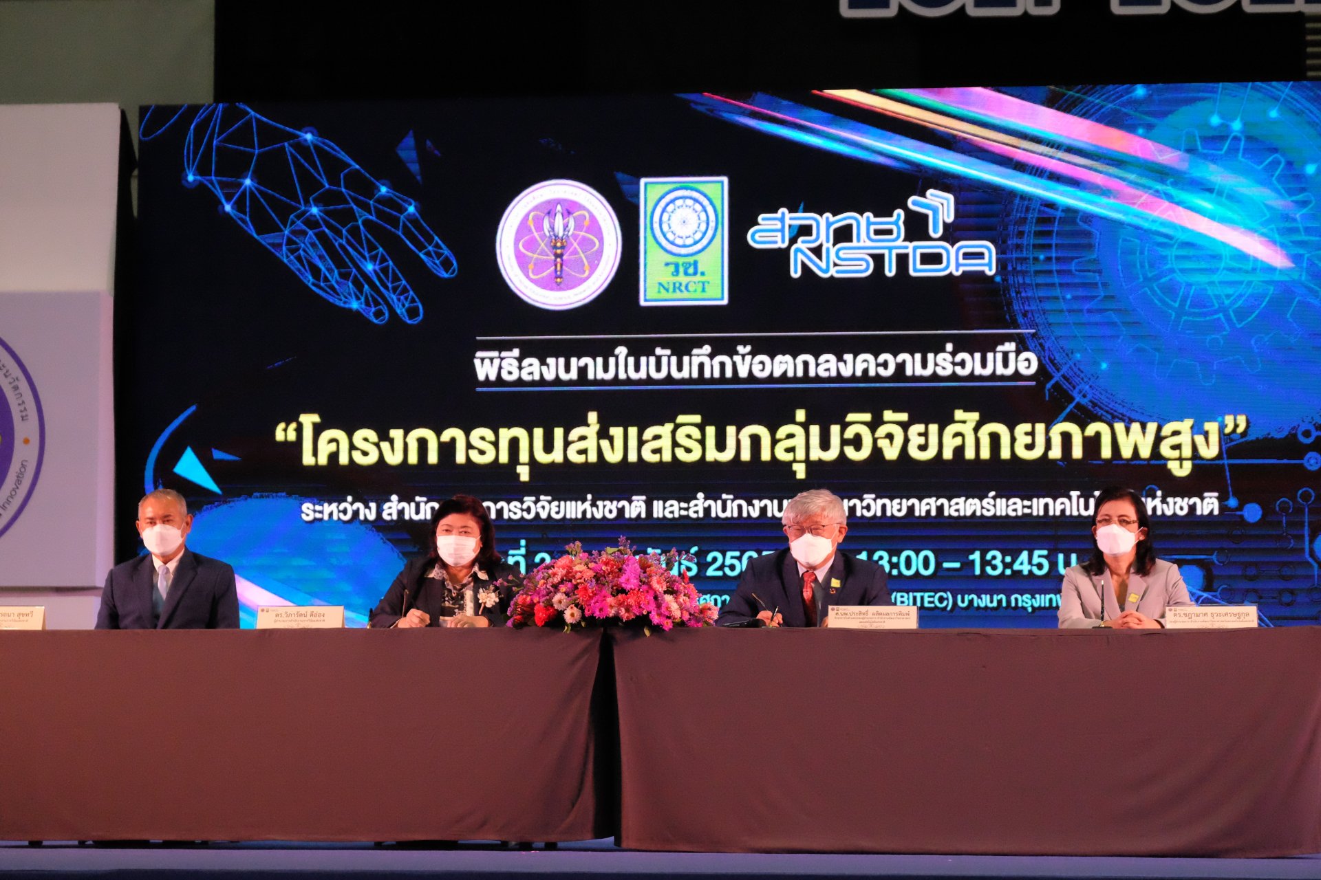 วันนี้ (2 กุมภาพันธ์ 2565) ที่ศูนย์นิทรรศการและการประชุมไบเทค (บางนา) : กระทรวงการอุดมศึกษา วิทยาศาสตร์ วิจัยและนวัตกรรม (อว.) โดยสำนักงานการวิจัยแห่งชาติ (วช.) และสำนักงานพัฒนาวิทยาศาสตร์และเทคโนโลยีแห่งชาติ (สวทช.) จัดพิธีลงนามบันทึกข้อตกลงความร่วมมือ โครงการ “ทุนส่งเสริมกลุ่มวิจัยศักยภาพสูง” โดยมี ดร.วิภารัตน์ ดีอ่อง ผู้อำนวยการสำนักงานการวิจัยแห่งชาติ และศาสตราจารย์ นายแพทย์ประสิทธิ์ ผลิตผลการพิมพ์ รักษาการรองผู้อำนวยการ สวทช. เป็นประธานการลงนาม พร้อมด้วยคณะผู้บริหารทั้ง 2 หน่วยงาน เข้าร่วมเป็นสักขีพยาน โดยพิธีการฯ จัดขึ้นภายในงาน“วันนักประดิษฐ์” ประจำปี 2564 - 2565