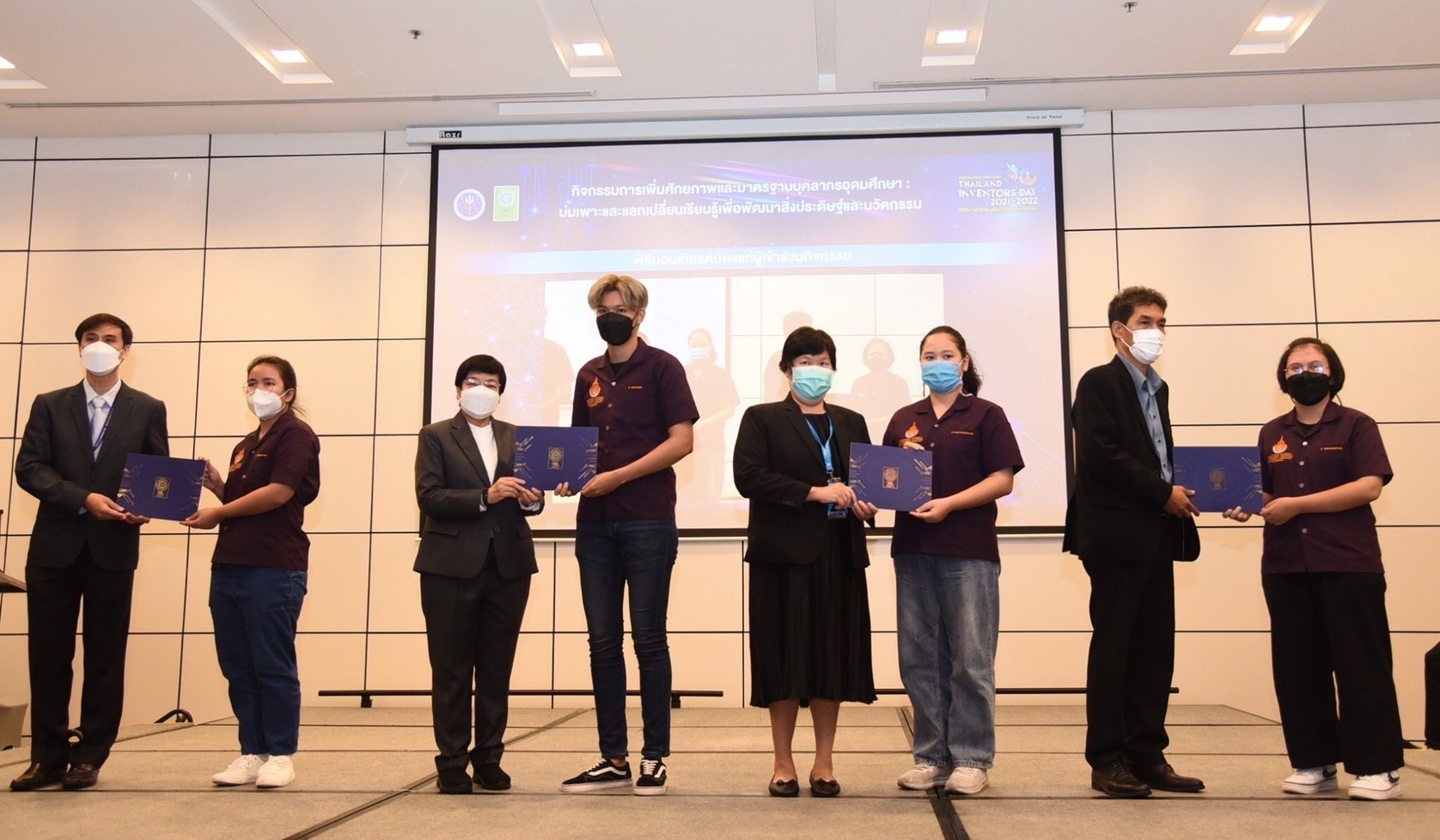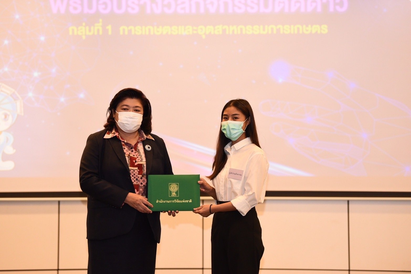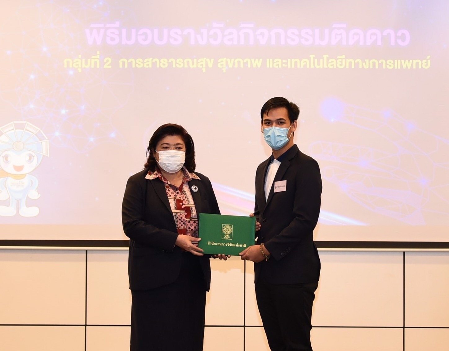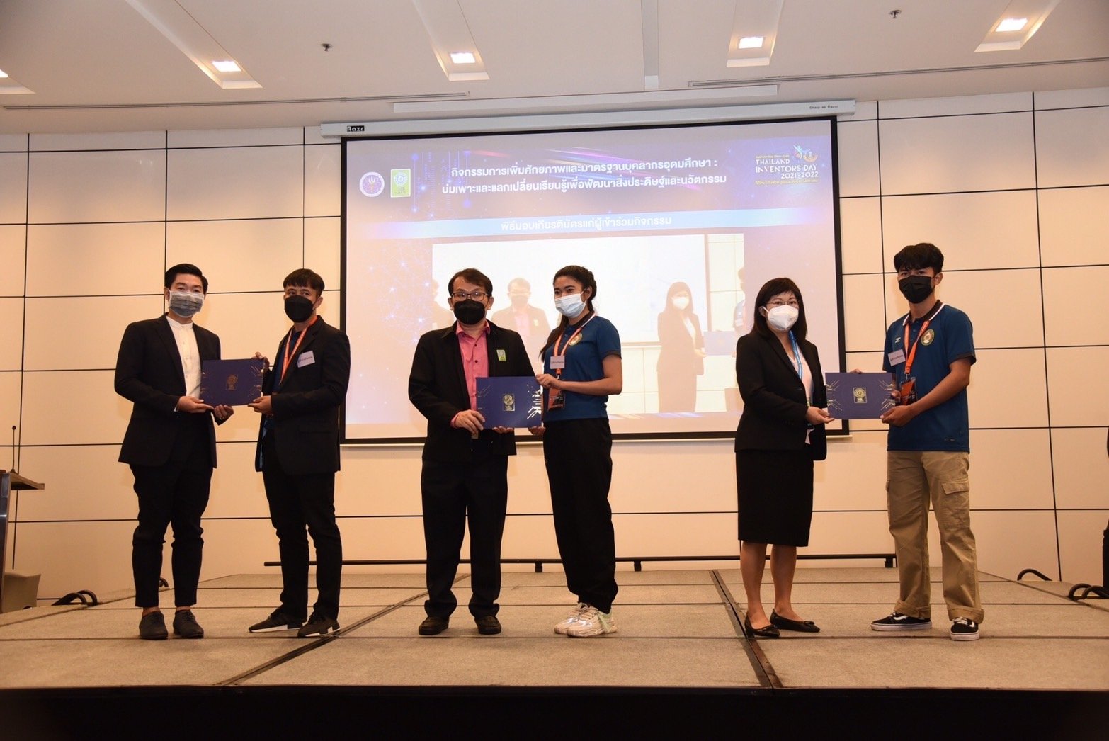 ผู้อำนวยการสำนักงานการวิจัยแห่งชาติ มอบรางวัลกิจกรรมติดดาว แก่นักศึกษา ระดับอุดมศึกษา ที่เข้าร่วมกิจกรรมการเพิ่มศักยภาพและมาตรฐานบุคลากรอุดมศึกษา : บ่มเพาะและแลกเปลี่ยนเรียนรู้ เพื่อพัฒนาสิ่งประดิษฐ์และนวัตกรรม ในงานวันนักประดิษฐ์ ประจำปี 2564 -2565 หลังเข้าอบรมเสริมสร้างความรู้ และแรงบันดาลใจจากวิทยากรผู้เชี่ยวชาญ กว่า 3 วัน โดยมุ่งหวังให้สามารถนำความรู้ไปใช้พัฒนาประเทศได้ต่อไป