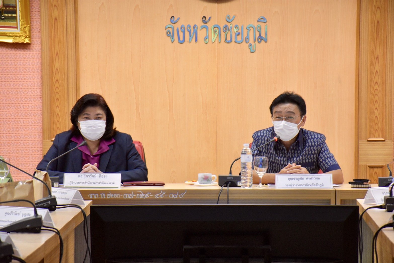 ดร.วิภารัตน์ ดีอ่อง ผู้อำนวยการสำนักงานการวิจัยแห่งชาติ พร้อมด้วย นายชาญชัย ศรศรีวิชัย รองผู้ว่าราชการจังหวัดชัยภูมิ และเครือข่ายวิจัยภูมิภาค: ภาคตะวันออกเฉียงเหนือ มหาวิทยาลัยขอนแก่น และมหาวิทยาลัยราชภัฏชัยภูมิ ร่วมประชุมเตรียมการจัดตั้งศูนย์วิจัยชุมชน “อารยะศิลป์ ชัยภูมิ”พิพิธภัณฑ์ผ้าโบราณ (เฮือนคำมุ) ณ ศาลากลางจังหวัดชัยภูมิ เมื่อวันที่ 15 กุมภาพันธ์ 2565 ที่ผ่านมาเพื่อส่งเสริมและสนับสนุน เป็นศูนย์กลางการเรียนรู้ ด้านศิลปวัฒนธรรมล้านช้างในภูมิภาคตะวันออกเฉียงเหนือของประเทศไทย