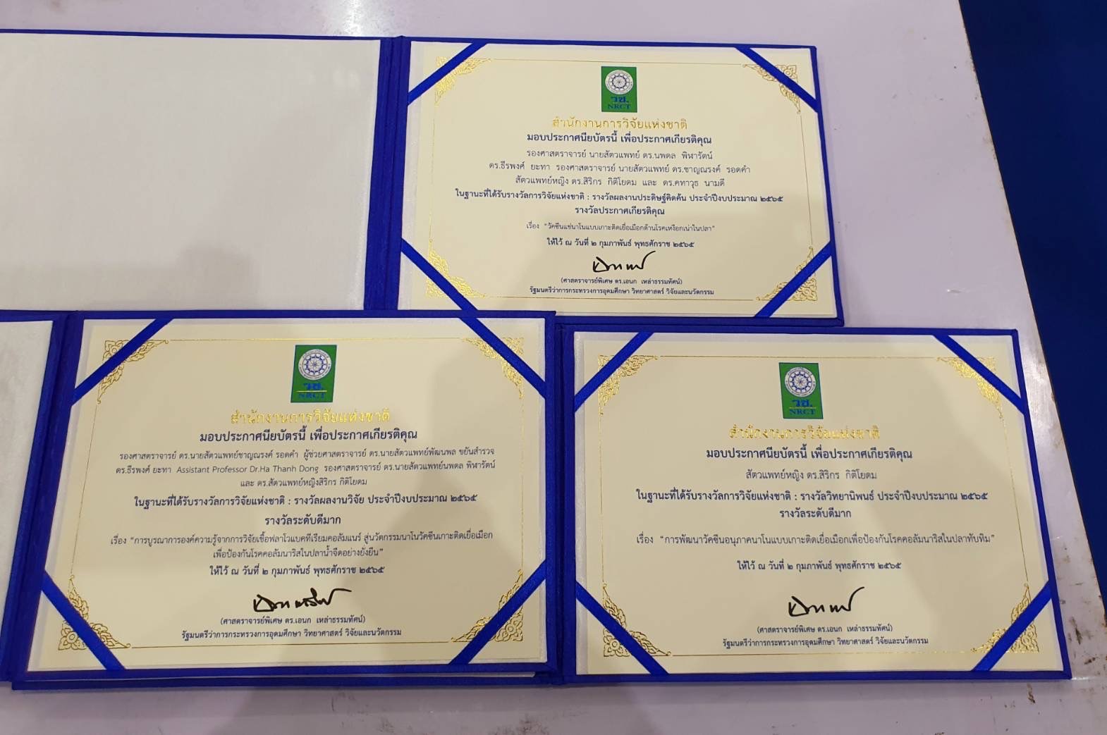 ผลงานวิจัย “นวัตกรรมการทำวัคซีนปลาแบบไร้เข็ม” ได้รับรางวัลการประกวดในเวทีนานาชาติหลายเวที อาทิ รางวัล GRAND PRIZE จากเวที Soel International Invention Fair 2021 (SIIF 2021) ณ กรุงโซล สาธารณรัฐเกาหลี รางวัล GOLD MEDAL จากเวที The 32nd International Invention, Innovation & Technology Exposition (ITEX 2021) ณ กรุงกัวลาลัมเปอร์ ประเทศมาเลเซีย รางวัล SILVER MEDAL จากงาน 2021 Kaohsiung International Invention & Design Expo (KIDE) ณ เมืองเกาสง ไต้หวัน รางวัล GOLD MEDAL จากเวที The 9th Macao International Innovation and Invention Expo (MiiEX) ณ เขตบริหารพิเศษมาเก๊าแห่งสาธารณรัฐประชาชนจีน โดยทุกเวทีได้รับการสนับสนุนจาก สำนักงานการวิจัยแห่งชาติ (วช.) กระทรวงการอุดมศึกษา วิทยาศาสตร์ วิจัยและนวัตกรรม