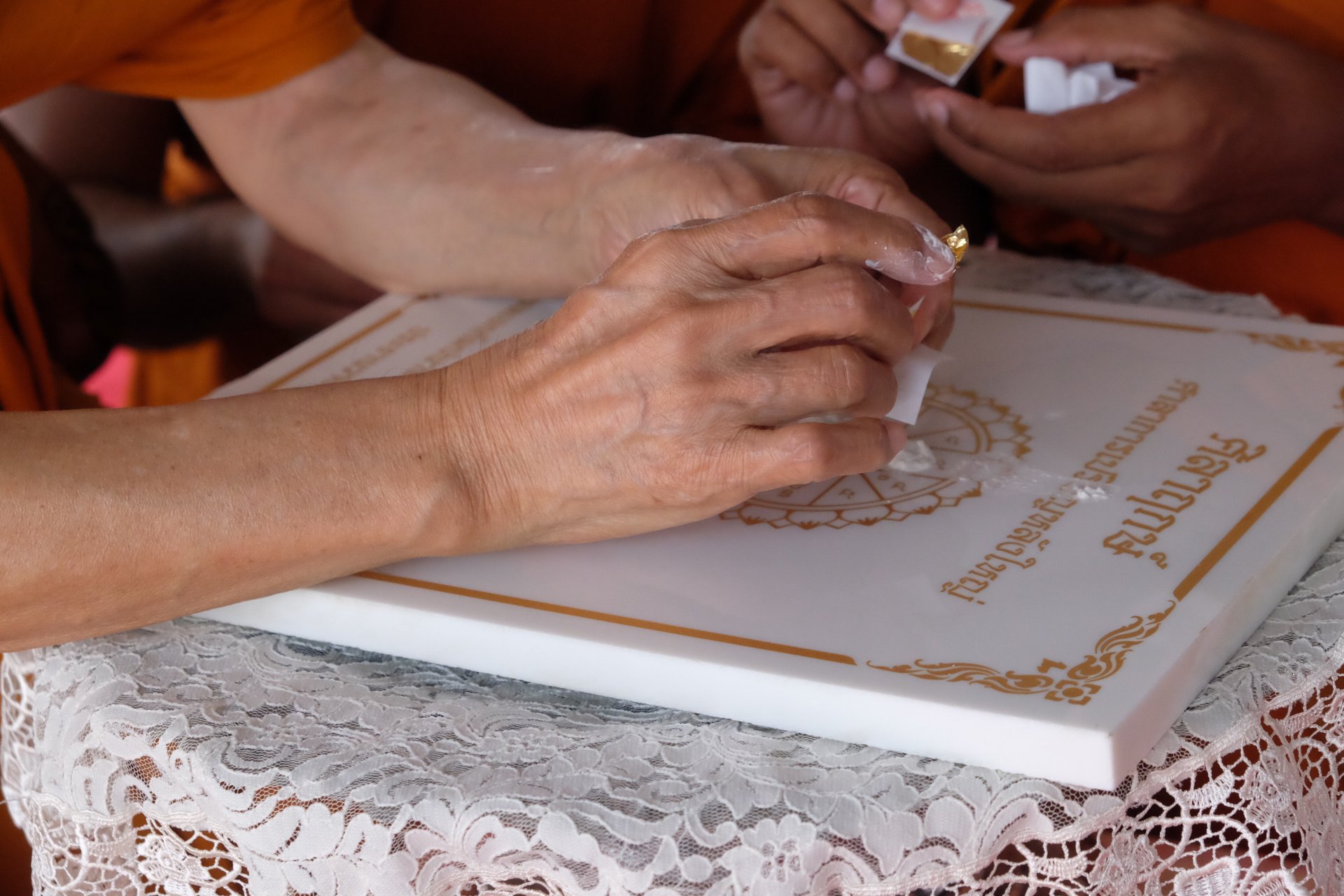 ร่วมตอกไม้มงคลพร้อมกับประธานในพิธี ประธานฝ่ายสงฆ์ ประธานฝ่ายฆราวาส โปรยข้าวตอกดอกไม้ ประธานฝ่ายสงฆ์ประพรมน้ำพระพุทธมนต์ พระสงฆ์เจริญชัยมงคลคาถา เจ้าพนักงานลั่นฆ้องชัย