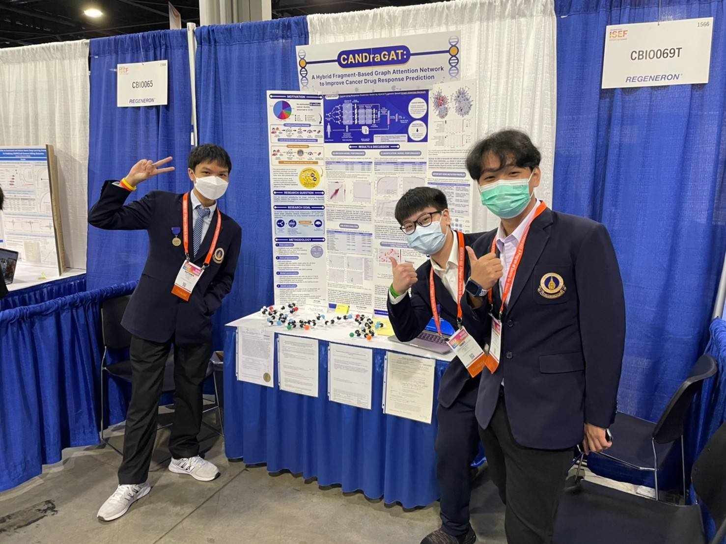 สำหรับอีกหนึ่งผลงานที่คว้ารางวัล Grand Awards อันดับ 1 สาขาชีววิทยาคอมพิวเตอร์และชีวสารสนเทศศาสตร์ เป็นผลงานจากโรงเรียนมหิดลวิทยานุสรณ์ จ.นครปฐม โดยมี นายภาวิต แก้วนุรัชดาสร นายณัฐวินทร์ แย้มประเสริฐ นายวุฒิพงศ์ จงเจริญสันติ ซึ่งมี ดร.สาโรจน์ บุญเส็ง เป็นอาจารย์ที่ปรึกษา และนายบัณฑิต บุญยฤทธิ์ สถาบันวิทยสิริเมที เป็นที่ปรึกษา กับ โครงงาน “การทำนายความไวต่อยาด้วยเทคนิคผสมผสาน Graph Attention Networks เพื่อเป็นทางเลือกสำหรับการรักษาโรคมะเร็งด้วยการแพทย์แบบแม่นยำ โดยใช้โครงสร้างโมเลกุลยาร่วมกับข้อมูลทางเภสัชพันธุศาสตร์” เป็นโมเดลการเรียนรู้เชิงลึก CANDraGAT ซึ่งเป็นโมเดลสำหรับทำนายค่าการตอบสนองต่อยารักษาโรคมะเร็ง โดยอาศัยข้อมูลโครงสร้างยาและข้อมูลทางพันธุกรรมของผู้ป่วย ซึ่งจะช่วยให้แพทย์สามารถเลือกยาให้เหมาะสมกับผู้ป่วยได้แม่นยำมากขึ้น