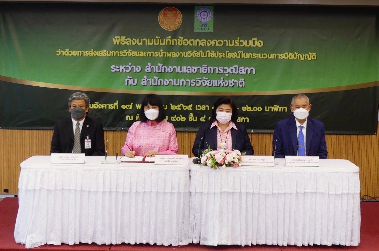 วันอังคารที่ 17 พฤษภาคม 2565 ที่ห้องประชุม 402 ชั้น 4 อาคารรัฐสภา ได้มีพิธีลงนามบันทึกข้อตกลงความร่วมมือว่าด้วยการส่งเสริมการวิจัยและการนำผลงานวิจัยไปใช้ประโยชน์ในกระบวนการนิติบัญญัติ ระหว่าง สำนักงานเลขาธิการวุฒิสภา กับ สำนักงานการวิจัยแห่งชาติ