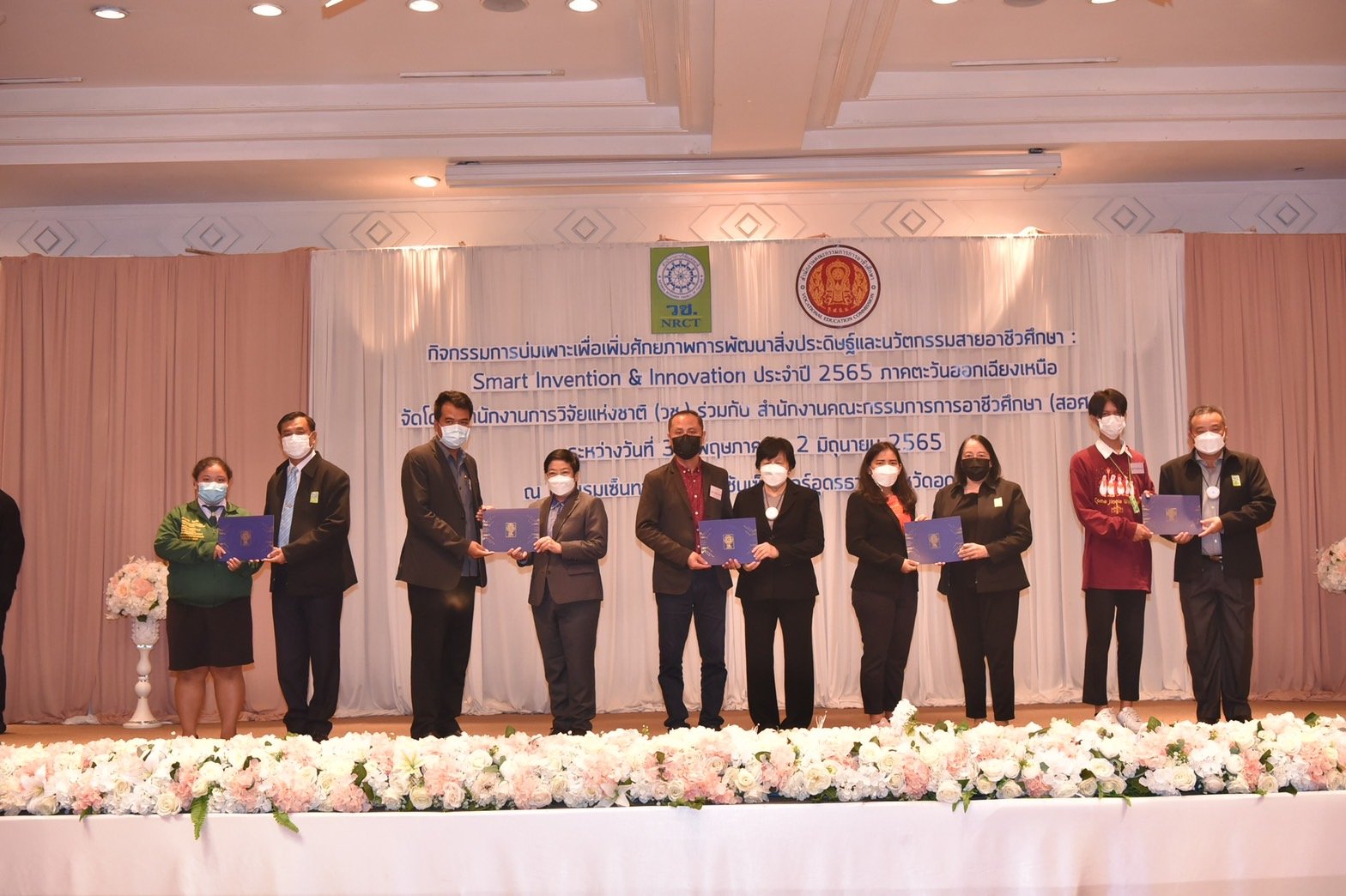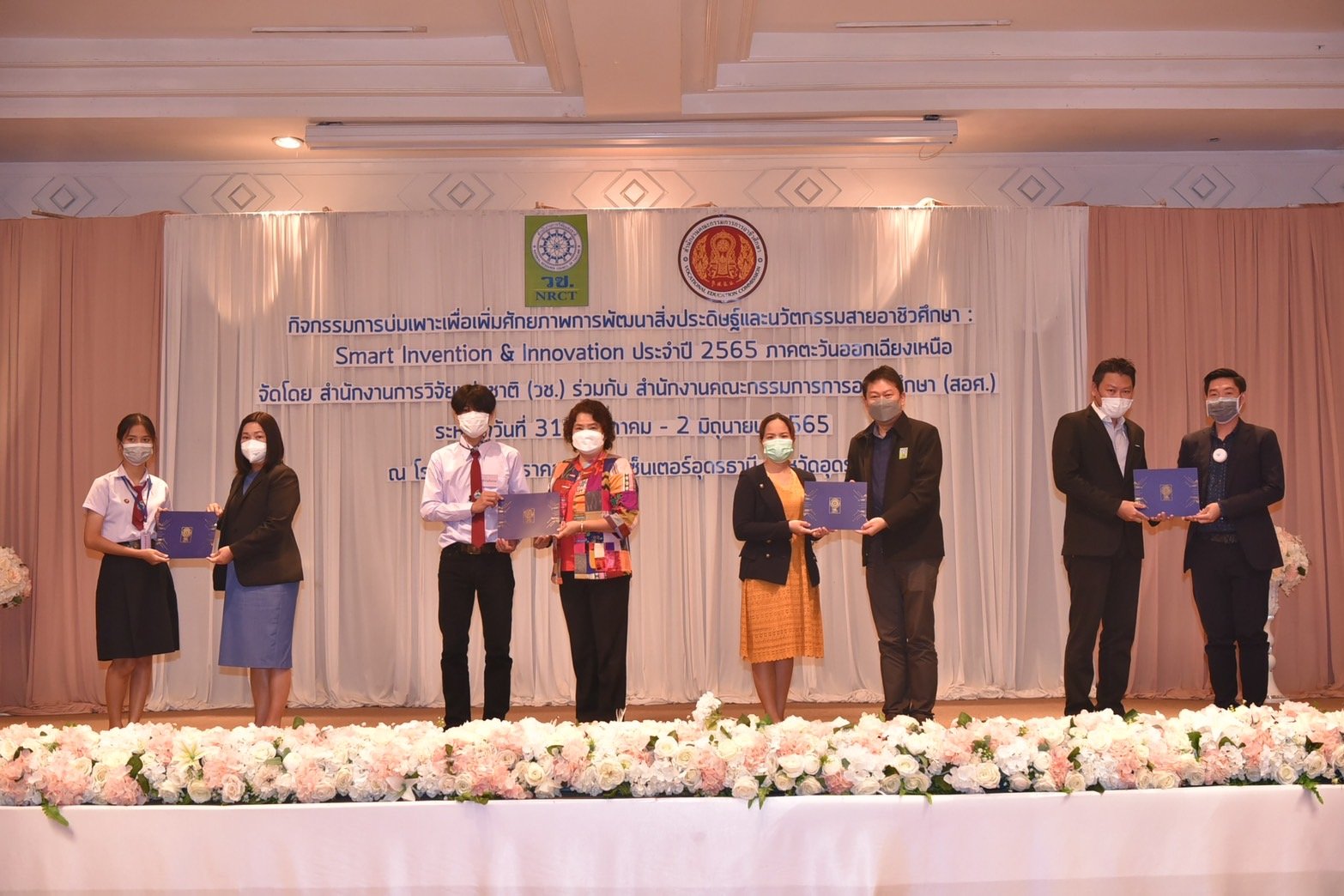สำหรับ พิธีปิดกิจกรรม “การบ่มเพาะเพิ่มศักยภาพการพัฒนาสิ่งประดิษฐ์และนวัตกรรมสายอาชีวศึกษา : Smart Invention & Innovation ภาคตะวันออกเฉียงเหนือ” จัดขึ้นในวันที่ 2 มิถุนายน 2565 โดยมี ดร.วิภารัตน์ ดีอ่อง ผู้อำนวยการสำนักงานการวิจัยแห่งชาติ เป็นประธานในพิธีปิดพร้อมมอบรางวัลกิจกรรมติดดาว และมอบเกียรติบัตรให้แก่ผู้ผ่านการอบรมฯ ด้วยกิจกรรม “การบ่มเพาะเพิ่มศักยภาพการพัฒนาสิ่งประดิษฐ์และนวัตกรรมสายอาชีวศึกษา : Smart Invention & Innovation ภาคตะวันออกเฉียงเหนือ” ในครั้งนี้ มีผลงานที่ได้รับรางวัลติดดาวในแต่ละกลุ่มเรื่อง ดังนี้ 1. ด้านการเกษตรและอุตสาหกรรมการเกษตร รางวัล 5 ดาว ได้แก่ ผลงาน “เตาอบแดดเดียวพลังงานแสงอาทิตย์แบบสะท้อนกลับ” ของ วิทยาลัยสารพัดช่างศรีสะเกษ 2. ด้านสาธารณสุข สุขภาพ และผลิตภัณฑ์เพื่อสุขภาพ รางวัล 5 ดาว ได้แก่ ผลงาน “นวัตกรรมรัดนิ้วข้อมือหัก” ของ วิทยาลัยเทคนิคปักธงชัย 3. ด้านการพัฒนาเทคโนโลยีปัญญาประดิษฐ์ อุปกรณ์อัจฉริยะ รางวัล 4 ดาว ได้แก่ ผลงาน “ระบบรดน้ำอัตโนมัติโดยใช้เซ็นเซอร์วัดความชื้นในดินและอากาศ” 4. ด้านพลังงาน สิ่งแวดล้อม และ BCG Economy Model รางวัล 5 ดาว ได้แก่ ผลงาน “กระเบื้องผนังจากขยะโฟมรีไซเคิล” ของ วิทยาลัยเทคนิคอุดรธานี และ 5. ด้านการพัฒนาคุณภาพชีวิตและเศรษฐกิจสร้างสรรค์ รางวัล 5 ดาว ได้แก่ ผลงาน “อุปกรณ์ขับเคลื่อนกระสวยทอผ้ากึ่งอัตโนมัติ” ของ วิทยาลัยอาชีวศึกษาสกลนคร