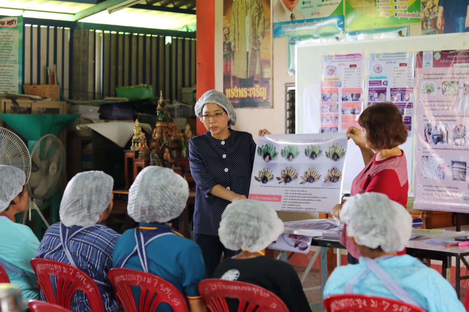 โดยคณะผู้วิจัยคัดเลือกองค์ความรู้จากงานวิจัยและเทคโนโลยีที่เหมาะสมมาถ่ายทอดให้แก่ชาวชุมชน 2 ผลงาน คือ 1.ผลิตภัณฑ์คุกกี้กล้วยที่ไม่มีส่วนผสมของไขมันทรานส์ ซึ่งเป็นผลงานที่ได้รับการจดอนุสิทธิบัตร เมื่อปี 2558 และ 2.ผลิตภัณฑ์ขนมกล้วยผงกึ่งสำเร็จรูป ซึ่งเป็นผลงานจากงานวิจัยที่ได้รับทุนจาก วช. เมื่อปีงบประมาณ 2552 ผลงานผลิตภัณฑ์จากกล้วยทั้ง 2 ผลงานนี้เป็นการผลิตที่ใช้อุปกรณ์ เครื่องมือและเทคโนโลยีระดับพื้นฐาน เพื่อสร้างสรรค์ผลิตภัณฑ์กล้วยในรูปแบบใหม่ ๆ ออกสู่ตลาด และช่วยแก้ปัญหาเมื่อเกิดภาวะกล้วยล้นตลาดภายในชุมชน เพื่อให้ชุมชนสามารถทำการผลิตเพื่อจำหน่ายในระดับท้องถิ่นและระดับจังหวัดได้ สำหรับเครื่องมืออื่น ๆ ที่เข้าไปสนับสนุนชุมชนได้แก่ เครื่องตีผสมอาหาร เครื่องปั่นแห้งรอบความเร็วสูงสำหรับบดแป้งกล้วย ตู้อบลมร้อน เตาอบแก๊สควบคุมด้วยไฟฟ้า เครื่องซีลภาชนะบรรจุอาหาร นอกจากนี้ คณะผู้วิจัยยังได้จัดทำคู่มือเรื่องการถ่ายทอดเทคโนโลยีการผลิต ผลิตภัณฑ์คุกกี้กล้วยและขนมกล้วยกึ่งสำเร็จรูป โดยอธิบายกรรมวิธีการทำในแต่ละขั้นตอน จนได้เป็นผลิตภัณฑ์คุกกี้กล้วย และผลิตภัณฑ์ ขนมกล้วยกึ่งสำเร็จรูปที่ถูกสุขลักษณะ มีคุณค่าทางโภชนาการบรรจุอยู่ในซองอะลูมิเนียมฟอยล์พร้อมบริโภค