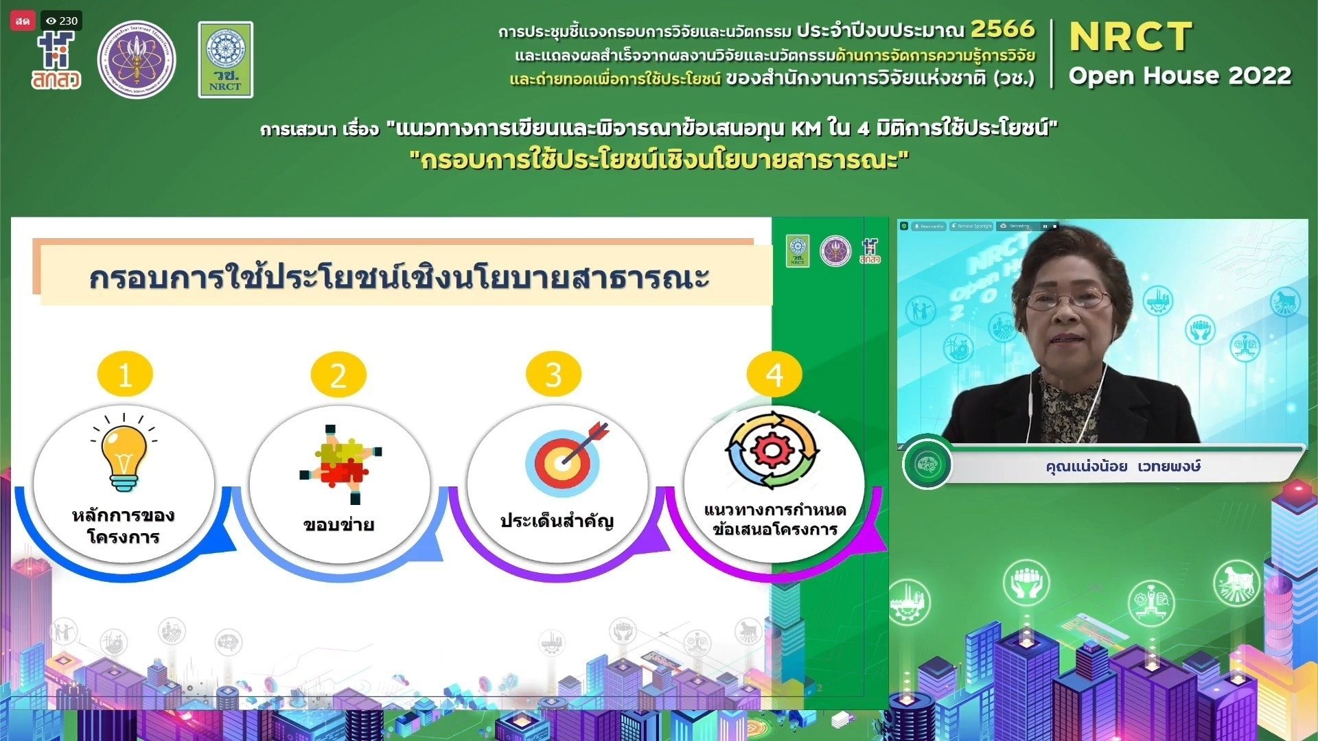 phatheaw วันนี้พามาที่ สำนักงานการวิจัยแห่งชาติ (วช.) กระทรวงการอุดมศึกษา วิทยาศาสตร์ วิจัยและนวัตกรรม ดร.วิภารัตน์ ดีอ่อง ผู้อำนวยการสำนักงานการวิจัยแห่งชาติ เป็นประธาน จัดการประชุมชี้แจงกรอบการวิจัยและนวัตกรรมด้านการจัดการความรู้การวิจัยและถ่ายทอดเพื่อการใช้ประโยชน์ (KM) ประจำปีงบประมาณ 2566 และการแถลงผลสำเร็จจากผลงานวิจัยและนวัตกรรมด้านการจัดการความรู้การวิจัยและถ่ายทอดเพื่อการใช้ประโยชน์ NRCT Open House 2022 “วิจัยและนวัตกรรมในประเด็นท้าทายของประเทศ” เพื่อชี้แจงกรอบการวิจัยและนวัตกรรม ประจำปีงบประมาณ 2566 ของ วช. และแนวทางการเขียนและพิจารณาข้อเสนอการวิจัยและนวัตกรรม รวมทั้งแถลงผลสำเร็จจากการวิจัยและนวัตกรรม เพื่อเป็นเวทีแลกเปลี่ยนประสบการณ์การเขียนข้อเสนอการวิจัยและนวัตกรรมและการยื่นขอทุน วช. ด้านการจัดการความรู้การวิจัยและถ่ายทอดเพื่อการใช้ประโยชน์