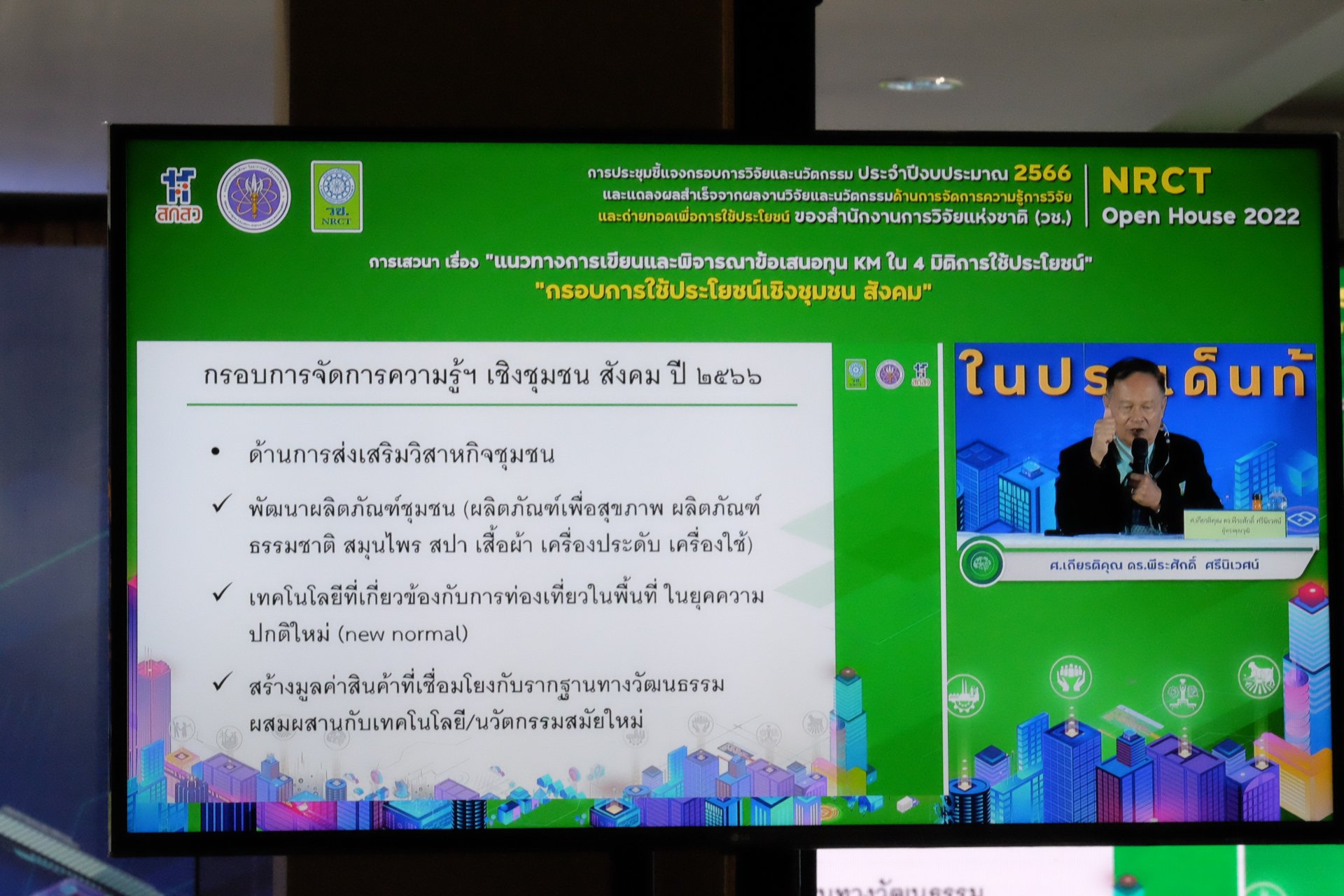 โดยกิจกรรม NRCT Open House2022 : ด้านการจัดการความรู้การวิจัยและถ่ายทอดเพื่อการใช้ประโยชน์ การออกแบบความรู้ที่เป็นนวัตกรรมพร้อมใช้ เทคโนโลยีที่เหมาะสม เพื่อนำไปใช้ในกระบวนการวิจัยเพื่อแก้ไขปัญหาสำคัญ เสริมศักยภาพได้อย่างเป็นรูปธรรมผ่านการสร้างนวัตกรรมชุมชนที่เป็นผู้นำการเปลี่ยนแปลงในการรับและปรับใช้นวัตกรรมพร้อมใช้เทคโนโลยีที่เหมาะสมกับบริบท สามารถถ่ายทอดความรู้ไปสู่ผู้อื่นได้รวมทั้งสามารถเป็นแกนนำในการจัดกระบวนการเรียนรู้เพื่อหนุนให้ชุมชนมีพื้นที่และโอกาสเรียนรู้ได้อย่างต่อเนื่องและยั่งยืน
