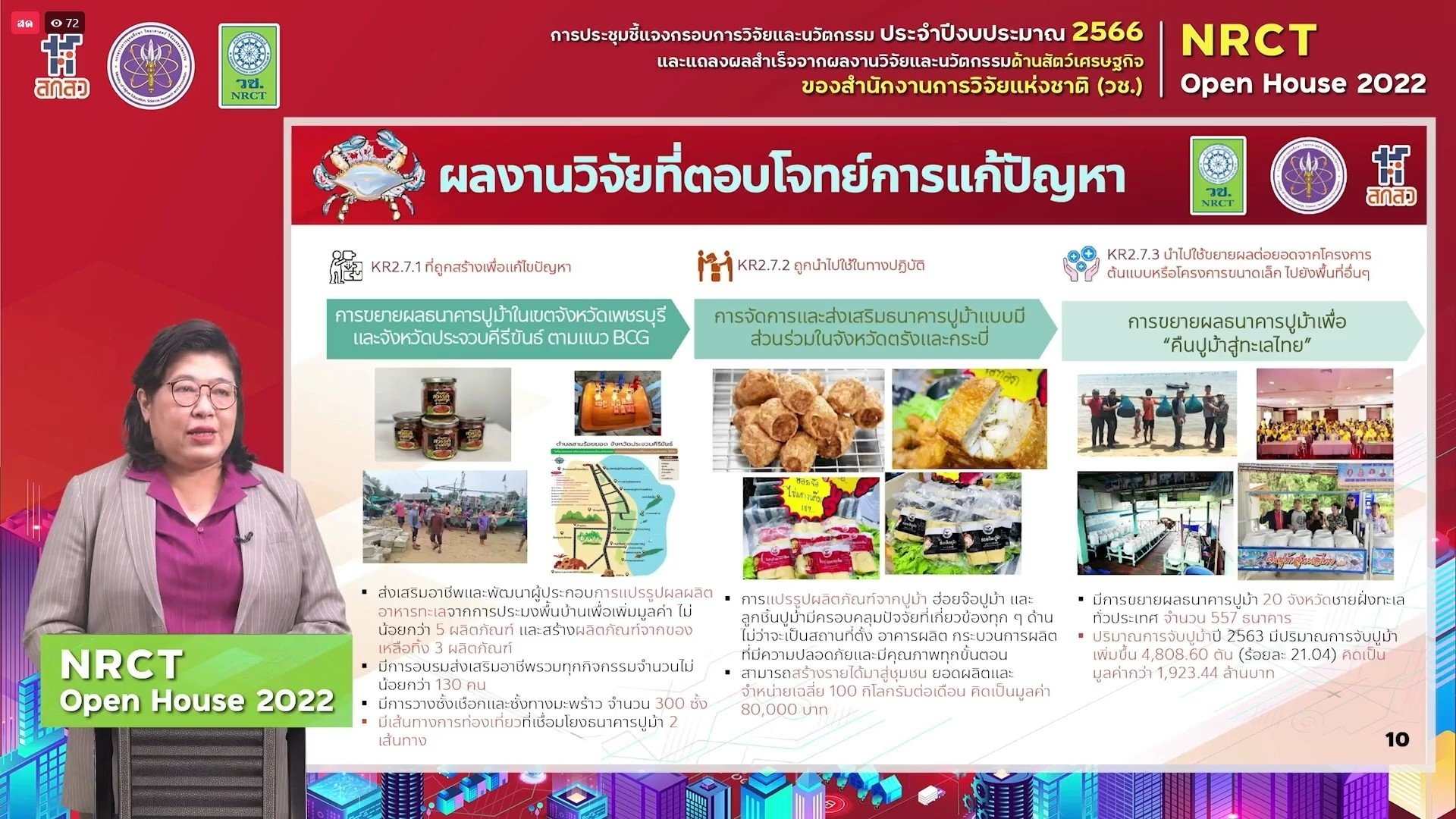 วันที่ 19 มิถุนายน 2565 สำนักงานการวิจัยแห่งชาติ (วช.) กระทรวงการอุดมศึกษา วิทยาศาสตร์ วิจัยและนวัตกรรม จัดการประชุมชี้แจงกรอบการวิจัยและนวัตกรรมประจำปีงบประมาณ 2566 การแถลงผลสำเร็จจากผลงานวิจัยและนวัตกรรม และแนวทางการเขียนและพิจารณาข้อเสนอการวิจัยและนวัตกรรม ด้านสัตว์เศรษฐกิจ NRCT Open House 2022 “วิจัยและนวัตกรรมในประเด็นท้าทายของประเทศ” เพื่อเป็นเวทีแลกเปลี่ยนประสบการณ์การเขียนข้อเสนอการวิจัยและนวัตกรรมและการยื่นขอทุน วช. ด้านสัตว์เศรษฐกิจ โดยมี ดร.วิภารัตน์ ดีอ่อง ผู้อำนวยการสำนักงานการวิจัยแห่งชาติ เป็นประธานเปิดการประชุม ณ ห้องประชุมจอมพลสฤษดิ์ ธนะรัชต์ ชั้น 2 อาคาร วช.1 สำนักงานการวิจัยแห่งชาติ และออนไลน์ผ่านระบบ Zoom รวมทั้งการถ่ายทอดสด (Live Steaming) ผ่าน Facebook ของสำนักงานการวิจัยแห่งชาติ