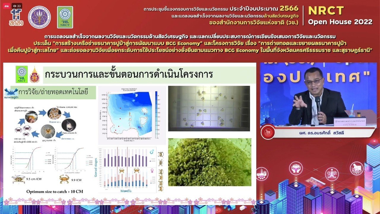 ดร.วิภารัตน์ ดีอ่อง ผู้อำนวยการสำนักงานการวิจัยแห่งชาติ กล่าวว่า วช. ภายใต้กระทรวง อว. ได้จัด การประชุมชี้แจงกรอบการวิจัยและนวัตกรรม ประจำปีงบประมาณ 2566 การแถลงผลสำเร็จจากผลงานวิจัยและนวัตกรรม และแนวทางการเขียนและพิจารณาข้อเสนอการวิจัยและนวัตกรรม โดยจัดขึ้นเป็นวันที่แปดปิดท้ายงาน NRCT Open House 2022 ด้วยการประชุมด้านสัตว์เศรษฐกิจ ปัจจุบันได้มีการนำระบบ ววน. เข้ามาส่งเสริมและสนับสนุนอาชีพทางเลือกหรืออาชีพเสริมให้แก่เกษตรกรด้วยสัตว์เศรษฐกิจ โดย วช. ได้ให้การสนับสนุนเกษตรกรในการคัดเลือกสัตว์เศรษฐกิจตัวใหม่ ๆ ที่มีโอกาสในการแข่งขันและมีต้นทุนไม่สูงมาก อาทิ ไก่พื้นเมือง จิ้งหรีด ปลาสวยงาม หรือ แพะ รวมถึง ปูม้า ซึ่งสร้างมูลค่า สร้างรายได้ให้กับเกษตรกรอย่างมาก ซึ่งในช่วง 2 – 3 ปีที่ผ่านมา วช. ยังคงสนับสนุนในการขยายผลจากนำงานวิจัยและนวัตกรรมมาช่วยในการสร้างอาชีพ สร้างรายได้ให้กับชุมชน ด้วยการขับเคลื่อนตามแนวทาง BCG โดยส่วนของสัตว์เศรษฐกิจที่ วช. ดูแล ได้ขับเคลื่อนโครงการตามยุทธศาสตร์ ววน. ซึ่งมีเป้าหมายและผลสัมฤทธิ์ที่จะช่วยขจัดความยากจน ลดความเหลื่อมล้ำโดยการลดช่องว่างของการเข้าถึงโอกาสด้านการพัฒนาอาชีพ การสร้างความเข้มแข็งและยกระดับมูลค่าเศรษฐกิจของเศรษฐกิจฐานราก ส่งเสริมองค์ความรู้ผลงานวิจัย เทคโนโลยี และนวัตกรรม ซึ่งมุ่งเน้นการพัฒนาในกลุ่มผู้ประกอบการ SMEs และในปี 2566 วช. จะเปิดรับข้อเสนอการวิจัยและนวัตกรรม ด้านสัตว์เศรษฐกิจใน 2 กลุ่มเรื่องที่สำคัญ ได้แก่ กลุ่มเรื่องสัตว์น้ำและพรรณไม้น้ำสวยงาม และกลุ่มเรื่องแพะ ซึ่งจะมุ่งเน้นในเชิงพาณิชย์ เพื่อสร้างโอกาส สร้างปัจจัย สร้างองค์ความรู้ในการผลิตให้กับนักวิจัย เกษตรกร และผู้ประกอบการ
