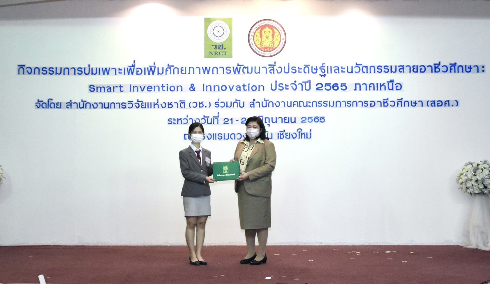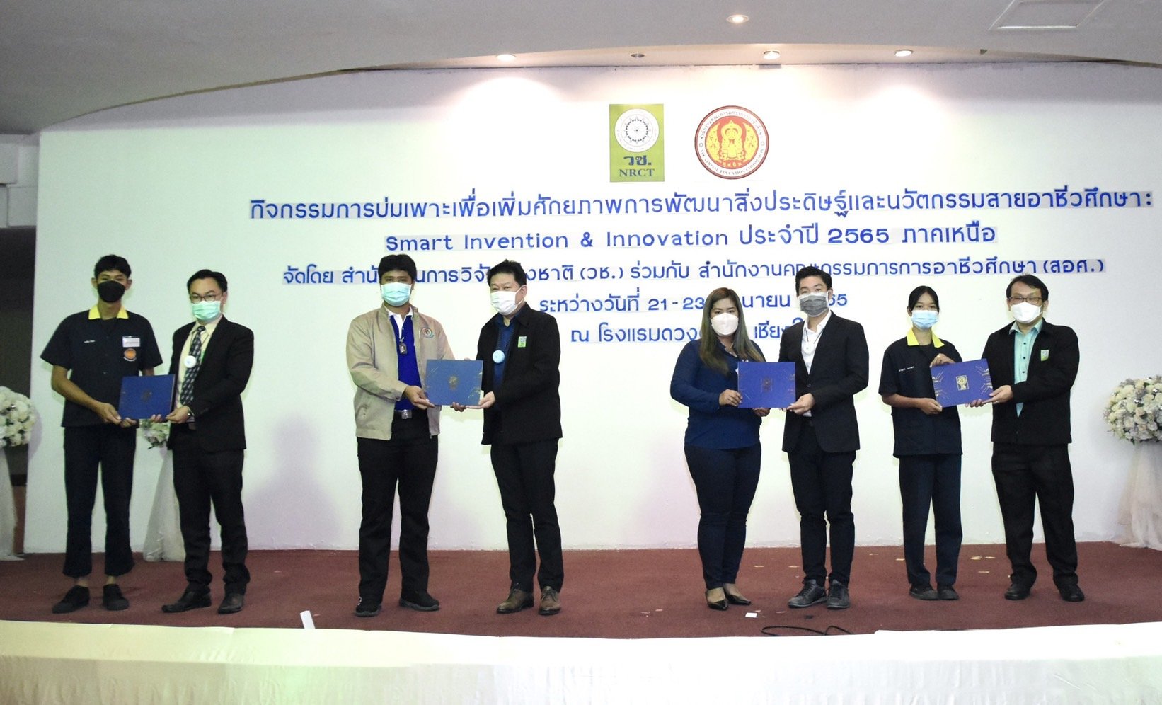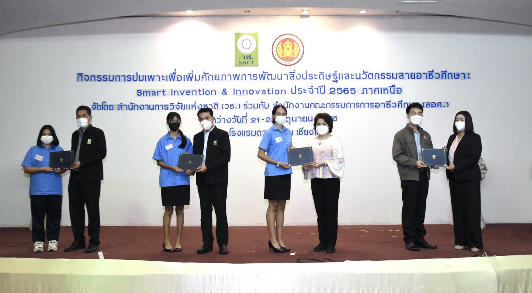 วันที่ 23 มิถุนายน 2565 ดร.วิภารัตน์ ดีอ่อง ผู้อำนวยการสำนักงานการวิจัยแห่งชาติ เป็นประธานมอบรางวัลและปิดกิจกรรมการบ่มเพาะเพื่อเพิ่มศักยภาพการพัฒนาสิ่งประดิษฐ์และนวัตกรรมสายอาชีวศึกษา Smart Invention & Innovation ภาคเหนือ ซึ่งสำนักงานการวิจัยแห่งชาติ (วช.) กระทรวงการอุดมศึกษา วิทยาศาสตร์ วิจัยและนวัตกรรม ร่วมกับ สำนักงานคณะกรรมการการอาชีวศึกษา (สอศ.) จัดขึ้นระหว่างวันที่ 21-23 มิถุนายน 2656 ที่ผ่านมา ณ โรงแรมดวงตะวัน จังหวัดเชียงใหม่