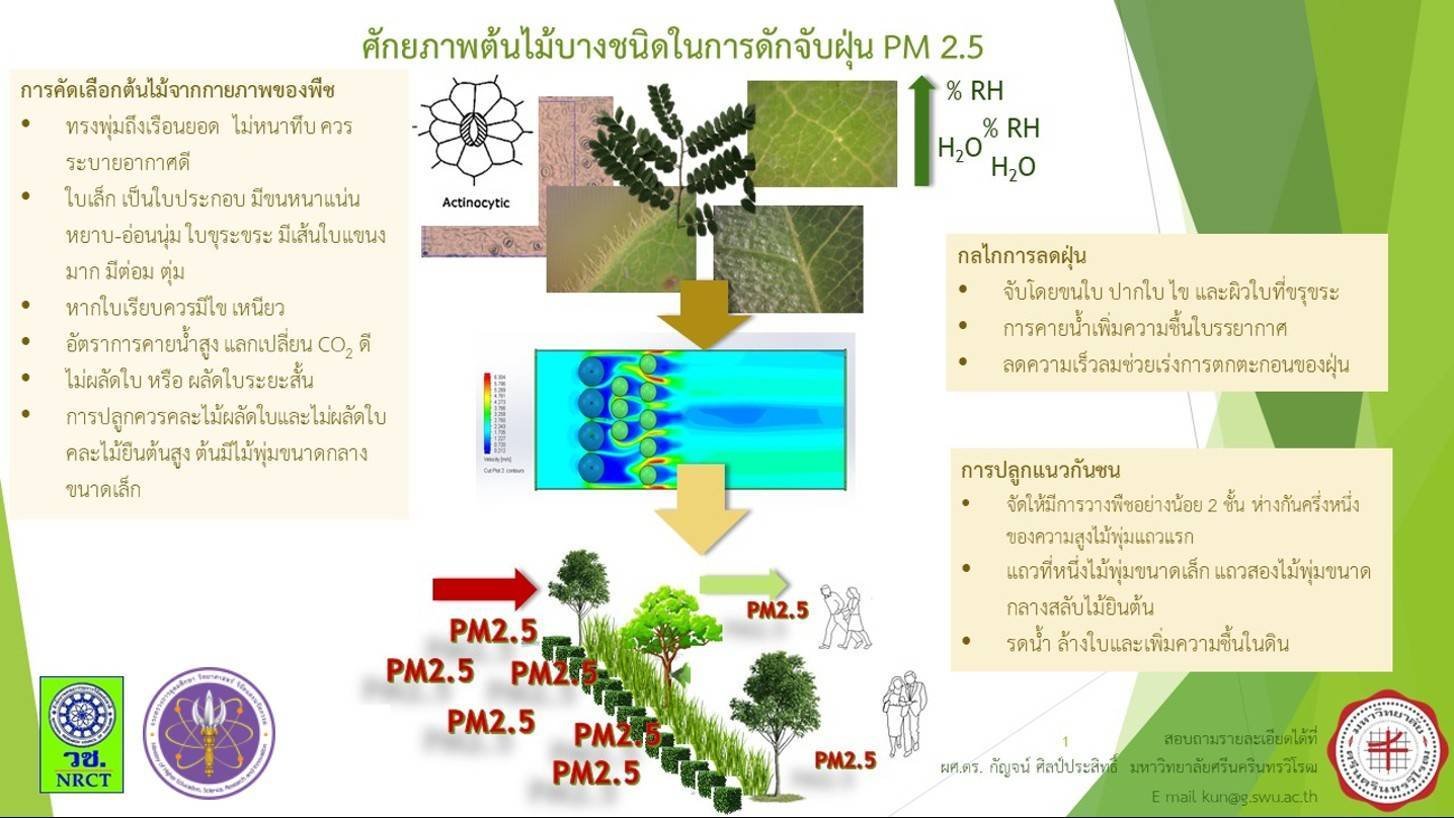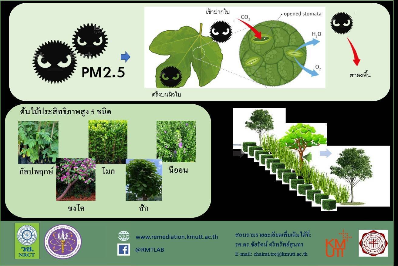 รศ.ดร.ชัยรัตน์ ตรีทรัพย์สุนทร ทีมวิจัยจากมหาวิทยาลัยเทคโนโลยีพระจอมเกล้าธนบุรี ได้สะสมองค์ความรู้ในการทดลองวิจัยในเรื่องนี้มาร่วม 10 ปี ร่วมกับ รศ.ดร.กัญจน์ ศิลป์ประสิทธิ์ จากสาขาสิ่งแวดล้อม คณะวัฒนธรรมสิ่งแวดล้อมและการท่องเที่ยวเชิงนิเวศ มหาวิทยาลัยศรีนครินทรวิโรฒ โดยแบ่งการศึกษาวิจัยเป็น 3 ส่วนด้วยกันคือ ส่วนแรกมีการคัดเลือกต้นไม้ที่เหมาะสมกับสภาพอากาศในประเทศไทย ซึ่งภาพรวมจะมีอากาศร้อนไม่เหมือนกับต่างประเทศที่ใช้พืชเมืองหนาว ส่วนที่สองคือการศึกษากลไกการตอบสนองของต้นไม้ต่อฝุ่น ลักษณะทางกายภาพของต้นไม้เช่น ลักษณะใบ ขนาดของใบ ที่มีส่วนในการส่งเสริมการดักจับฝุ่นละอองในอากาศ มหาวิทยาลัยศรีนครินทรวิโรฒ และการศึกษาการเปลี่ยนของโปรตีนเนื่องจากความเครียดของต้นไม้ที่ได้รับฝุ่น PM 2.5 ผ่านเทคโนโลยีชีวสารสนเทศ พบว่าต้นไม้มีการสร้างโปรตีนช่วยลดความเครียดเพิ่มขึ้น มีการสังเคราะห์ด้วยแสงลดลง และส่วนที่สามเป็นการจำลองรูปแบบการจัดวางต้นไม้เพื่อศึกษาความสามารถในการดักจับฝุ่นของต้นไม้ให้ได้ประสิทธิภาพที่ดีที่สุด