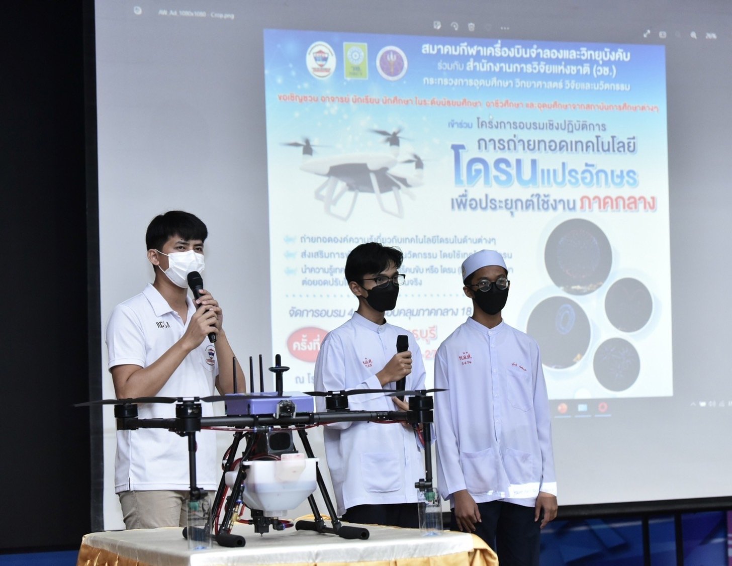ทั้งนี้ สมาคมกีฬาเครื่องบินจำลองและวิทยุบังคับ ได้รับการสนับสนุนจาก วช. จนประสบผลสำเร็จในการคิดค้นและพัฒนาซอฟต์แวร์การสั่งงานโดรนแปรอักษร กล่าวได้ว่าเป็น“โดรนแปรอักษร” ฝีมือคนไทย เป็นนวัตกรรมหนึ่งเดียวในอาเซียน และ 1 ใน 9 ของโลก ได้สร้างชื่อเสียงให้กับประเทศ ถือเป็นการยกระดับการพัฒนาเทคโนโลยีของคนไทยให้ก้าวล้ำไปอีกขั้นทัดเทียมกับเทคโนโลยีของต่างประเทศ การถ่ายทอดเทคโนโลยีโดรนแปรอักษรเพื่อประยุกต์สู่การใช้งานที่สร้างความตื่นตาตื่นใจ และแพลตฟอร์มระบบปัญญาประดิษฐ์ มีการพัฒนาและส่งเสริมให้ใช้นวัตกรรมทางเทคโนโลยี ปรับใช้เพื่อสร้างประโยชน์ทั้งทางธุรกิจ สังคม และสิ่งแวดล้อม เทียบเท่าระดับสากล ตลอดจนส่งเสริมให้เกิดการสร้างนวัตกรรม และนวัตกร ที่จะนำองค์ความรู้เทคโนโลยีอากาศยานไร้คนขับ หรือ โดรน (Drone) ที่ได้รับมาพัฒนาต่อยอดและปรับใช้กับการทำงานในด้านต่าง ๆ ให้กับนักเรียน นักศึกษาในสถาบันการศึกษาต่าง ๆ ในภาคกลาง โดยจัดการอบรมจำนวน 4 ครั้ง ซึ่งครั้งที่ 1 และ 2 ที่ผ่านมา จัดที่กรุงเทพมหานคร และจังหวัดพระนครศรีอยุธยา ครั้งนี้เป็นครั้งที่ 3 จัดที่จังหวัดเพชรบุรี และครั้งที่ 4 จะจัดที่จังหวัดราชบุรี ในวันที่ 3 – 5 กันยายน 2565 อบรมครั้งละ 50 คน รวมจำนวนผู้เข้าอบรมรวมทั้งสิ้น 200 คน เป็นการอบรมบ่มเพาะเชิงบูรณาการ ซึ่งจะเป็นการสนับสนุนให้ผู้เรียนได้ลงมือปฏิบัติและลงมือทำในสิ่งต่าง ๆ ในสภาพแวดล้อมจริง ได้ฝึกคิด ฝึกทำ ฝึกทักษะ ฝึกปฏิบัติด้วยตนเองผ่านกิจกรรม “โดรนแปรอักษร”