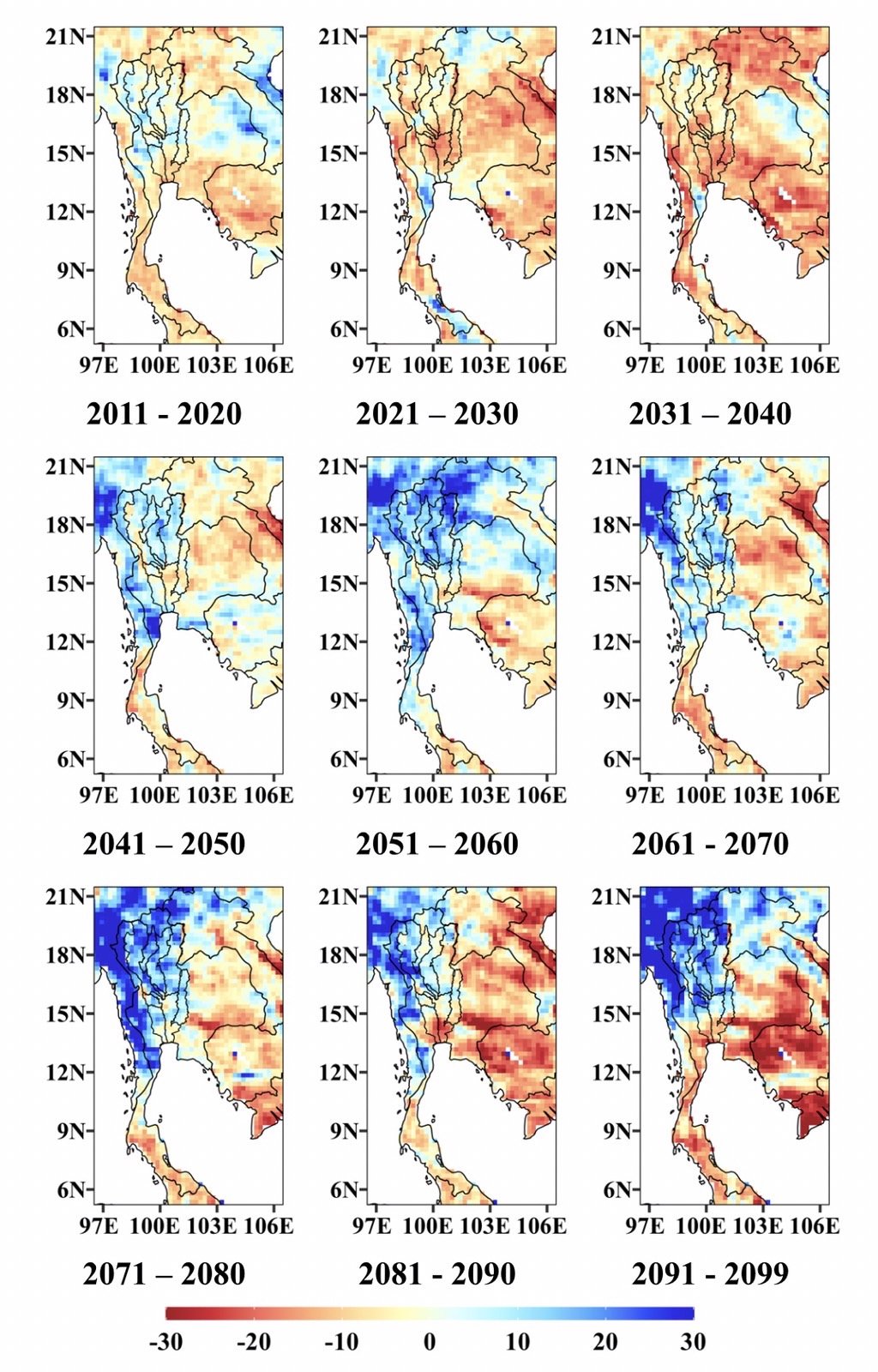 ผศ.ดร.จิรสรณ์ สันติสิริสมบูรณ์ หัวหน้าโครงการวิจัยศึกษาเปรียบเทียบการเปลี่ยนแปลงกระบวนการทางอุทกวิทยาและฟลักซ์ ของลุ่มน้ำจิวหลงและลุ่มน้ำเจ้าพระยา ศูนย์วิจัยการเปลี่ยนแปลงภูมิอากาศระดับภูมิภาคและพลังงานทดแทน มหาวิทยาลัยรามคำแหง เปิดเผยว่า การศึกษาวิจัยดังกล่าวเป็นความร่วมมือระหว่างนักวิจัยไทย และ จีน โดยใช้ลุ่มน้ำเจ้าพระยาเป็นโมเดลในการศึกษาเปรียบเทียบกับลุ่มน้ำจิวหลง ของจีน เนื่องจากมีลักษณะภูมิประเทศและภูมิอากาศใกล้เคียงกับประเทศไทย ทั้งนี้การศึกษาได้ขยายไปถึงลุ่มน้ำซึ่งเป็นต้นน้ำของลุ่มน้ำเจ้าพระยา ได้แก่ ลุ่มน้ำปิง วัง ยม น่าน และลุ่มน้ำอื่นที่เกี่ยวข้อง ข้อมูลจากแบบจำลองการคาดประมาณการเปลี่ยนแปลงภูมิอากาศในอนาคตที่ใช้ในการศึกษานี้ เป็นผลจากโครงการวิจัย SEACLID / CORDEX Southeast Asia ซึ่งเป็นความร่วมมือระหว่าง RU-CORE และนักวิจัยในภูมิภาคเอเชียตะวันออกเฉียงใต้ ได้แก่ ประเทศมาเลเซีย ฟิลิปปินส์ เวียดนาม และอินโดนีเซีย โดยได้มีการทดสอบการจำลองภูมิอากาศวิทยา ( climatology ) ในอดีตของประเทศไทยของแบบจำลองดังกล่าว เปรียบเทียบกับค่าจากการตรวจวัดเพื่อสร้างความเชื่อมั่น ในข้อมูลคาดประมาณการเปลี่ยนแปลงสภาพภูมิอากาศในอนาคต แบบจำลองทางอุทกวิทยาที่พัฒนาขึ้นมานี้ ได้จำลองเหตุการณ์ในอดีตโดยใช้ข้อมูลภูมิอากาศในช่วงปี ค.ศ. 1970 - ค.ศ.2005 และการคาดประมาณอนาคตในช่วงปี ค.ศ. 2006 - ค.ศ. 2060 ผลการคาดประมาณการเปลี่ยนแปลงภูมิอากาศในอนาคต พบว่าประเทศไทยมีแนวโน้มที่ปริมาณฝนจะลดลง ซึ่งเป็นสัญญาณความถี่ของปีที่จะประสบปัญหาภัยแล้ง มากกว่าปีที่จะประสบปัญหาอุทกภัย แต่จะมีแนวโน้มของฝนที่ตกหนักมากขึ้น ซึ่งเป็นสัญญาณของการเกิดน้ำท่วมฉับพลัน แนวโน้มการเปลี่ยนแปลงภูมิอากาศดังกล่าว จะส่งผลกระทบโดยตรงต่อการผลิตในภาคการเกษตรและความมั่นคงทางอาหารการขยายผลต่อยอดองค์ความรู้นี้ ทุกภาคส่วนต้องร่วมมือกันในการบูรณาการวางแผนรับมือในเรื่องบริหารจัดการน้ำ อาทิ พิจารณาปรับลดพื้นที่เพาะปลูกพืชที่ต้องการปริมาณน้ำมาก เพิ่มพื้นที่ป่าต้นน้ำเพื่อรักษาระบบนิเวศ เป็นต้น ซึ่งสอดคล้องกับแผนปฏิบัติการด้านเทคโนโลยีเพื่อรองรับการเปลี่ยนแปลงสภาพภูมิอากาศของประเทศไทย ในการปรับตัวของภาคการเกษตร ( พ.ศ.2558-2567 ) ซึ่งมีเป้าหมายให้ภาคเกษตรไทยปรับตัวต่อการเปลี่ยนแปลงสภาพภูมิอากาศ ด้วยการใช้เทคโนโลยีและนวัตกรรมเพื่อรักษา และเพิ่มประสิทธิภาพการผลิต และสร้างความยั่งยืนของภาคเกษตร อย่างไรก็ตามการศึกษาวิจัยการเปลี่ยนแปลงของสภาพภูมิอากาศจำเ