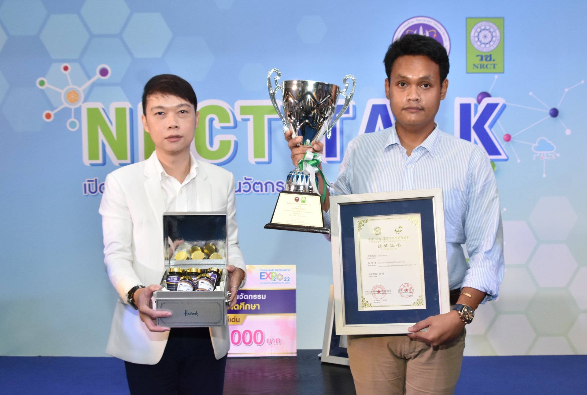 วช. ได้นำผลิตภัณฑ์เพื่อสุขภาพ “ซินไบโอ โทโทล ไรซ์” (SYNBIO TOTAL RICE) ของนายฐาปกรณ์ ชุมพล นักศึกษามหาวิทยาลัยเกษตรศาสตร์ วิทยาเขตกำแพงแสน โดยมีผู้ช่วยศาสตราจารย์ ดร.ศรัณย์ พรหมสาย อาจารย์ภาควิชาจุลชีววิทยา คณะศิลปศาสตร์และวิทยาศาสตร์ มหาวิทยาลัยเกษตรศาสตร์ วิทยาเขตกำแพงแสน เป็นอาจารย์ที่ปรึกษา ซึ่งผลงานวิจัยดังกล่าวได้รับรางวัลนวัตกรรมสายอุดมศึกษาประจำปี 2565 ระดับดีเด่น สาขาการสาธารณสุขและเทคโนโลยีทางการแพทย์ (ระดับบัณฑิตศึกษา) และการที่ วช.