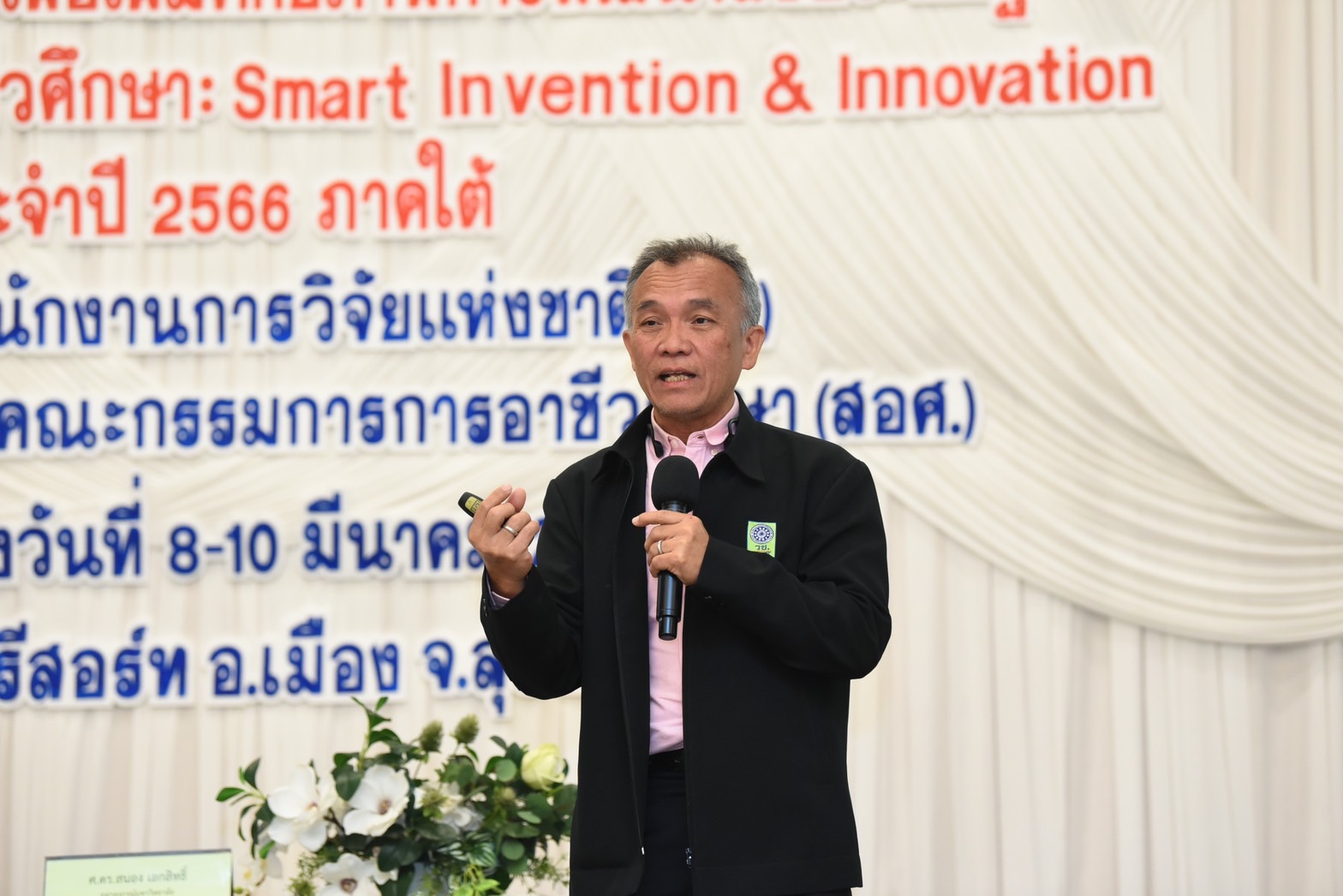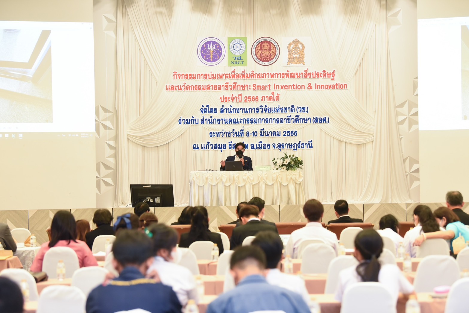 เมื่อวันที่ 8 มีนาคม 2566 ที่ผ่านมา สำนักงานการวิจัยแห่งชาติ (วช.) กระทรวงการอุดมศึกษา วิทยาศาสตร์ วิจัยและนวัตกรรม ร่วมกับ สำนักงานคณะกรรมการการอาชีวศึกษา (สอศ.) จัดกิจกรรม“การบ่มเพาะเพื่อเพิ่มศักยภาพการพัฒนาสิ่งประดิษฐ์และนวัตกรรมสายอาชีวศึกษา : Smart Invention & Innovation ประจำปี 2566 ภาคใต้” โดยมี ดร.วิภารัตน์ ดีอ่อง ผู้อำนวยการสำนักงานการวิจัยแห่งชาติ เป็นประธานเปิดงานพร้อมปาฐกถาพิเศษ เรื่อง “พัฒนาคน พัฒนาอาชีวะ : เพื่อการพัฒนาประเทศอย่างยั่งยืน” พร้อม คณะผู้ทรงคุณวุฒิ วช. คณะผู้บริหาร สอศ. ให้เกียรติเข้าร่วมงาน โดยว่าที่ร้อยตรี ธนุ วงษ์จินดา เลขาธิการคณะกรรมการการอาชีวศึกษา บรรยายพิเศษเรื่อง “ยกระดับพลังอาชีวะ ด้วยวิจัยและนวัตกรรมเพื่อสร้างชาติ” เพื่อส่งเสริมและสนับสนุนการพัฒนาศักยภาพของนักเรียน นักศึกษาสายอาชีวศึกษา ให้เกิดแรงจูงใจในการคิดค้นผลงานประดิษฐ์และนวัตกรรม เพื่อใช้ในประเทศ ณ แก้วสมุย รีสอร์ท จังหวัดสุราษฎร์ธานี