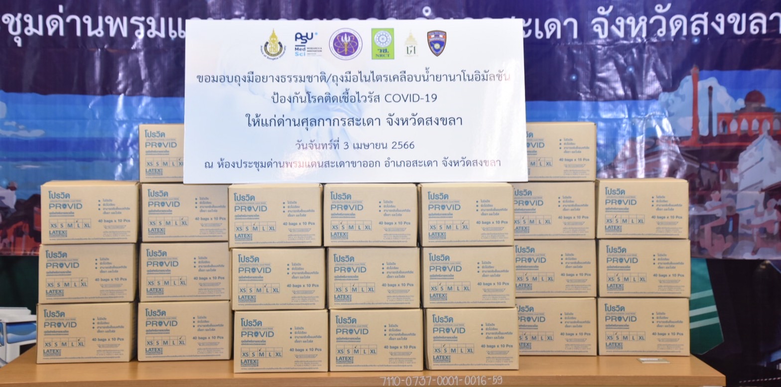 วันที่ 3 เมษายน 2566 สำนักงานการวิจัยแห่งชาติ (วช.) กระทรวงการอุดมศึกษา วิทยาศาสตร์ วิจัยและนวัตกรรม ส่งมอบ “นวัตกรรมถุงมือยางธรรมชาติ ถุงมือไนไตรเคลือบน้ำยานาโนอิมัลชันป้องกันโรคติดเชื้อไวรัส COVID-19” จำนวนกว่า 50,000 คู่ เพื่อใช้ในพื้นที่เสี่ยงด่านสะเดา อำเภอสะเดา จังหวัดสงขลา โดยมี นายวรณัฎฐ์ หนูรอต รองผู้ว่าราชการจังหวัดสงขลา ให้เกียรติต้อนรับ ณ ด่านตรวจคนเข้าเมือง อำเภอสะเดา จังหวัดสงขลา โดยการมอบถุงมือฯ ในครั้งนี้ ดร.วิภารัตน์ ดีอ่อง ผู้อำนวยการสำนักงานการวิจัยแห่งชาติ ได้มอบหมายให้ นายชาญณรงค์ มณีรัตน์ ผู้อำนวยการกลุ่มสารนิเทศและประชาสัมพันธ์ วช. เป็นประธานส่งมอบให้กับด่านศุลกากรสะเดา ด่านกักสัตว์สงขลา ด่านตรวจพืชสะเดา ด่านอาหารและยาสะเดา โรงพยาบาลสะเดา โรงพยาบาลปาดังเบซาร์ สำนักงานตรวจคนเข้าเมืองจังหวัดสงขลา ด่านตรวจคนหางานสะเดา ด่านตรวจสัตว์ป่าสะเดา ด่านตรวจสัตว์น้ำสะเดา ด่านควบคุมโรคติดต่อระหว่างประเทศสะเดา และสำนักงานป้องกันควบคุมโรคที่ 12 จังหวัดสงขลา เพื่อใช้ในการป้องกันโรคติดเชื้อไวรัส Covid-19 และโรคติดเชื้ออื่นๆ ในพื้นที่เสี่ยง ซึ่งนวัตกรรมดังกล่าว เป็นผลงานที่ วช. ให้การสนับสนุนทุนวิจัยในโครงการ “ถุงมือยางธรรมชาติ/ถุงมือไนไตรเคลือบน้ำยานาโนอิมัลชันป้องกันโรคติดเชื้อไวรัส Covid-19 ในพื้นที่เสี่ยง” โดยมี ผศ.นพ.วรวิทย์ วาณิชย์สุวรรณ ผู้อำนวยการสถาบันวิจัยและนวัตกรรมทางการแพทย์ มหาวิทยาลัยสงขลานครินทร์ เป็นหัวหน้าโครงการ