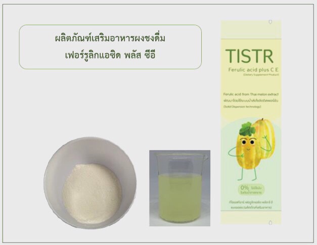 2) เฟอร์รูลิกแอซิด พลัส ซีอี (Ferulic acid plus CE) มีจุดเด่นคือ เป็นผลิตภัณฑ์เสริมอาหารผงชงดื่มชนิดแรกที่พัฒนาจากสารสกัดแตงไทยในรูปแบบโซลิดดิสเพอร์ชัน มีสารสำคัญ ได้แก่ กรดเฟอรูลิก สกัดจากเปลือกแตงไทย ผ่านการทดสอบฤทธิ์ทางชีวภาพว่ามีฤทธิ์ต้านอนุมูลอิสระ ต้านการอักเสบ ต้านการชรา และป้องกันความเสียหายจากรังสี UVA ในเซลล์ผิวหนัง โดยระบบนำส่งโซลิดดิสเพอร์ชันสามารถเพิ่มค่าการละลาย ส่งผลให้การดูดซึมและชีวประสิทธิผลดีขึ้น ไม่มีไขมัน ไม่มีน้ำตาลทราย ละลายได้ในของเหลว ง่ายต่อการรับประทาน ไม่ก่อให้เกิดความเป็นพิษ เมื่อทดสอบความเป็นพิษเฉียบพลันทางปากในสัตว์ทดลองและมีความคงตัว (stability)