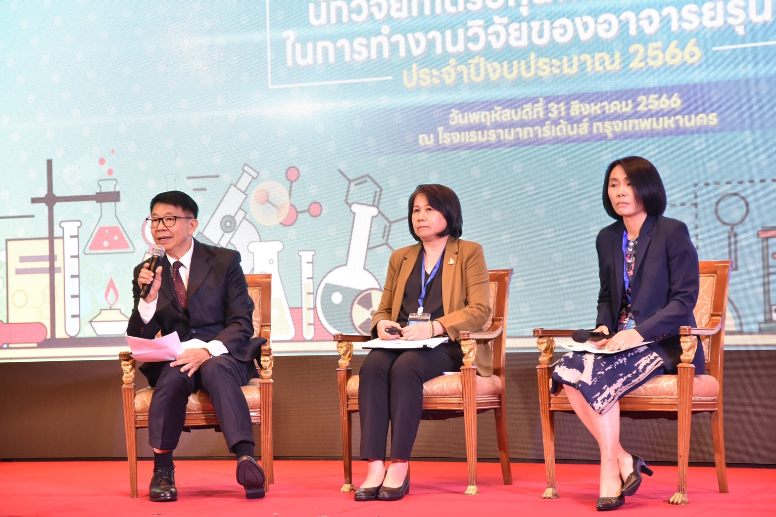 วันที่ 31 สิงหาคม 2566 สำนักงานการวิจัยแห่งชาติ (วช.) กระทรวงการอุดมศึกษา วิทยาศาสตร์ วิจัยและนวัตกรรม จัดโครงการ “ปฐมนิเทศผู้ที่ได้รับทุนพัฒนาศักยภาพในการทำงานวิจัยของอาจารย์รุ่นใหม่ ประจำปีงบประมาณ 2566” เพื่อให้นักวิจัยรุ่นใหม่ตระหนักถึงความสำคัญในการพัฒนาศักยภาพในการทำงานวิจัยของอาจารย์รุ่นใหม่ในสถาบันอุดมศึกษาระดับปริญญาในประเทศไทย มีโอกาสได้ทำงานวิจัยอย่างต่อเนื่อง สร้างสมประสบการณ์ และพัฒนาไปสู่การเป็นนักวิจัยที่มีคุณภาพระดับสูงของประเทศ โดยมี ศ.เกียรติคุณ ดร.วิชัย ริ้วตระกูล ประธานคณะกรรมการบริหารโครงการทุนพัฒนาศักยภาพในการทำงานวิจัยของอาจารย์รุ่นใหม่ เป็นประธานเปิดการปฐมนิเทศ และได้รับเกียรติจาก ศ.กิตติคุณ นพ.สุทธิพร จิตต์มิตรภาพ ประธานกรรมการส่งเสริมวิทยาศาสตร์ วิจัยและนวัตกรรม (กสว.) มาบรรยายพิเศษ เรื่อง “ทิศทางการส่งเสริมและพัฒนานักวิจัยรุ่นใหม่ในระบบ ววน. ของประเทศ” พร้อมนี้ ดร.วิภารัตน์ ดีอ่อง ผู้อำนวยการสำนักงานการวิจัยแห่งชาติ พร้อมด้วย คณะผู้บริหาร วช. และผู้ทรงคุณวุฒิ ให้การต้อนรับ ณ ห้องแกรนด์บอลรูม โรงแรมรามาการ์เด้นส์ กรุงเทพมหานคร