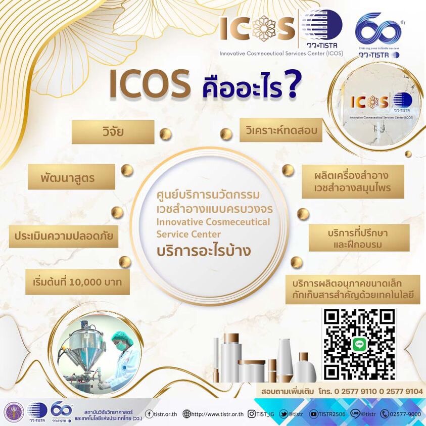 อนึ่ง ศูนย์บริการนวัตกรรมเวชสำอางแบบครบวงจร วว. (Innovative Cosmetic Services Center : ICOS) เป็นหน่วยงานในสังกัด ศูนย์เชี่ยวชาญนวัตกรรมผลิตภัณฑ์สมุนไพร เป็นหนึ่งในโครงสร้างพื้นฐานของ วว. เพื่อตอบสนองอุตสาหกรรมเครื่องสำอางในการผลิตสินค้าหรือบริการ มุ่งตอบทุกโจทย์ เพื่อความงามที่เหนือกว่า (Total Solutions for Beyond Beauty) มุ่งเน้นการบริการผลิตเครื่องสำอางที่มีคุณภาพและมีมาตรฐาน ตามแนวทางวิธีการที่ดีในการผลิตเครื่องสำอางอาเซียน (ASEAN Guidelines for Cosmetic Good Manufacturing Practice) สามารถตอบโจทย์ความต้องการของผู้ประกอบการ ด้วยการให้บริการที่เป็น Total Solution เบ็ดเสร็จและครบวงจร มีกรอบการให้บริการอย่างครบวงจร ครอบคลุมในด้านต่างๆ ของอุตสาหกรรมการผลิตเครื่องสำอาง