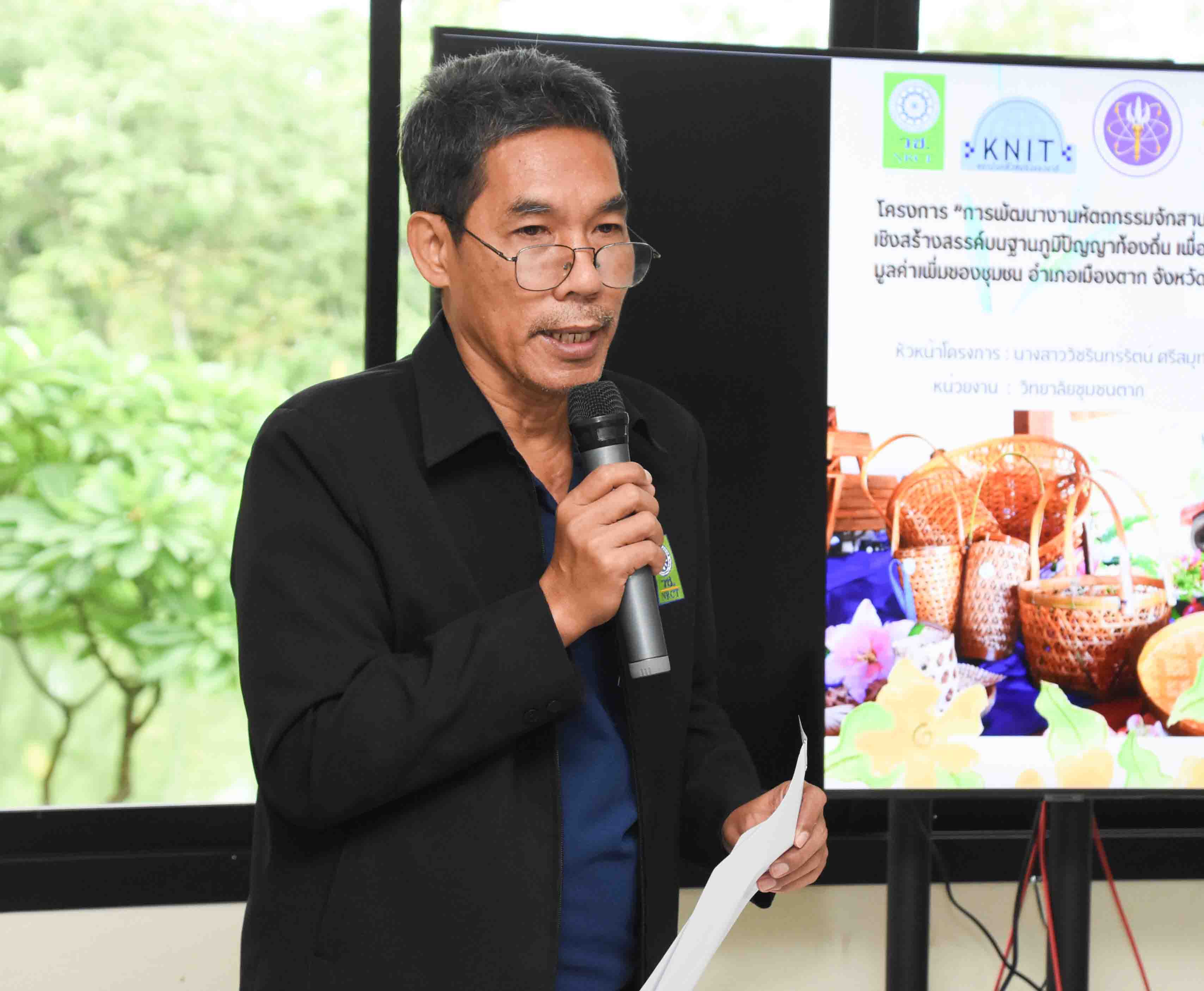 นายธีรวัฒน์ บุญสมผู้อำนวยการกองส่งเสริมและสนับสนุนการวิจัยและนวัตกรรม กล่าวว่า สำนักงานการวิจัยแห่งชาติ ( วช.) กระทรวงการอุดมศึกษา วิทยาศาสตร์ วิจัยและนวัตกรรม เป็นหน่วยงานที่มีบทบาทการบริหารจัดการงานวิจัย โดยการสนับสนุนทุนวิจัย เพื่อช่วยเหลือชุมชนและยกระดับการเปลี่ยนแปลงผ่านองค์ความรู้จากงานวิจัย การลงพื้นที่ในครั้งนี้ เป็นการติดตามผลงานวิจัยภายใต้โครงการวิจัยเพื่อท้องถิ่น CBR ที่ดำเนินการโดยวิทยาลัยชุมชนจังหวัดตากที่เข้ามาช่วยขับเคลื่อนงานหัตถกรรมจักสานไม้ไผ่เชิงสร้างสรรค์บนฐานภูมิปัญญาท้องถิ่น เพื่อสร้างมูลค่าเพิ่มของชุมชนอำเภอเมืองตาก จังหวัดตาก” ถือเป็นสิ่งที่ดี และตอบโจทย์การยกระดับเศรษฐกิจฐานรากได้อย่างชัดเจน และเป็นต้นแบบสำหรับการยกระดับวิสาหกิจผู้ประกอบการรายย่อยเป็นอย่างดี