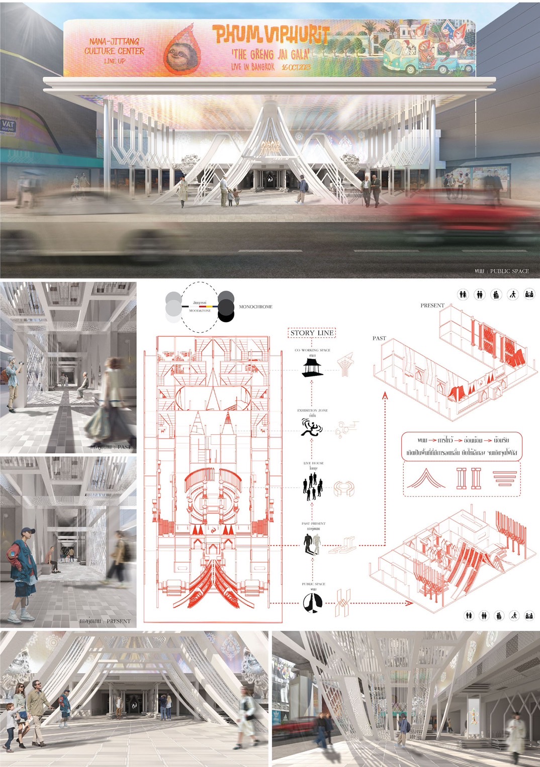 ด้านผลงาน “ศูนย์วัฒนธรรมไทยสร้างสรรค์เพื่อสนับสนุนศิลปินอินดี้-ป็อปและนักวาดภาพประกอบ” ของน้องปลา มีจุดเริ่มต้นจากการชอบดูงานศิลปะ ชอบฟังเพลงและติดตามศิลปินมากมาย จึงเกิดเป็นแรงบันดาลใจในการออกแบบพื้นที่แสดงงานศิลปะ โดยเชื่อมโยงระหว่างศิลปินและแฟนคลับทั้งสองรุ่น ให้ได้มีพื้นที่นำเสนอผลงานที่แสดงถึงเอกลักษณ์ของความเป็นไทย