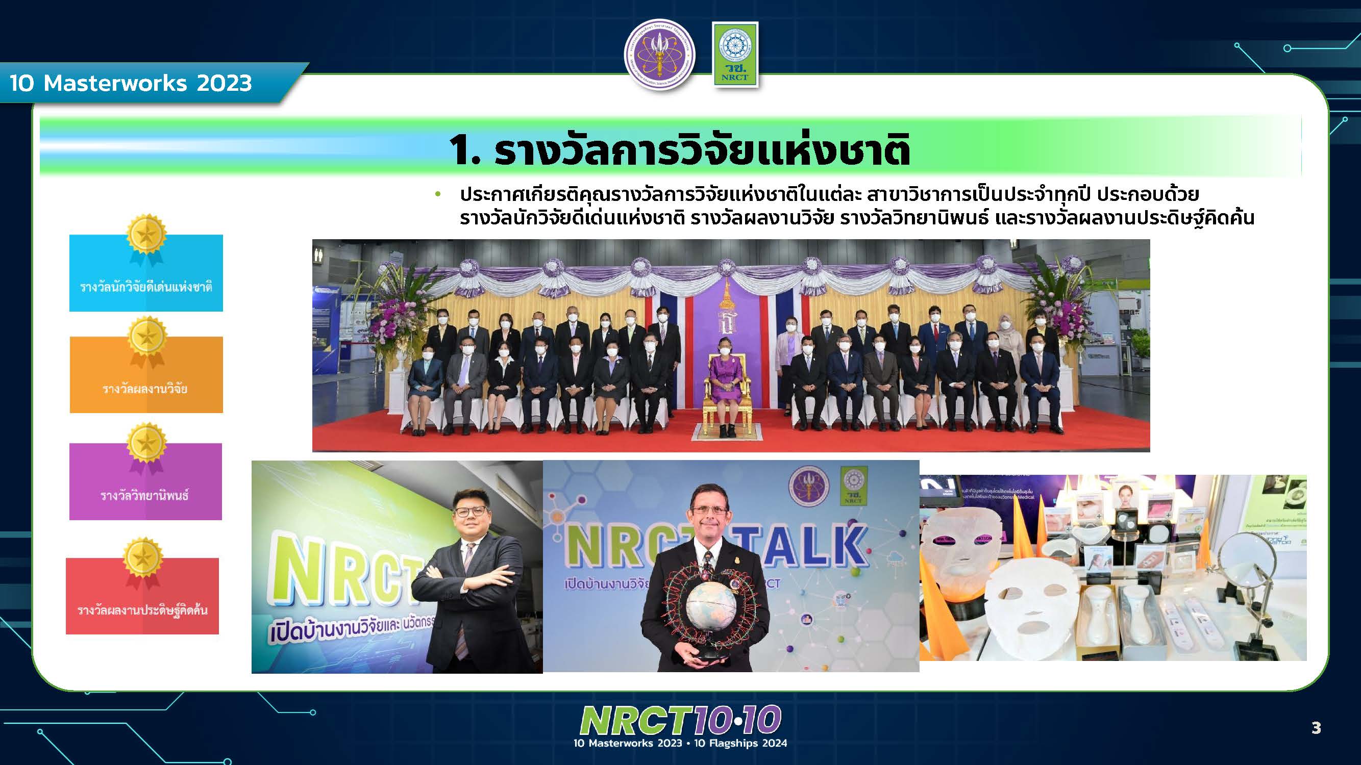 วันที่ 28 ธันวาคม 2566 ดร.วิภารัตน์ ดีอ่อง ผู้อำนวยการสำนักงานการวิจัยแห่งชาติ แถลงข่าว 10 ผลงานเด่นการวิจัยและนวัตกรรม ปี 2566 จากการขับเคลื่อนและบริหารจัดการทุนวิจัยและนวัตกรรมของประเทศให้เกิดผลลัพธ์อย่างเป็นรูปธรรม ตลอดจนการเผยแพร่ผลงานวิจัยสู่สาธารณะ และการมอบรางวัลการวิจัยแห่งชาติ พร้อมเปิดตัว 10 Flagships งานวิจัย ปี 2567 “การขับเคลื่อนการวิจัยและนวัตกรรมของประเทศ สู่ความเป็นเลิศ และนำประเทศไทยไปสู่การพัฒนาที่ยั่งยืน”