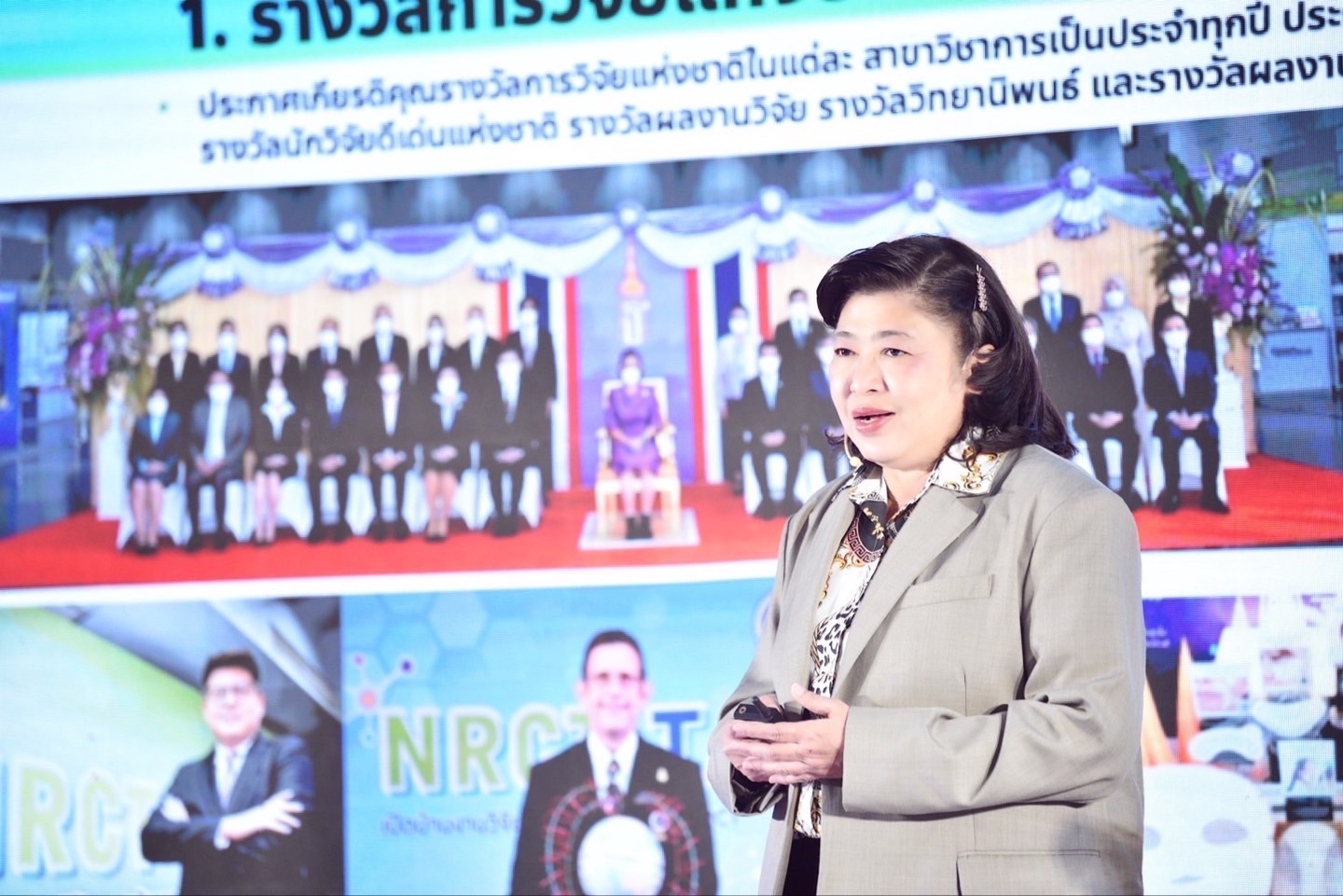 ดร.วิภารัตน์ ดีอ่อง ผู้อำนวยการสำนักงานการวิจัยแห่งชาติ กล่าวว่า สำนักงานการวิจัยแห่งชาติ (วช.) ภายใต้กระทรวงการอุดมศึกษาวิทยาศาสตร์ วิจัยและนวัตกรรม เป็นผู้นำการสร้างสรรค์งานวิจัยและนวัตกรรมสู่การใช้ประโยชน์ในทุกมิติ เพื่อยกระดับขีด ความสามารถในการแข่งขันของประเทศให้ทันต่อสถานการณ์โลก โดยมุ่งเน้นการวิจัยและพัฒนาที่ตอบโจทย์ท้าทายสังคมและประเทศ ครอบคลุมสาขาต่าง ๆ โดยปี 2566 วช. มี 10 ผลงานเด่นการวิจัยและนวัตกรรม ดังนี้ รางวัลการวิจัยแห่งชาติ ประกอบด้วย รางวัลนักวิจัยดีเด่นแห่งชาติ รางวัลผลงานวิจัย รางวัลวิทยานิพนธ์ และรางวัลผลงานประดิษฐ์คิดค้น การประกวดในเวทีระดับนานาชาติ วช. ได้คัดเลือกและนำส่งผลงานเข้าร่วมประกวดในเวทีนานาชาติของประเทศไทยกว่า 300 ผลงานต่อปี และสามารถคว้ารางวัลจากทุกเวทีมาได้มากมาย ศูนย์สารสนเทศกลางด้านวิทยาศาสตร์ วิจัยและนวัตกรรม อาทิ ระบบข้อมูลสารสนเทศวิจัยและนวัตกรรมแห่งชาติ National Research and Innovation Information System: NRIIS และ จดหมายเหตุการอุดมศึกษา วิทยาศาสตร์ วิจัยและนวัตกรรมของประเทศ และดัชนีการวิจัยและนวัตกรรมของประเทศ งานวิจัยด้านผลผลิตการเกษตรในระดับส่งออก อาทิ การพัฒนาและยืดอายุการเก็บรักษาทุเรียนสดแบบแกะพู และการฉายรังสีต่อคุณภาพหลังการเก็บเกี่ยว มะม่วงมหาชนกและส้มโอเพื่อการส่งออกประเทศสหรัฐอเมริกา งานวิจัยด้านการแพทย์และสาธารณสุข อาทิ นวัตกรรม Software Smart Bed นวัตกรรมป้องกันการเกิดแผลกดทับ นวัตกรรมเท้าเทียมไดนามิกเอสเพส (sPace) และโครงการวิจัยท้าทายไทย : ประเทศไทยไร้พยาธิใบไม้ตับ หรือ Fluke Free Thailand งานวิจัยด้านทรัพยากรธรรมชาติ และสิ่งแวดล้อม อาทิ นวัตกรรม “ระบบข้อมูลคุณภาพอากาศแบบเบ็ดเสร็จ” หรือ “ศูนย์เฝ้าระวังคุณภาพอากาศ (Air Quality Information Center: AQIC)” และ สวน “ภูมิทัศน์พรรณไม้ลด PM2.5” การพัฒนาสมรรถนะด้วยปัญญาประดิษฐ์: เทคโนโลยีโดรน อาทิ การบินโดรนแปรอักษรหรือสัญลักษณ์ต่าง ๆ เพื่อยกระดับการท่องเที่ยวในพื้นที่ โดรนประเมินความเสี่ยงปัญหาภัยแล้งให้เกษตรกร และโดรนบรรทุกสารดับเพลิง เพื่อการสนับสนุนและลดความเสี่ยงของการดับไฟป่า งานวิจัยเพื่อเตรียมรับสังคมสูงวัย อาทิ โครงการเปลี่ยนเกษียณเป็นพลัง ศูนย์พัฒนาความรู้ด้านการวิจัยและนวัตกรรม อาทิ ศูนย์เกษตรวิถีเมือง พื้นที่แห่งการเรียนรู้นวัตกรรมการปลูกพืชในเมือง ศูนย์พัฒนาสิ่งประดิษฐ์เพื่ออนาคตและความยั่งยืน