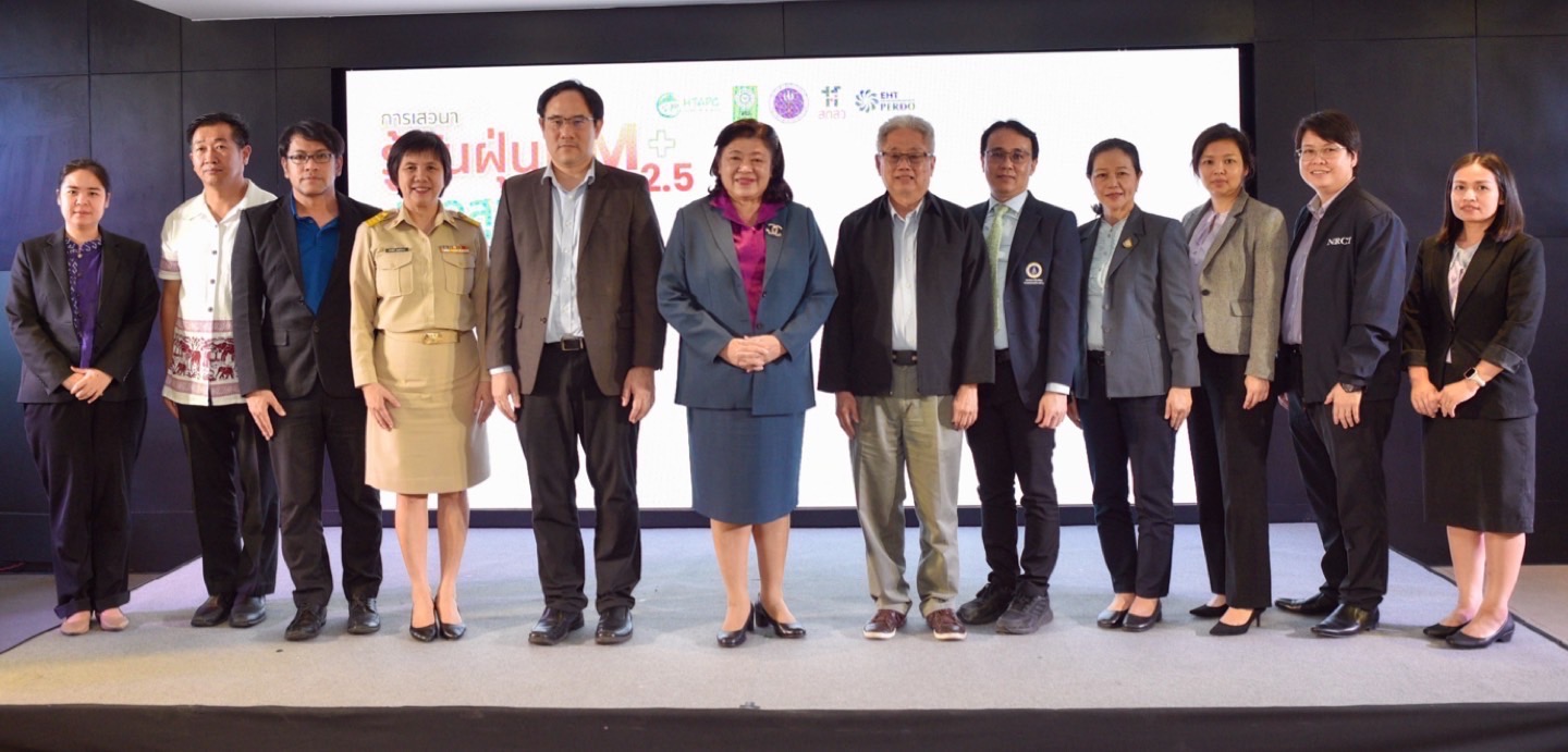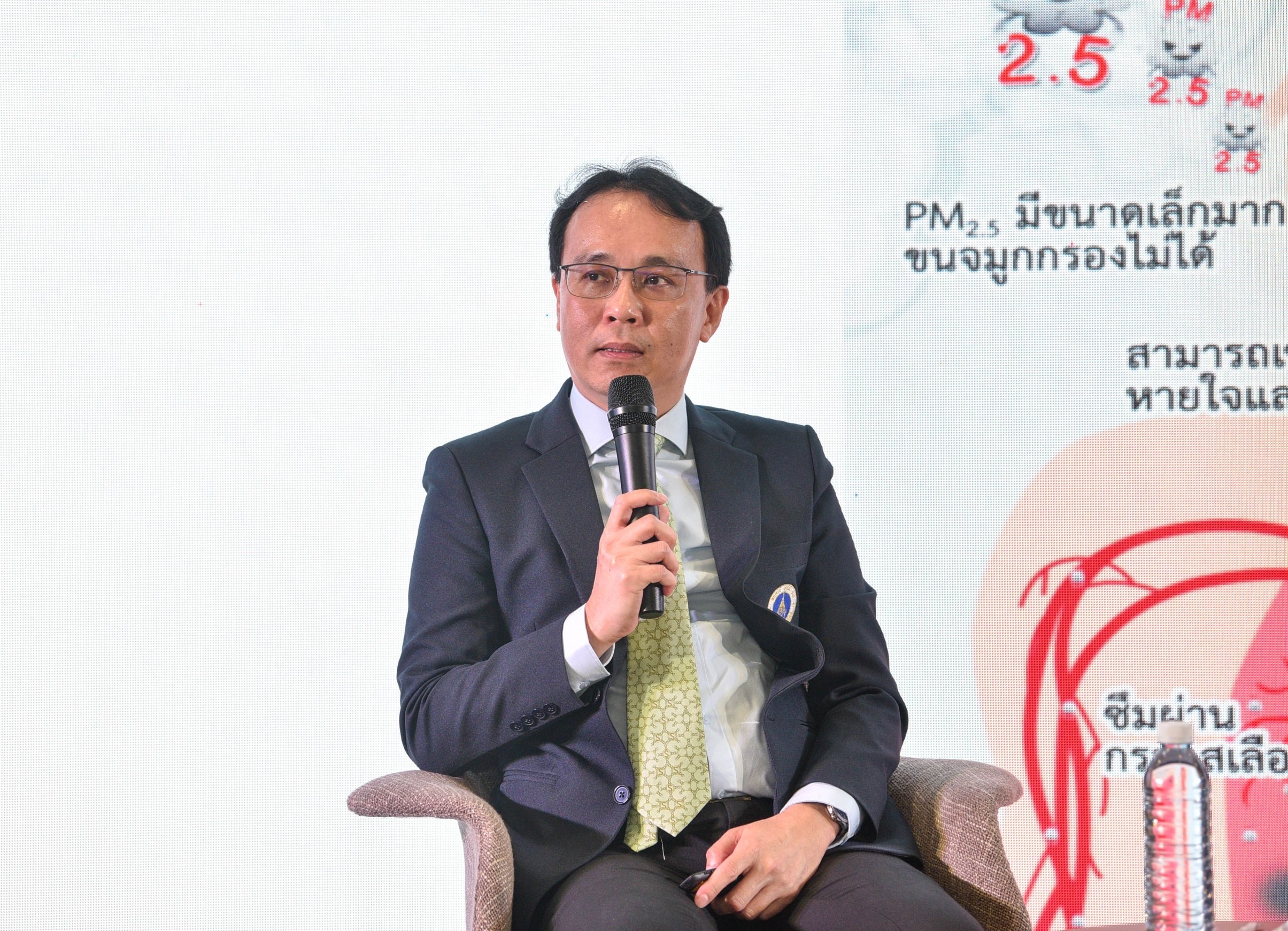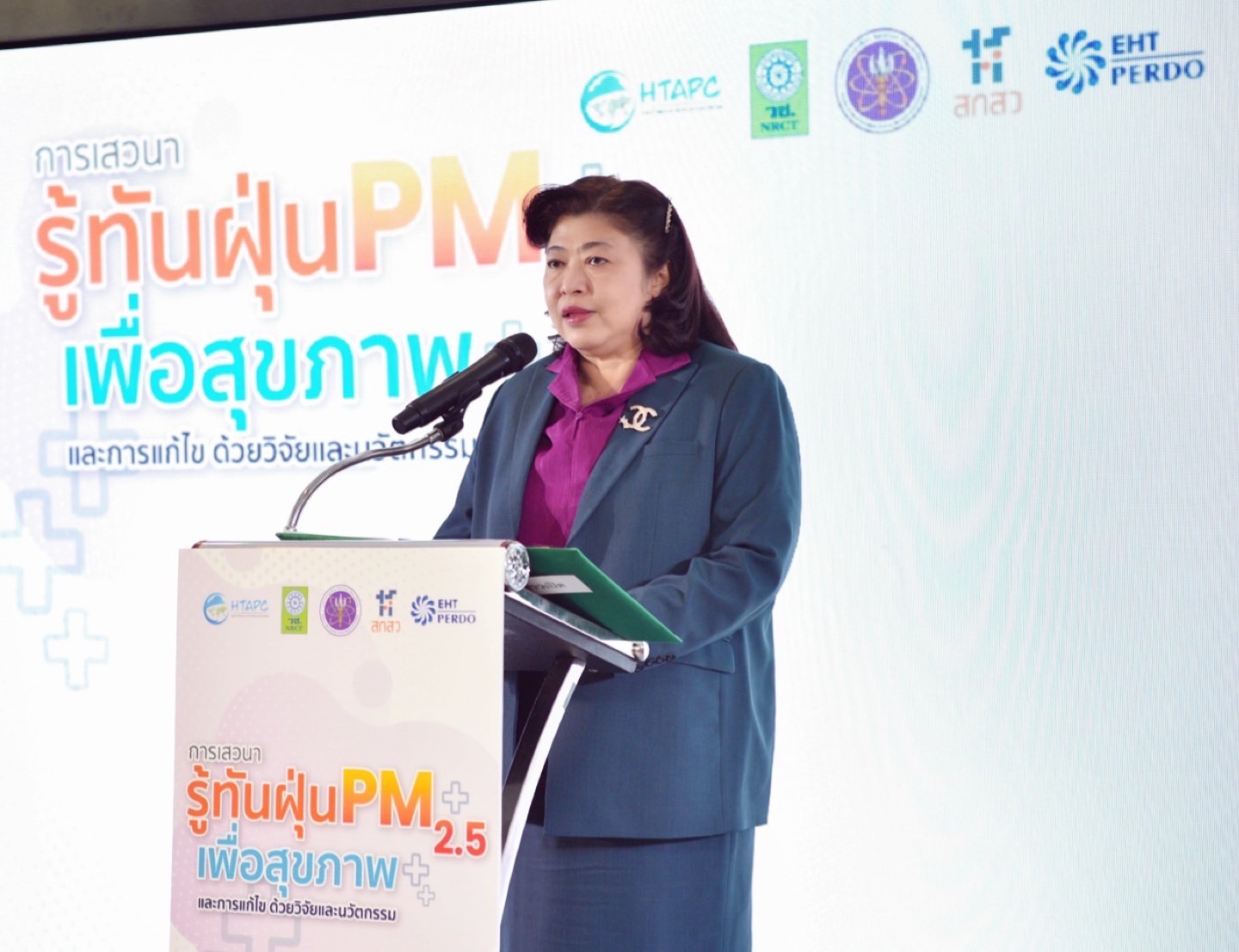 พร้อมกิจกรรมการเสวนา “รู้ทันฝุ่น PM2.5 เพื่อสุขภาพ และแก้ไข ด้วยวิจัยและนวัตกรรม” ผู้ทรงวุฒิผู้เชี่ยวชาญด้านมลพิษอากาศและภูมิอากาศ ได้ให้ความรู้เกี่ยวกับฝุ่น PM2.5 ว่า ฝุ่น PM2.5 เกิดขึ้นได้จากหลายปัจจัย ทั้งฝุ่นควันที่เกิดจากอุตสาหกรรมการผลิตผลิตภัณฑ์อุปโภคบริโภคต่าง ๆ ที่ต้องมีการปล่อยควัน ในกระบวนการผลิต ควันจากการเผาไหม้ในกิจกรรมในครัวเรือน เช่น การประกอบอาหาร การจุดธูปเทียน หรือแม้แต่ควันจากการสูบบุหรี่ ซึ่งมีโอกาสเกิดการเผาไหม้ ที่ไม่สมบูรณ์ ซึ่งเป็นสาเหตุหลักในการเกิดฝุ่น PM2.5 โดยผลกระทบฝุ่นละอองขนาดเล็ก PM2.5 ต่อสุขภาพ นั้น ค่าฝุ่น PM2.5 สูง ส่งผลกระทบต่อสุขภาพสะสมในระยะยาว ส่งผลต่อระบบผิวหนัง ระบบทางเดินหายใจ กระตุ้นภูมิแพ้, โรคหืด, โรคถุงลมโป่งพอง, มะเร็งปอด และภาวะอักเสบเรื้อรัง ดังนั้น ควรป้องกันการรับฝุ่น PM2.5 เข้าสู่ร่างกาย โดยเฉพาะกลุ่มเสี่ยงที่จะทำให้เกิดผลกระทบรุนแรง อาทิ กลุ่มผู้สูงอายุ ผู้ที่มีโรคประจำตัวเรื้อรัง เช่น โรคปอด, โรคหัวใจ ฯลฯ หญิงตั้งครรภ์ และเด็กอายุต่ำกว่า 10 ปี โดยงานวิจัยและนวัตกรรมจะสามารถเข้ามามีส่วนช่วยแก้ไขปัญหาผลกระทบจากฝุ่น PM2.5 ซึ่งประเทศไทยมีนวัตกรรมที่รองรับสำหรับการแก้ไขปัญหา ประกอบด้วย การจัดทำบัญชีการระบายมลพิษ การจัดทำแบบจำลองทางคณิตศาสตร์ เพื่อใช้ในการแก้ไขปัญหา PM2.5 และการกำหนดมาตรการในการลดฝุ่น PM2.5 จากแหล่งมลพิษต่าง ๆ