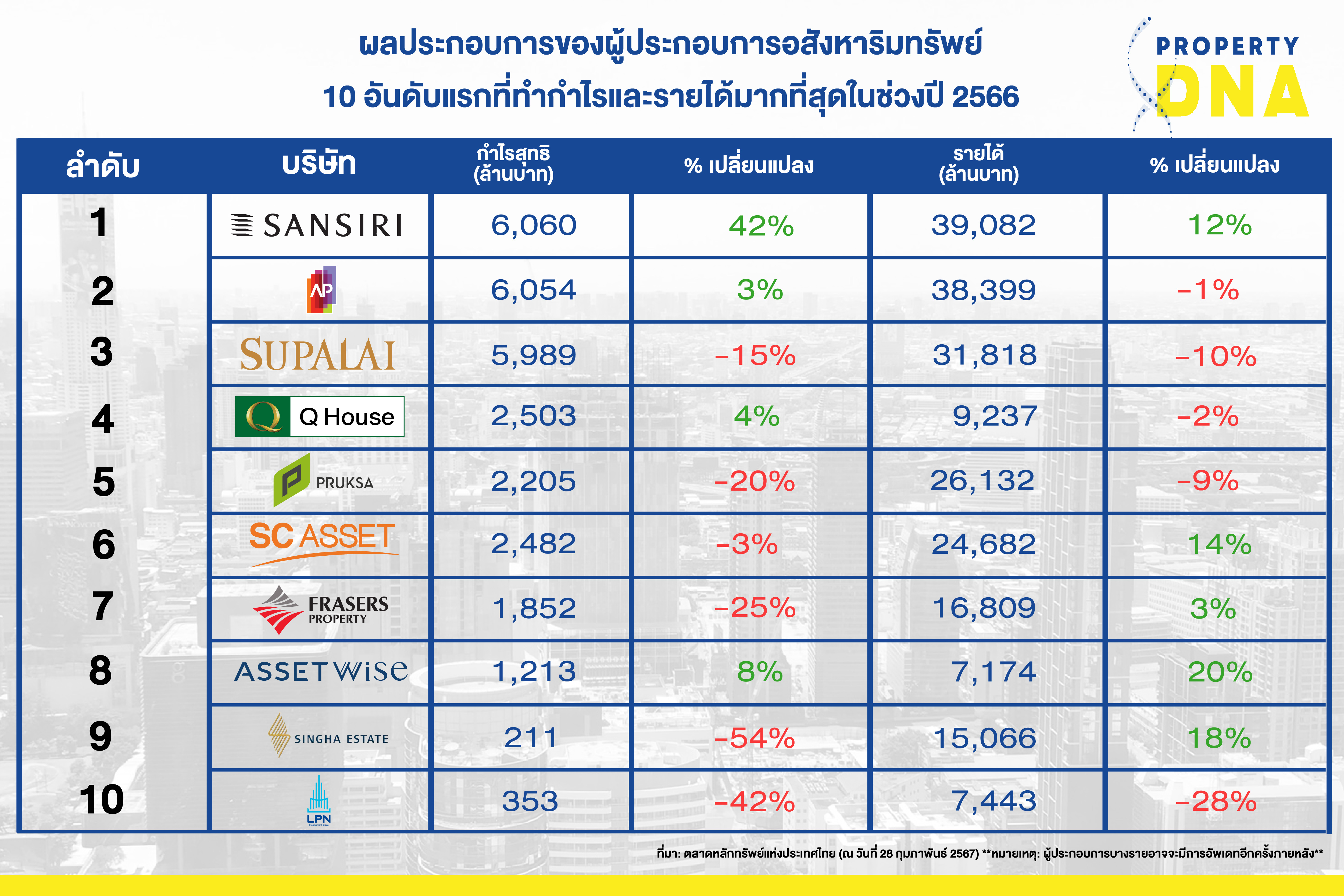แสนสิริเป็นผู้ประกอบการที่มีกำไรในปีพ.ศ.2566 มากที่สุด โดยมีกำไรที่ 6,060 ล้านบาทเพิ่มขึ้นประมาณ 42% เมื่อเทียบกับปีพ.ศ.2565 รายได้ของแสนสิริอยู่ที่ 39,082 ล้านบาทเพิ่มขั้นประมาณ 12% จากปีที่แล้ว เอพี (ไทยแลนด์) มีรายได้และกำไรเป็นอันดับที่ 2 คือ มีรายได้ 38,399 ล้านบาท ลดลงจากปีพ.ศ.2565 ประมาณ 1% กำไรที่ 6,054 ล้านบาทเพิ่มขึ้นประมาณ 3% ซึ่งทั้งแสนสิริ และเอพีในปีที่ผ่านมา นอกจากจะเปิดขายโครงการใหม่มากแล้ว ยังมีการโอนกรรมสิทธิ์ทั้งบ้าน และคอนโดมิเนียมต่อเนื่อง รวมไปถึงการเร่งปิดการขายโครงการที่สร้างเสร็จแล้ว พร้อมโอนกรรมสิทธิ์ นอกจากนี้โครงการราคาแพงของทั้ง 2 บริษัทยังได้รับการตอบรับที่ดีโดยเฉพาะแสนสิริที่หลายโครงการของพวกเขาปิดการขายได้ภายในระยะเวลาไม่นาน แม้ว่าราคาขายเริ่มต้นจะไม่ต่ำกว่า 20 ล้านบาทก็ตาม